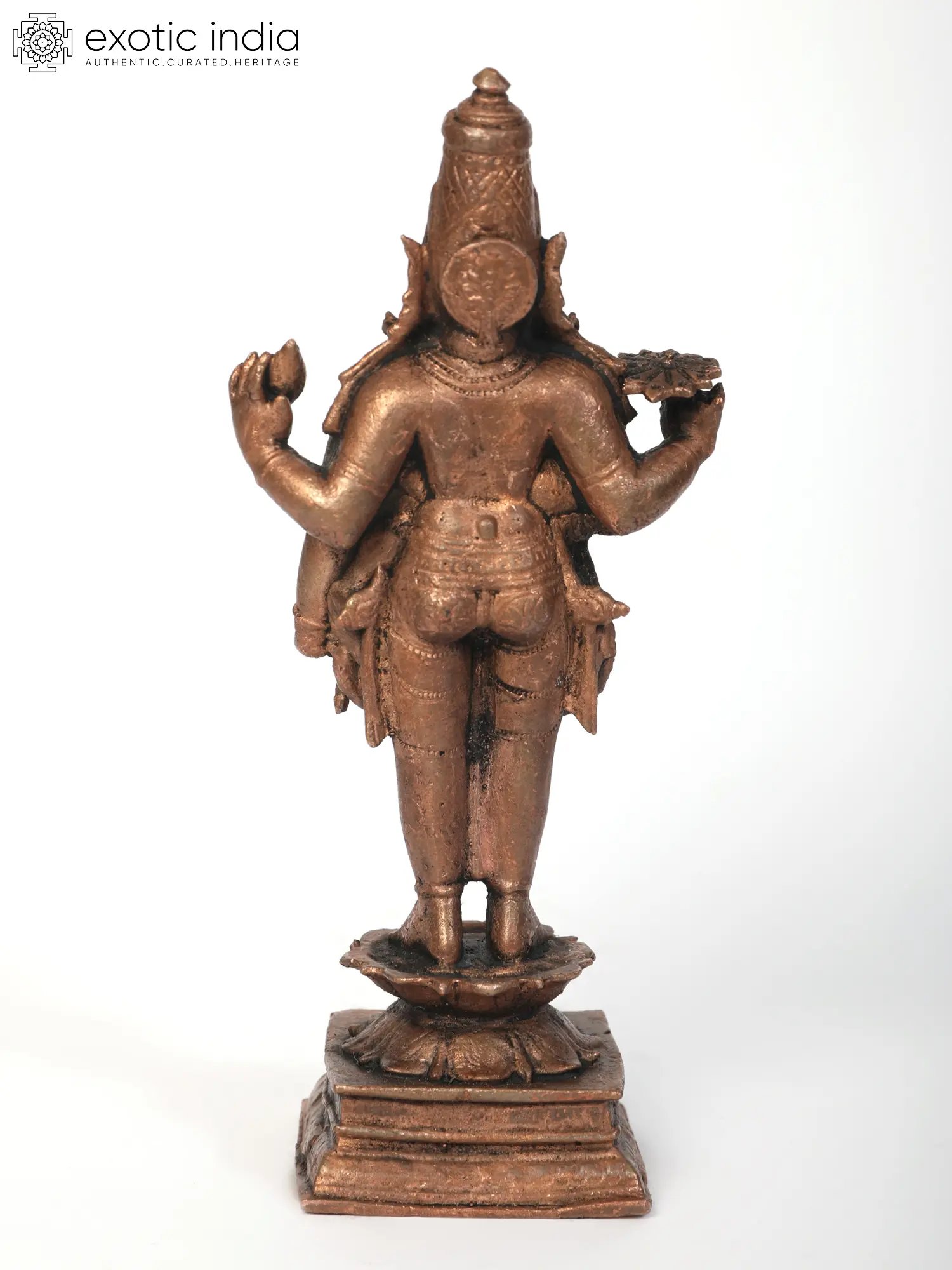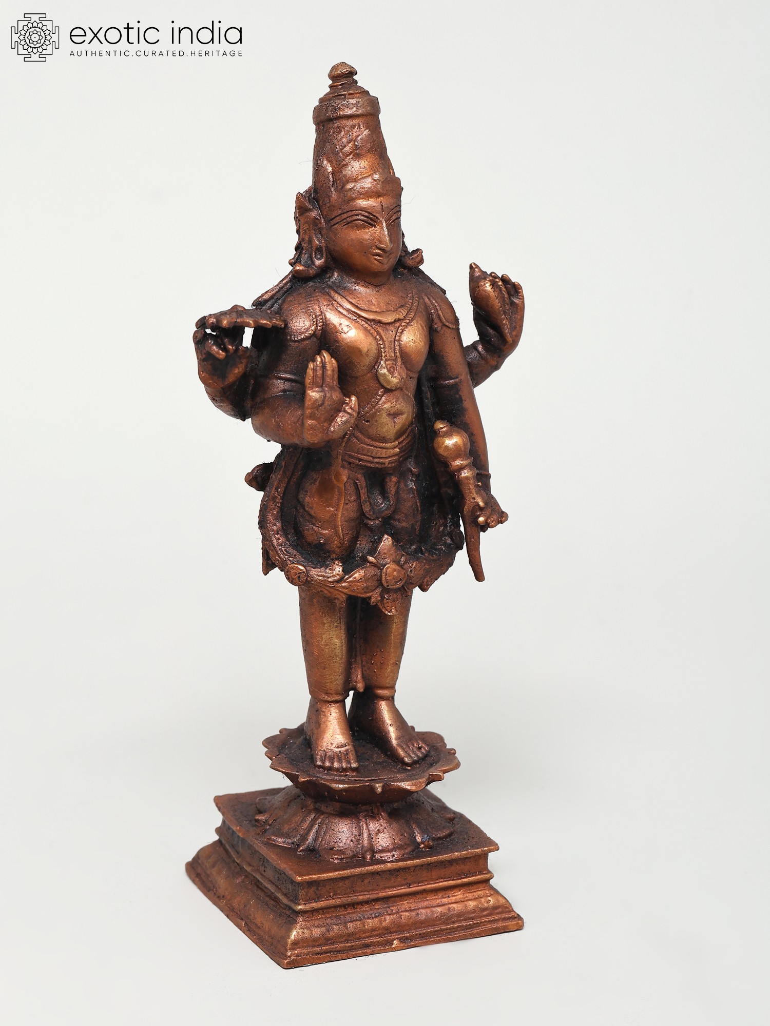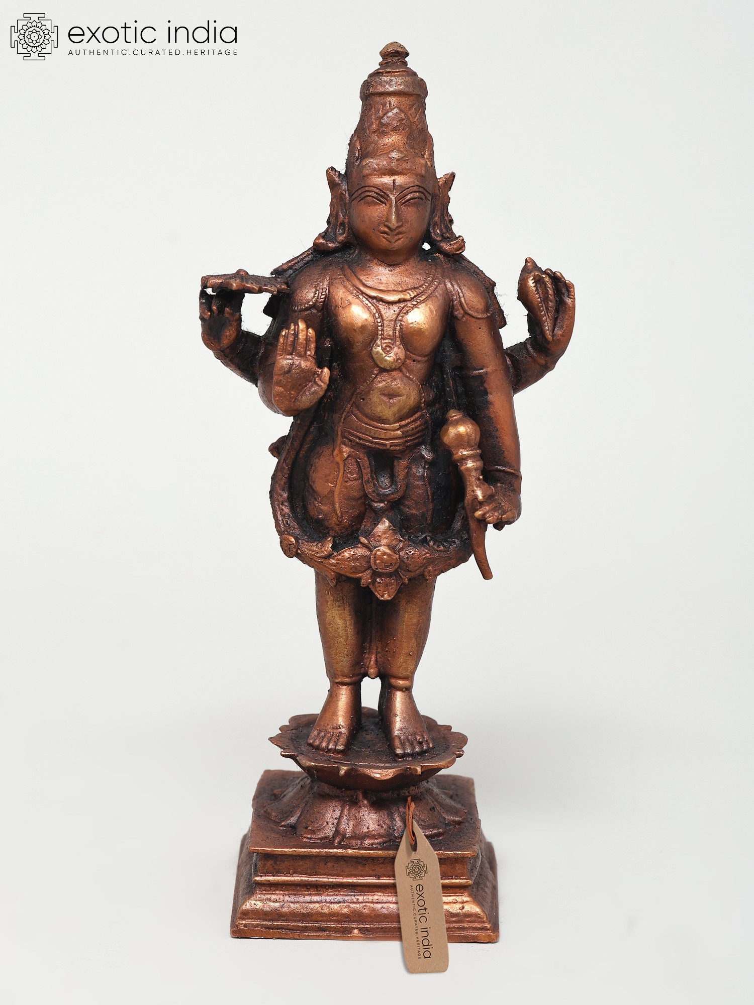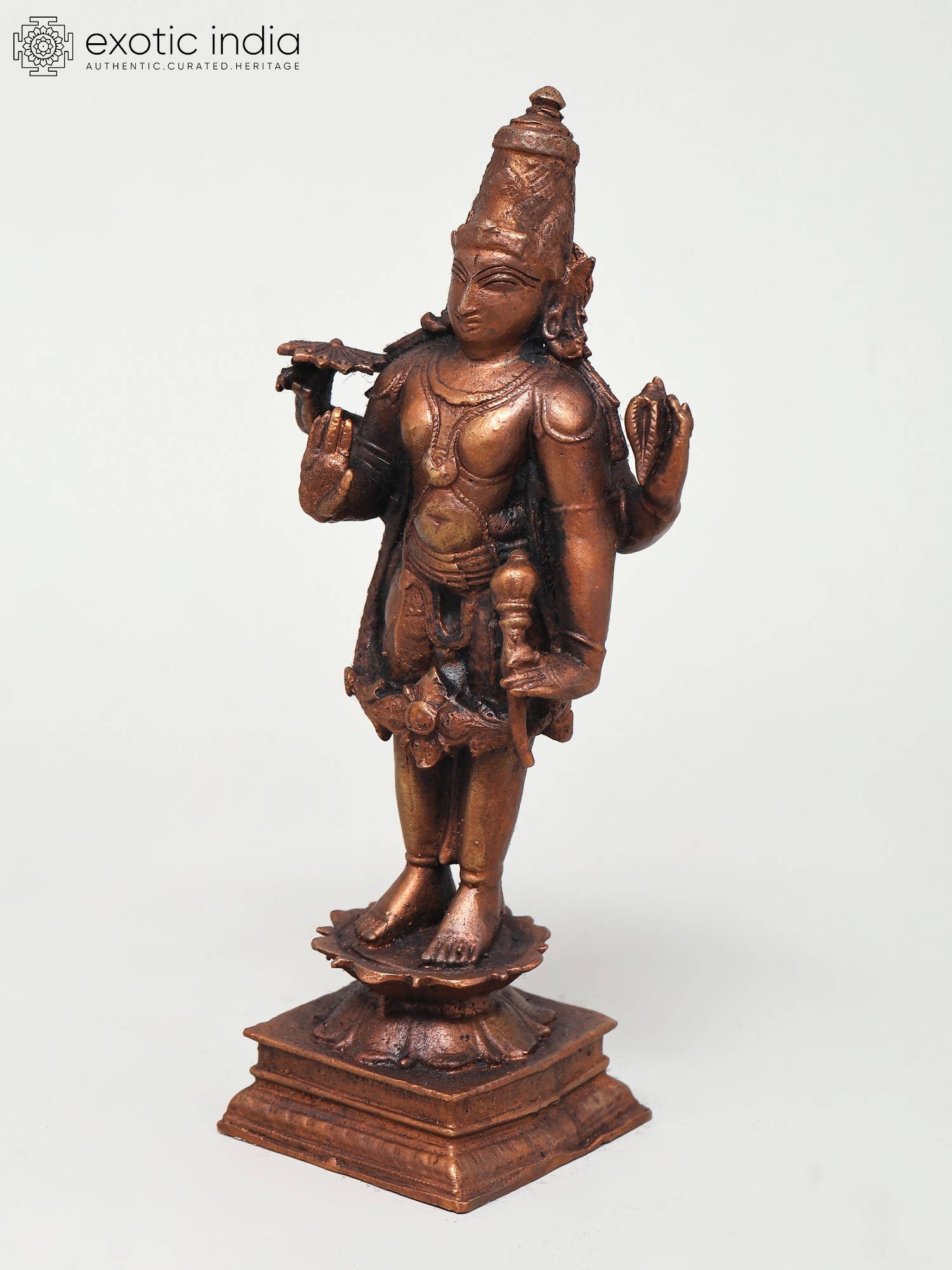 Smiling divinely, the great preserver Lord of Hinduism, Sri Vishnu is presented in this small copper statue in his popular form- Chaturbhuja (four-armed), standing upright and adorned regally. Vishnu wears an elongated crown called Kiritamukuta, Makara (a mythical creature) shaped earrings, delicate jewelry on his torso, and an ornate waistband with a floral band dangling in the front. Sri Vishnu stands on a pedestal shaped like a lotus or Padma, which is a symbol of the Universe or Srishti, which is balanced and nurtured by the powers of Vishnu.