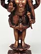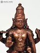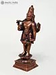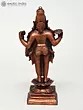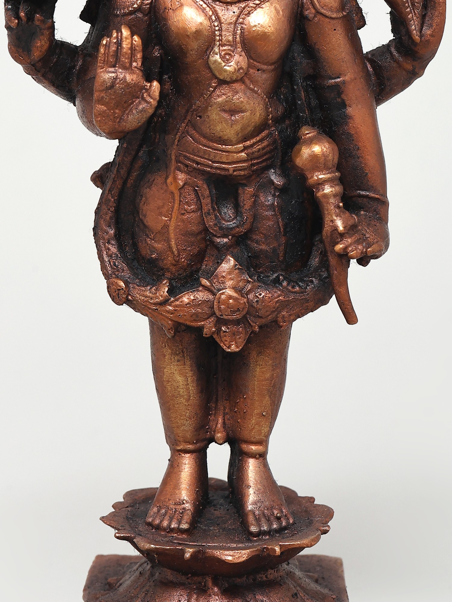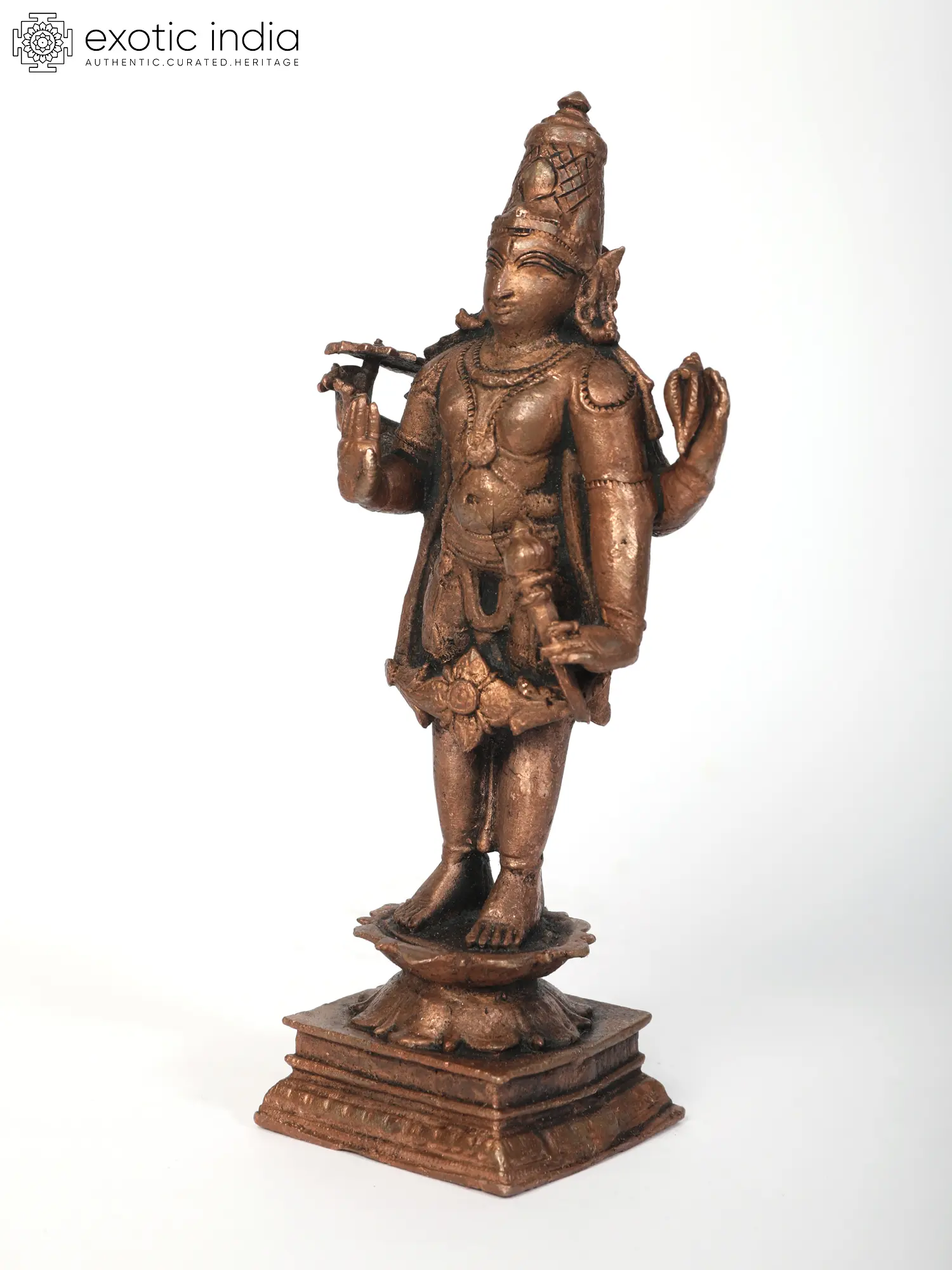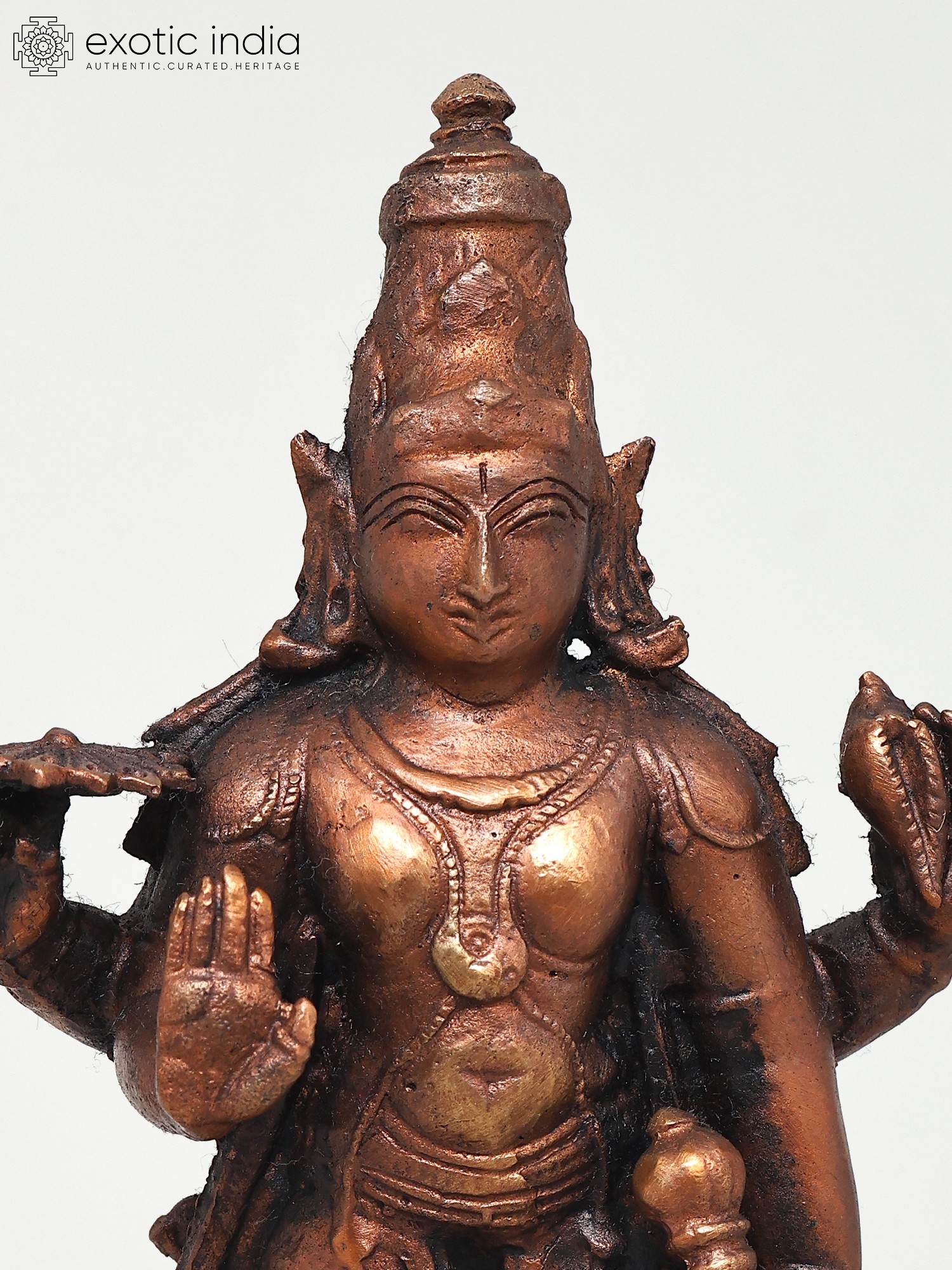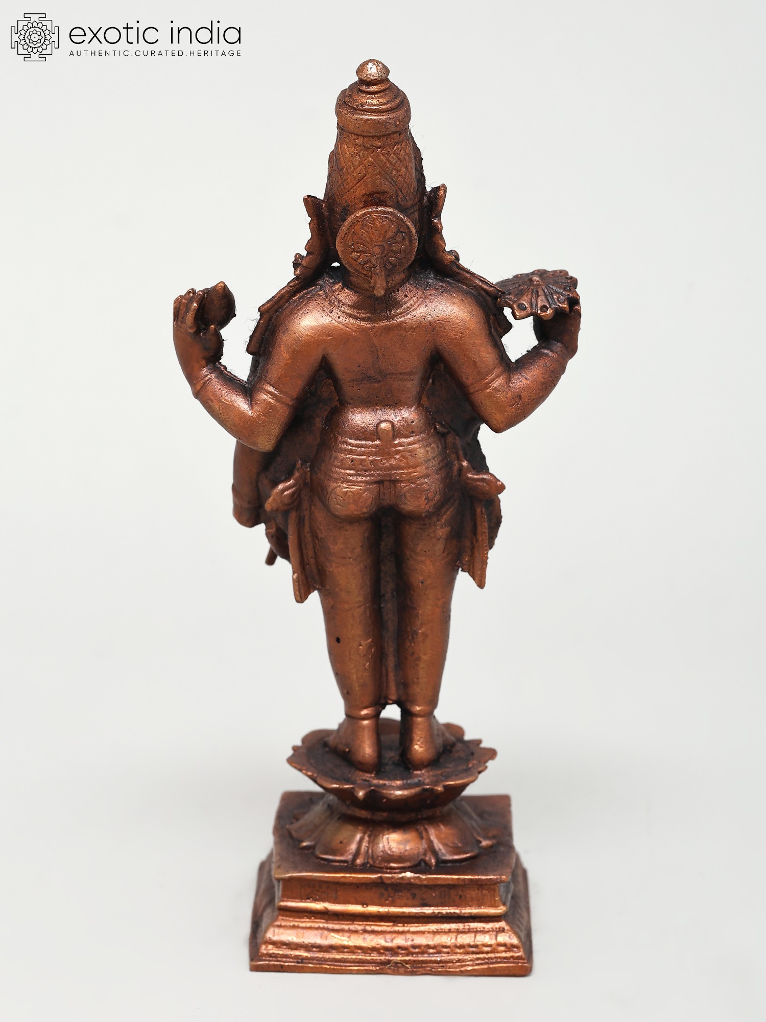Smiling divinely, the great preserver Lord of Hinduism, Sri Vishnu is presented in this small copper statue in his popular form- Chaturbhuja (four-armed), standing upright and adorned regally. Vishnu wears an elongated crown called Kiritamukuta, Makara (a mythical creature) shaped earrings, delicate jewelry on his torso, and an ornate waistband with a floral band dangling in the front. Sri Vishnu stands on a pedestal shaped like a lotus or Padma, which is a symbol of the Universe or Srishti, which is balanced and nurtured by the powers of Vishnu.
