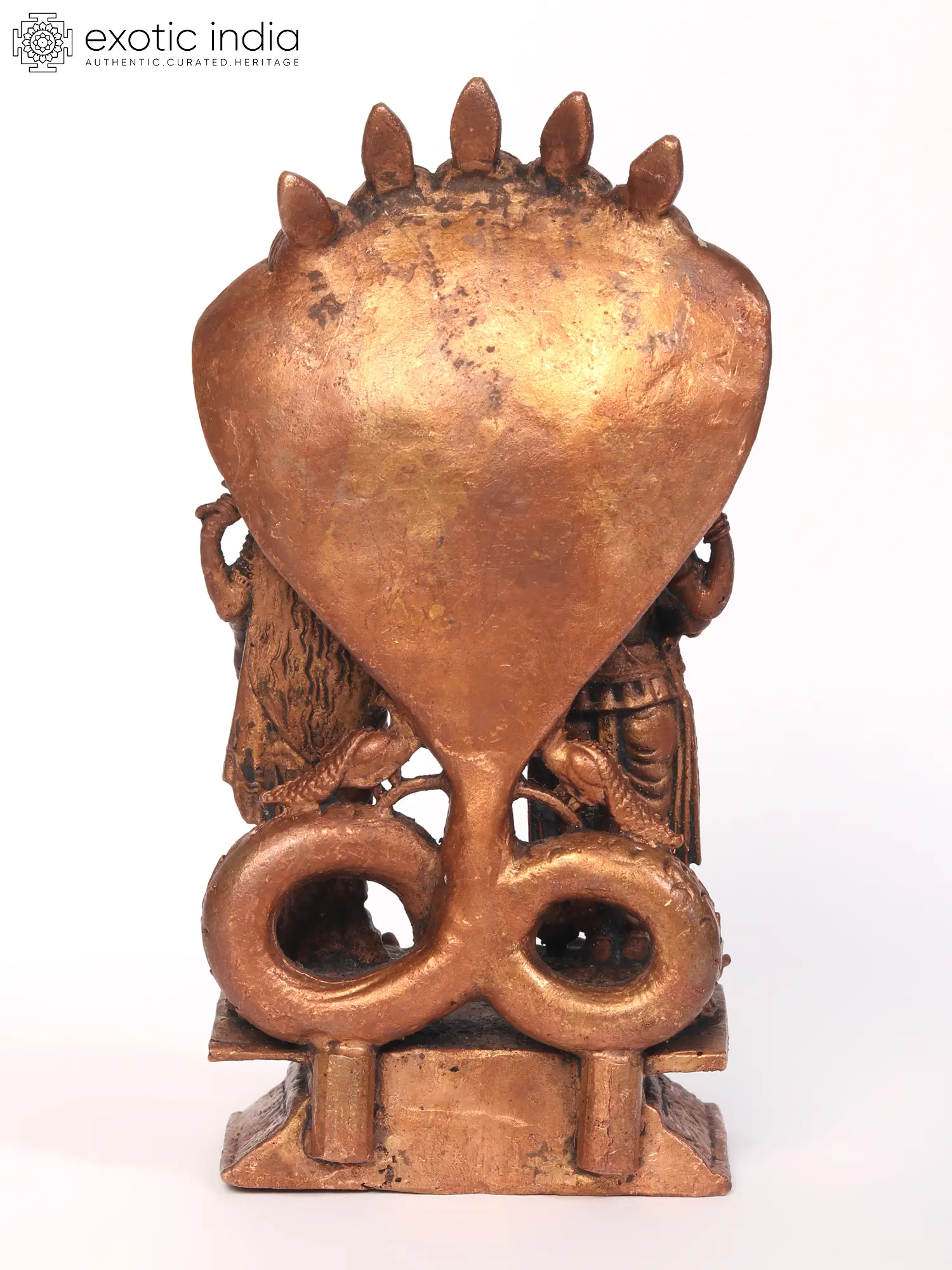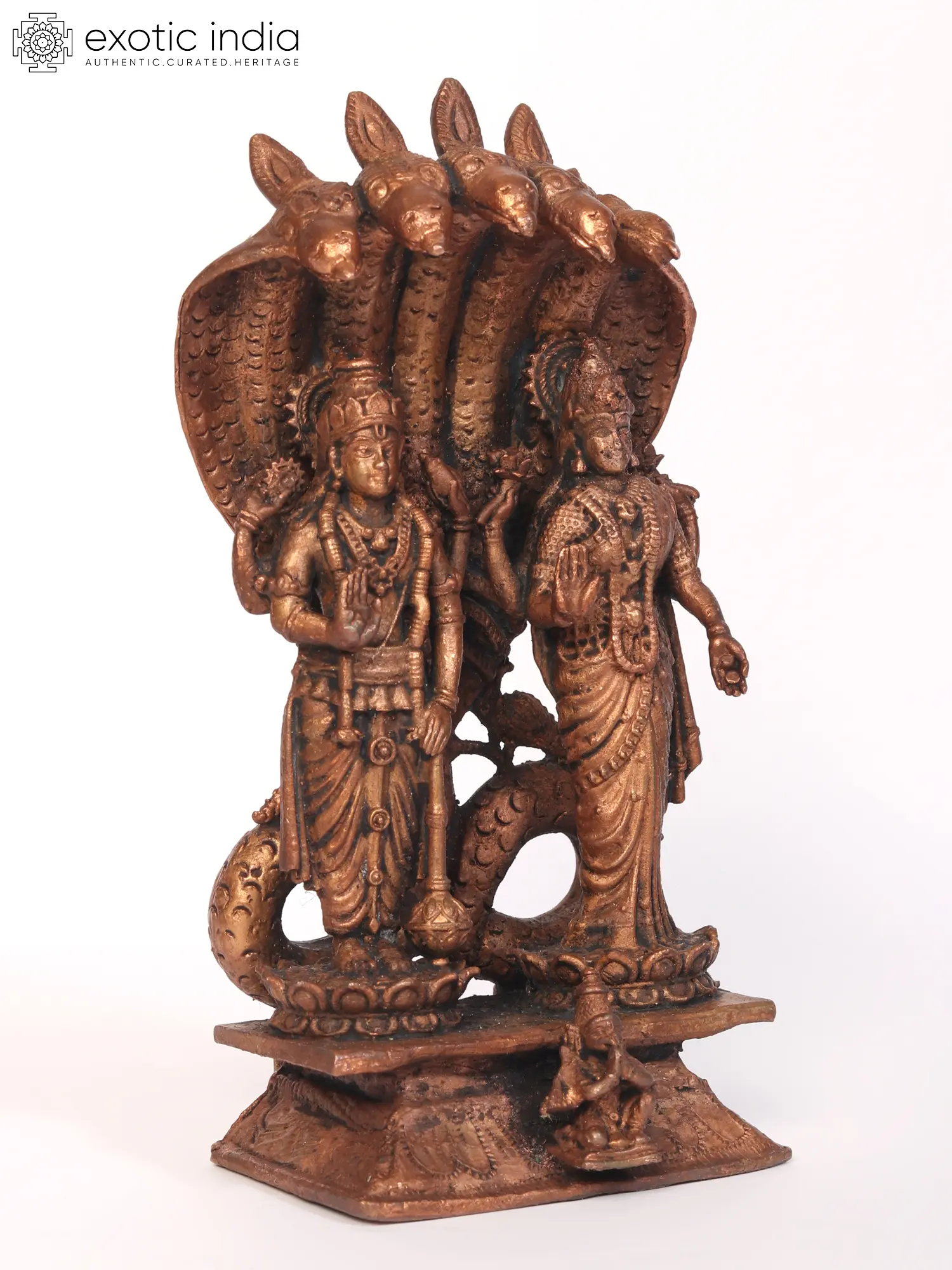 In this sacred copper rendition, divinity unfolds like a cosmic tapestry. Lord Vishnu, resplendent in his regal stance, stands alongside his beloved consort the goddess of wealth, Lakshmi, casting a celestial glow.