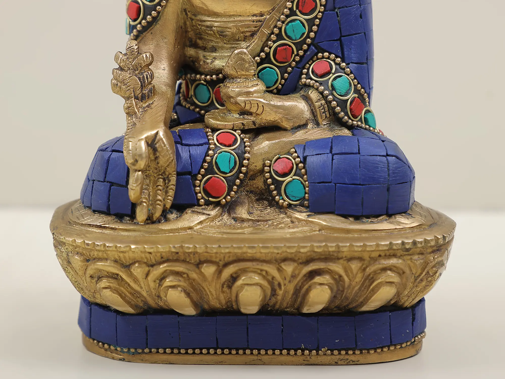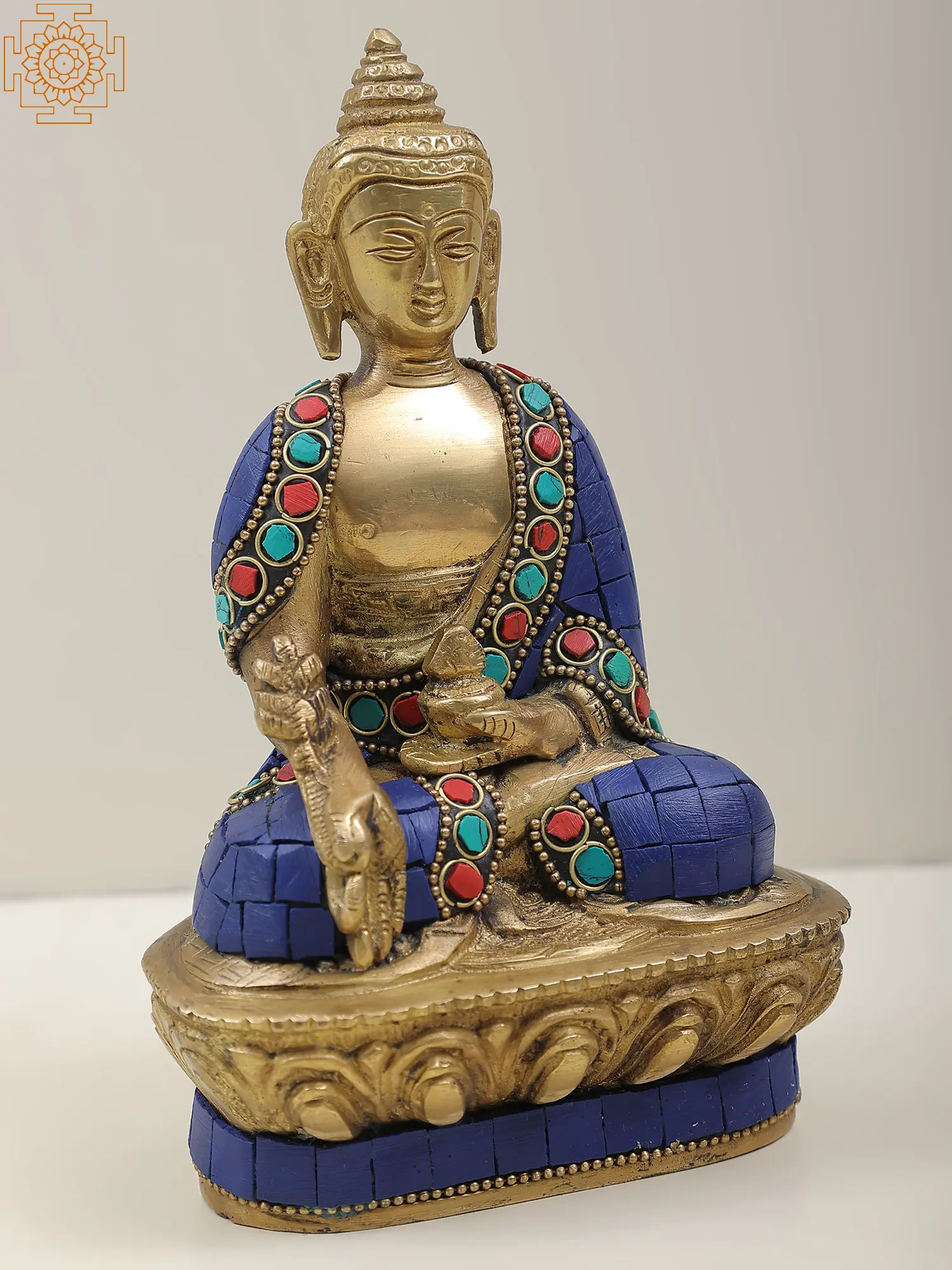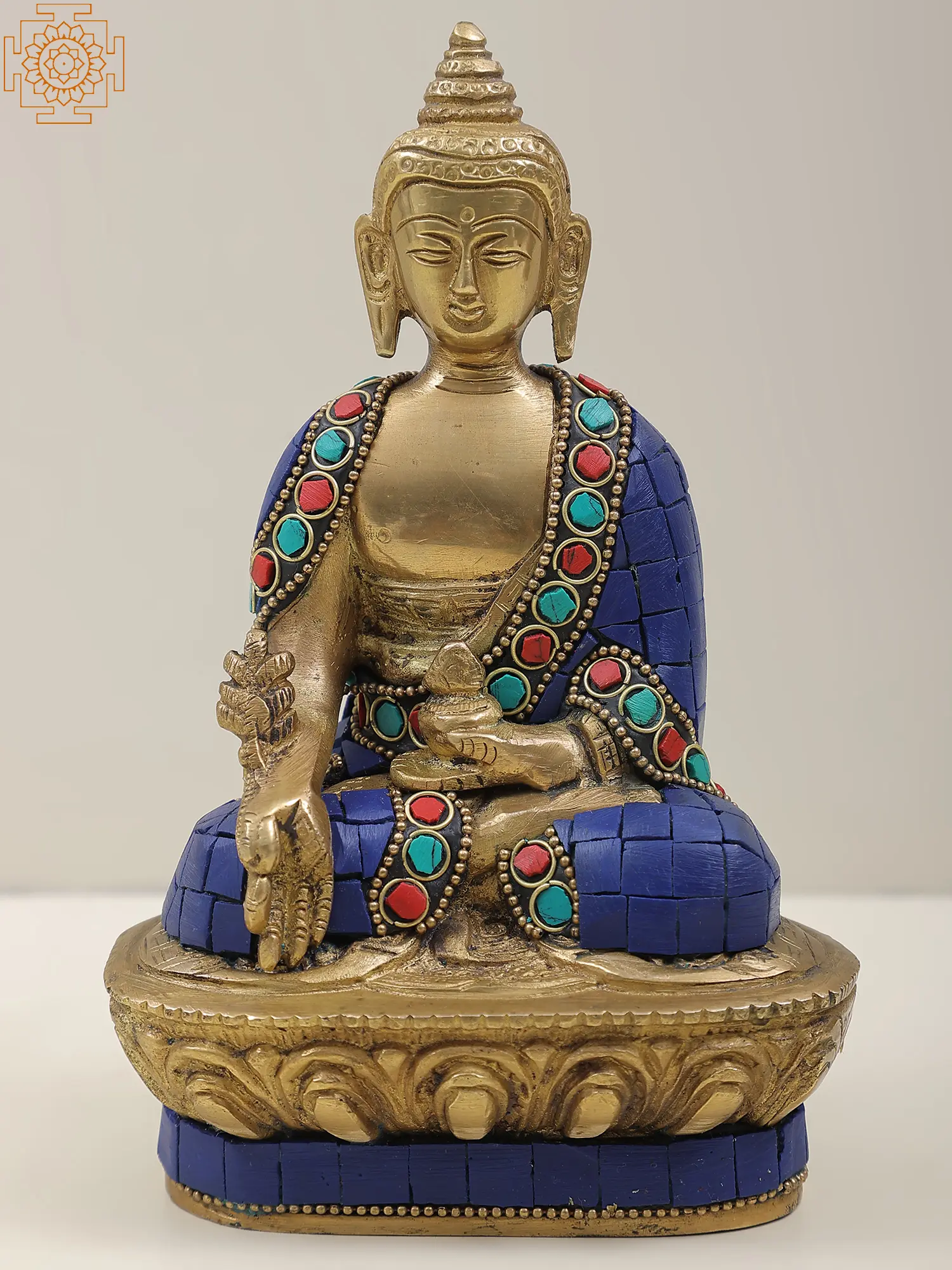 The Small Tibetan Buddhist Medicine Buddha graces brass with healing grace. Seated in meditation, his right-hand rests in the 'Abhaya mudra', banishing fear, while the left cradles a healing bowl, imbued with elixirs of compassion. His blue hue signifies boundless healing energy, his gaze an invitation to align our intentions with wellness. As the embodiment of perfect health, his presence becomes a sanctuary, whispering tales of transformation and renewal. Amidst life's trials, this brass art piece urges us to channel the Medicine Buddha's energy, healing ourselves and becoming vessels of healing for others."