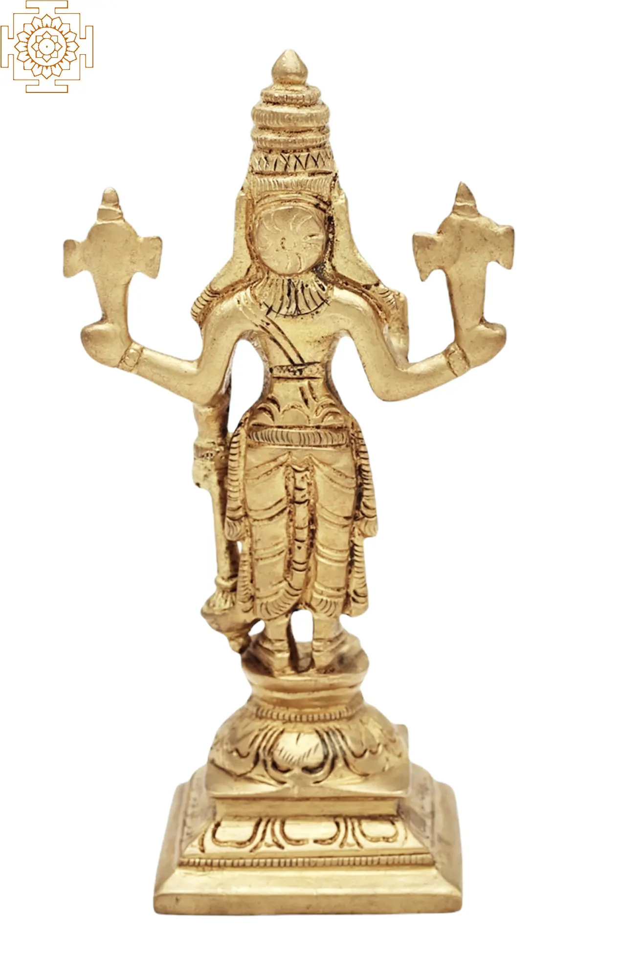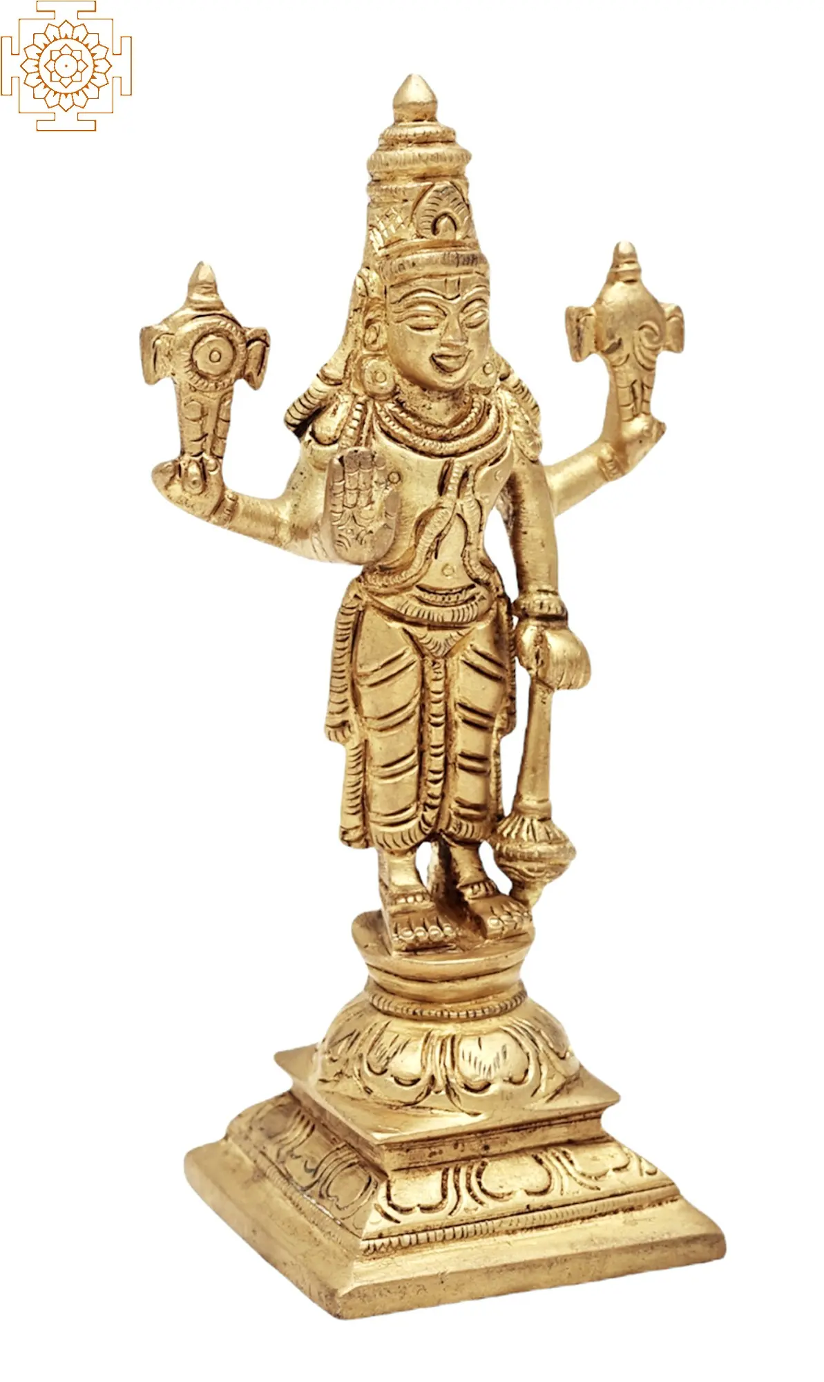 7" Superfine Chaturbhuja Lord Vishnu Idol Standing on Lotus with Wood Base| Brass Statue