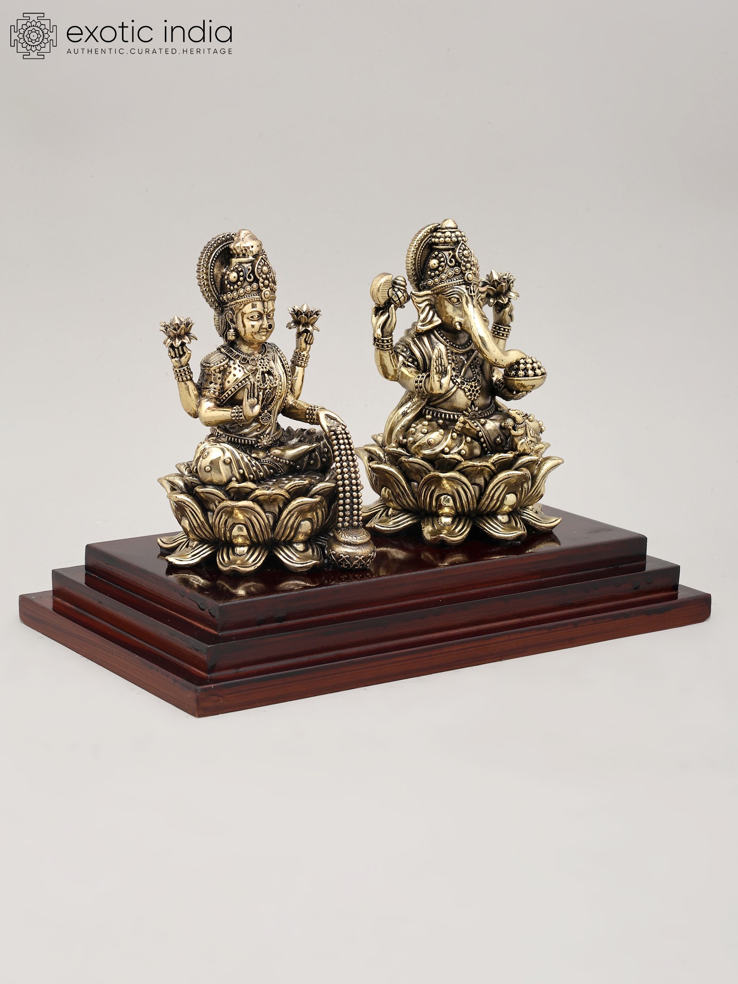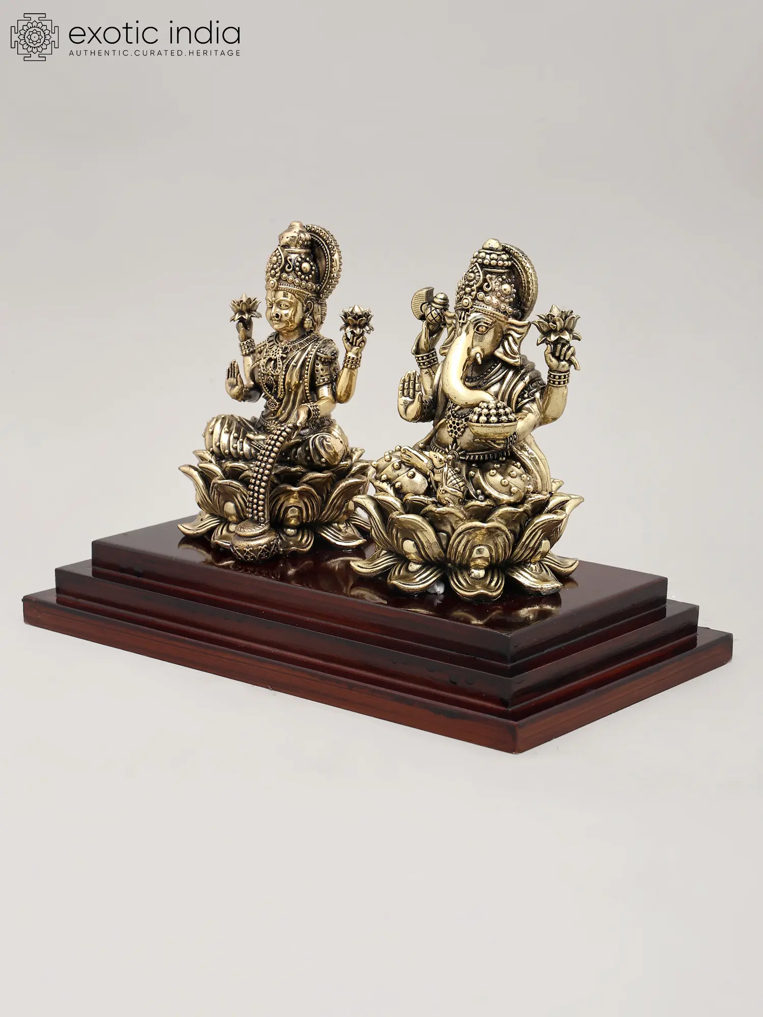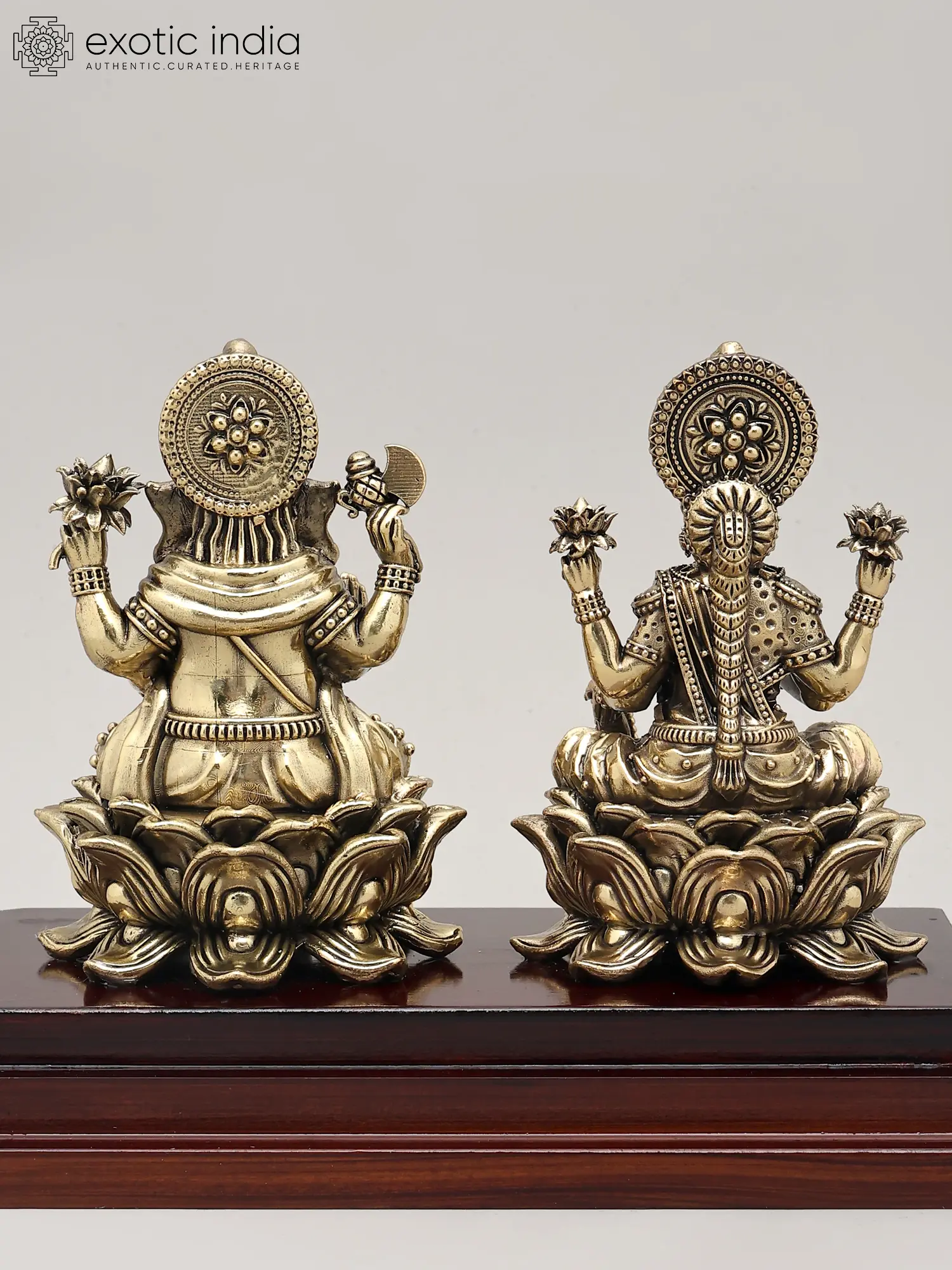 This divine pairing is rendered in superfine brass, a metal considered sacred and known for its durability and ability to hold intricate details. The meticulous craftsmanship brings to life the serene expressions and divine attributes of both deities. The sculptures are presented on a rich, polished wooden base, adding an element of elegance and stability to the entire piece. This sculpture is not merely an artifact but a tangible representation of deeply cherished spiritual beliefs and traditions, making it a perfect addition to any puja room, altar, or as a housewarming gift. Its presence is believed to radiate positive energy, inviting good fortune and harmony into your living space.