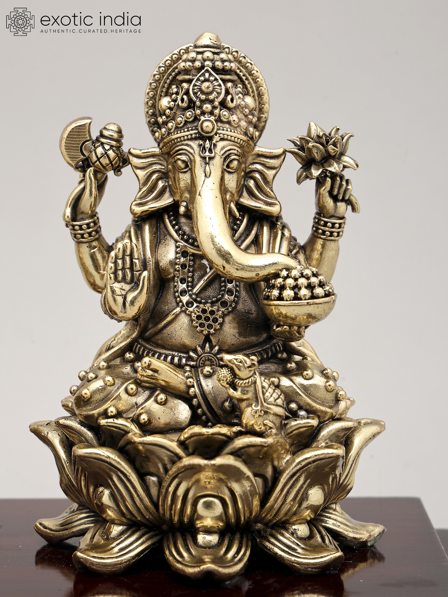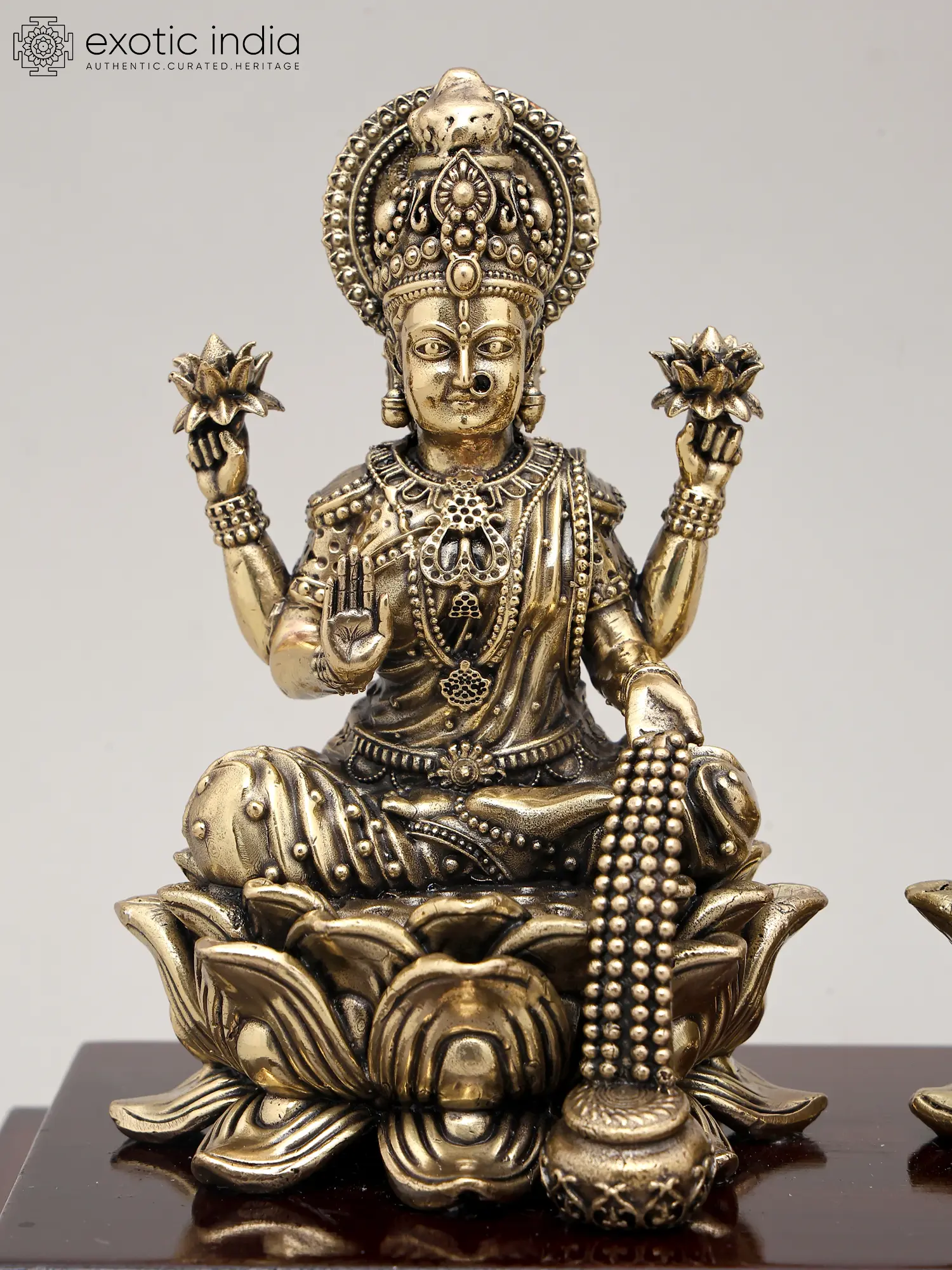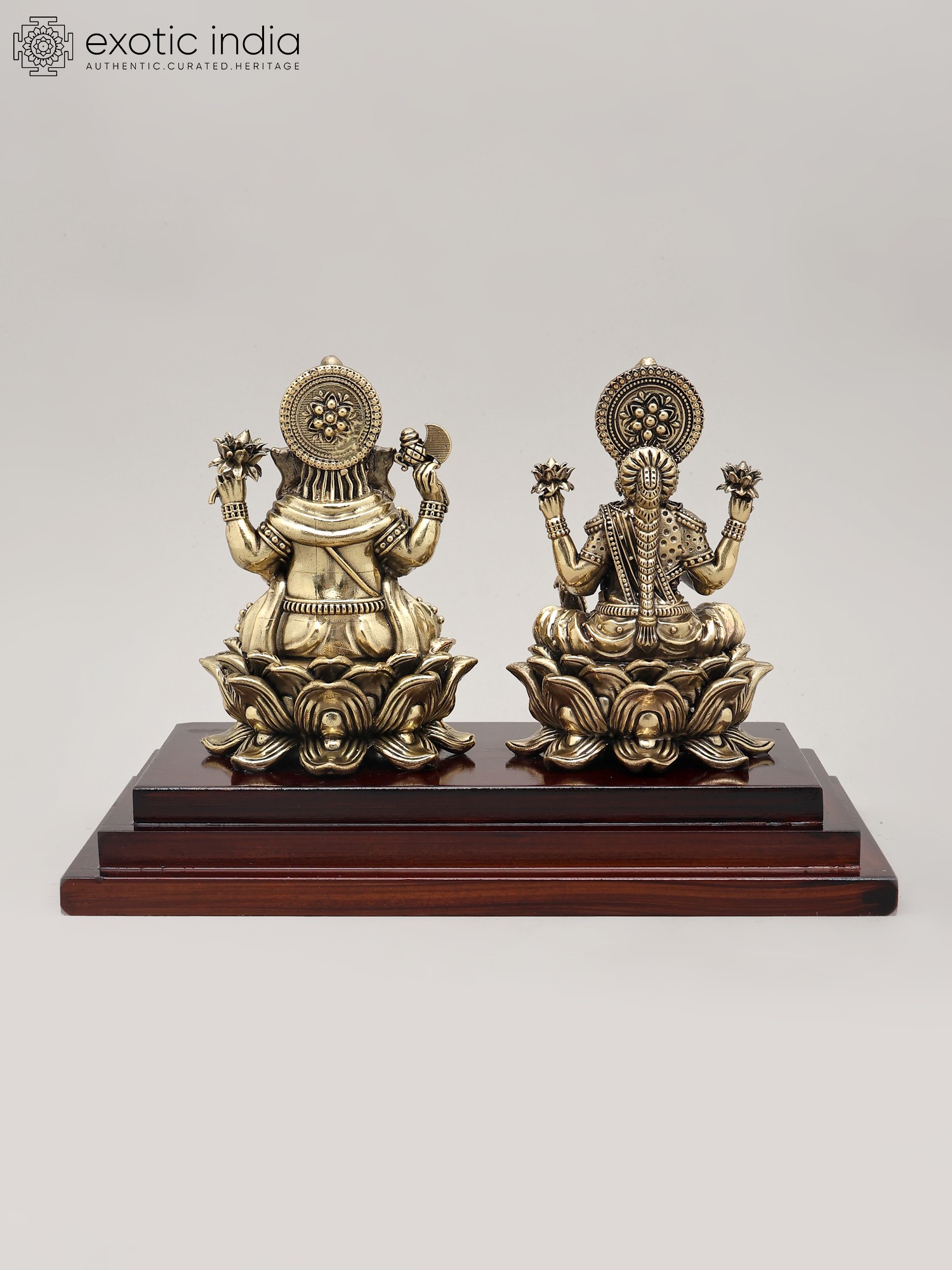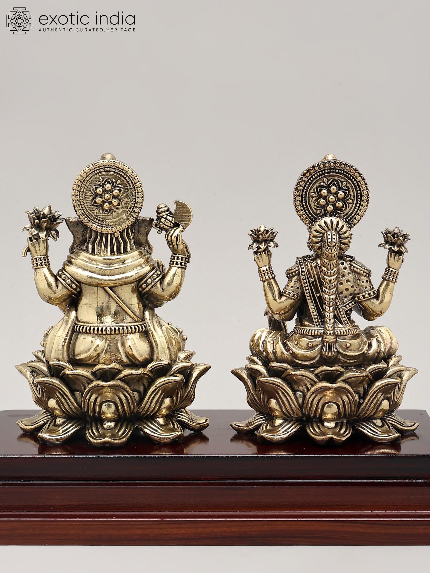 This divine pairing is rendered in superfine brass, a metal considered sacred and known for its durability and ability to hold intricate details. The meticulous craftsmanship brings to life the serene expressions and divine attributes of both deities. The sculptures are presented on a rich, polished wooden base, adding an element of elegance and stability to the entire piece. This sculpture is not merely an artifact but a tangible representation of deeply cherished spiritual beliefs and traditions, making it a perfect addition to any puja room, altar, or as a housewarming gift. Its presence is believed to radiate positive energy, inviting good fortune and harmony into your living space.