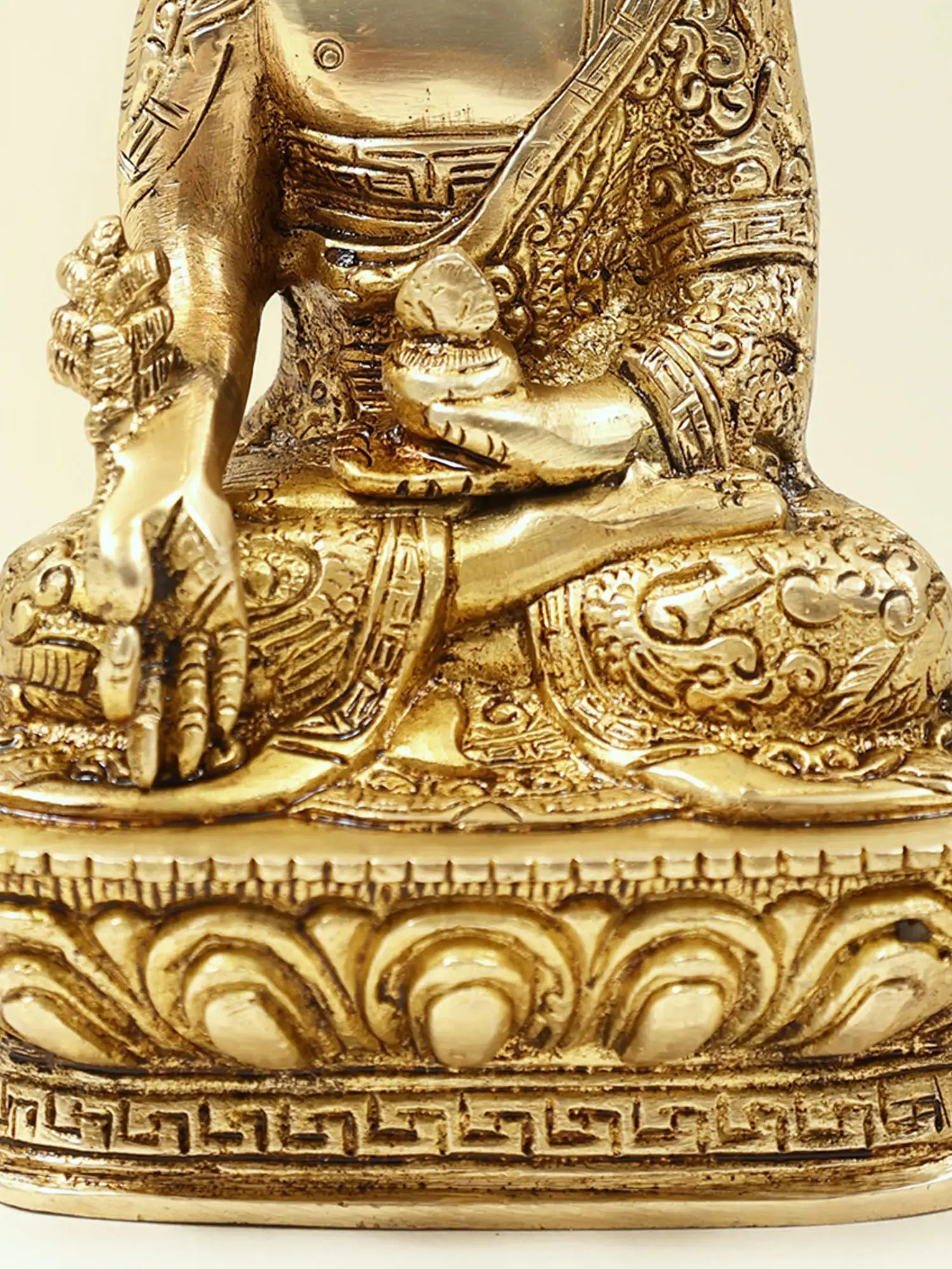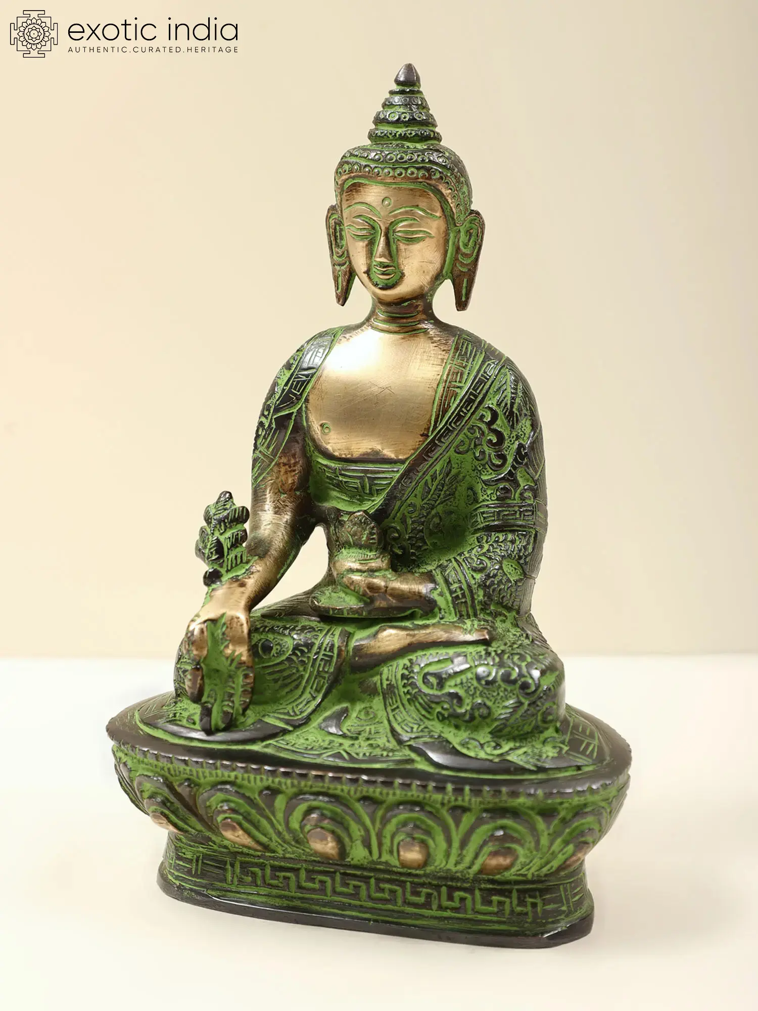 Brought to you in premium brass is the divine Bhaishajyaguru, also known as the Medicine Buddha, adorned with robes decorated with auspicious symbols. This stunning representation beautifully captures the healing and compassionate essence of the Medicine Buddha. Bhaishajyaguru is revered as the embodiment of healing energy and compassion. Devotees invoke his blessings for physical and spiritual well-being, as he is believed to possess the power to heal all ailments and alleviate suffering.