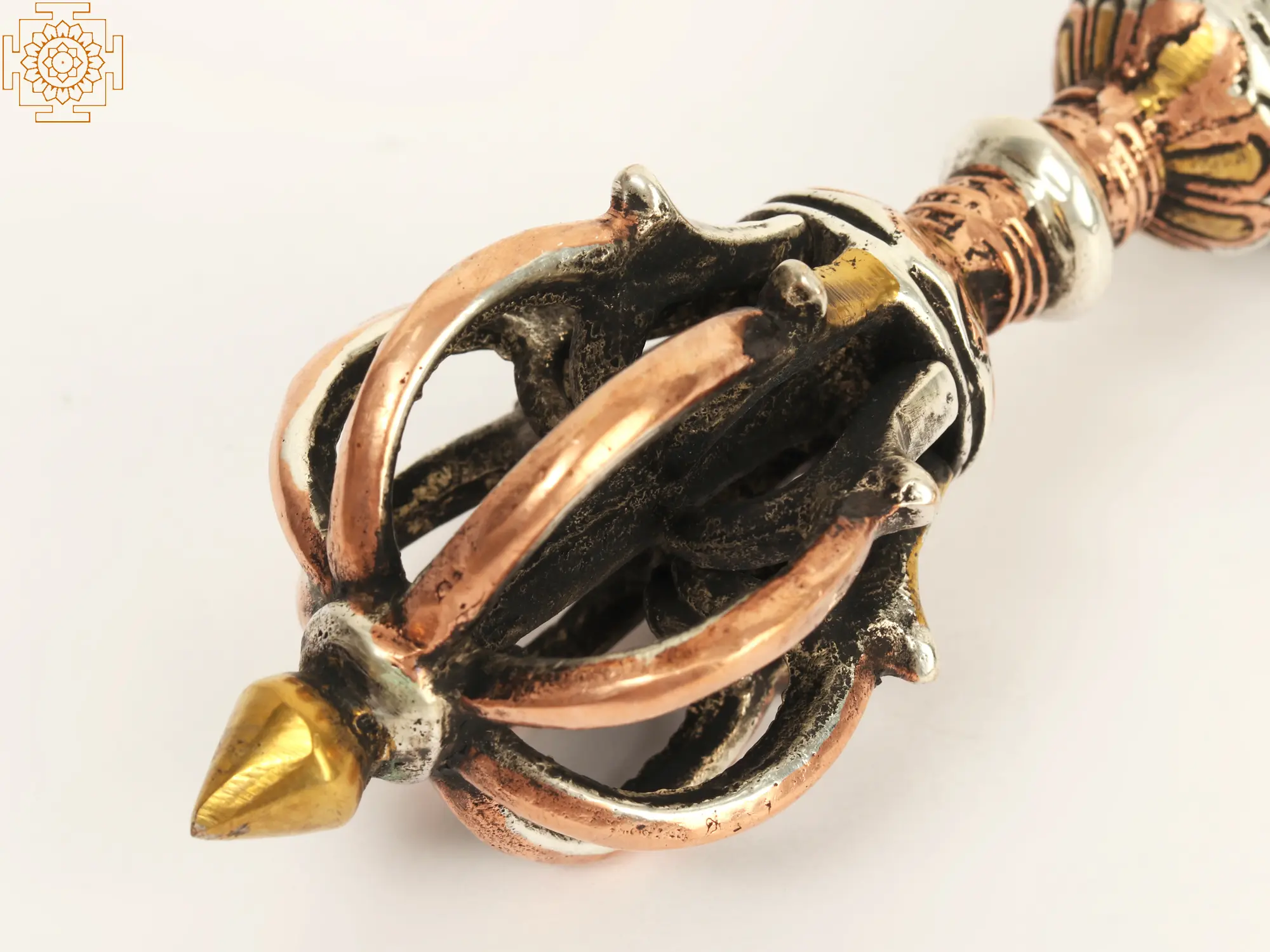 This magnificent Tibetan Buddhist Dorje, meticulously crafted in brass and copper, symbolizes spiritual significance and power in the Tibetan Buddhist tradition. In Tibetan Buddhism, the Dorje, also known as the Vajra, holds immense spiritual importance. It symbolizes the indestructible and unyielding nature of enlightenment and spiritual awakening. The word "Vajra" itself means "diamond" or "thunderbolt," signifying its unshakable strength. This Dorje, crafted with precision and devotion, combines the regal essence of brass and the warm radiance of copper. The blades of the Vajra, made from copper, exude strength, while the tip in brass resonates with the purity of intention. The lotus symbol at its heart adds an extra layer of spiritual depth. This Dorje, with its fusion of brass and copper and adorned with the lotus symbol, embodies the enduring spiritual strength and enlightenment of Tibetan Buddhism.