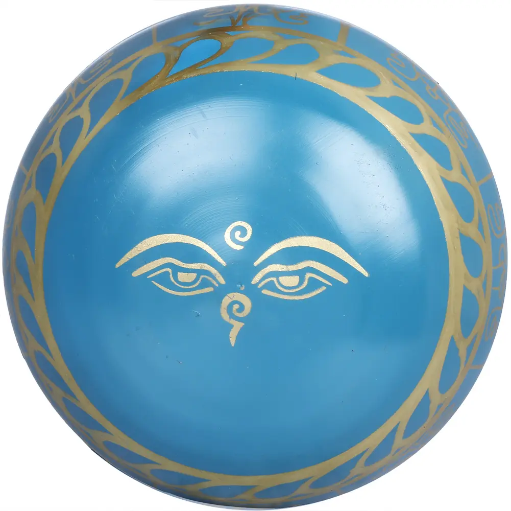 Complementing the sacred ensemble is the Ashtamangala Singing Bowl, a vessel of healing resonance crafted from the same brass medium. Its serene blue color, reminiscent of vast spiritual realms, resonates harmoniously with the golden accents that trace patterns of sacred significance. As your fingers trace the bowl's rim, a gentle, melodious song emerges, filling the air with a reverberating calm that transcends time and space, echoing the vibrations of ancient mantras.