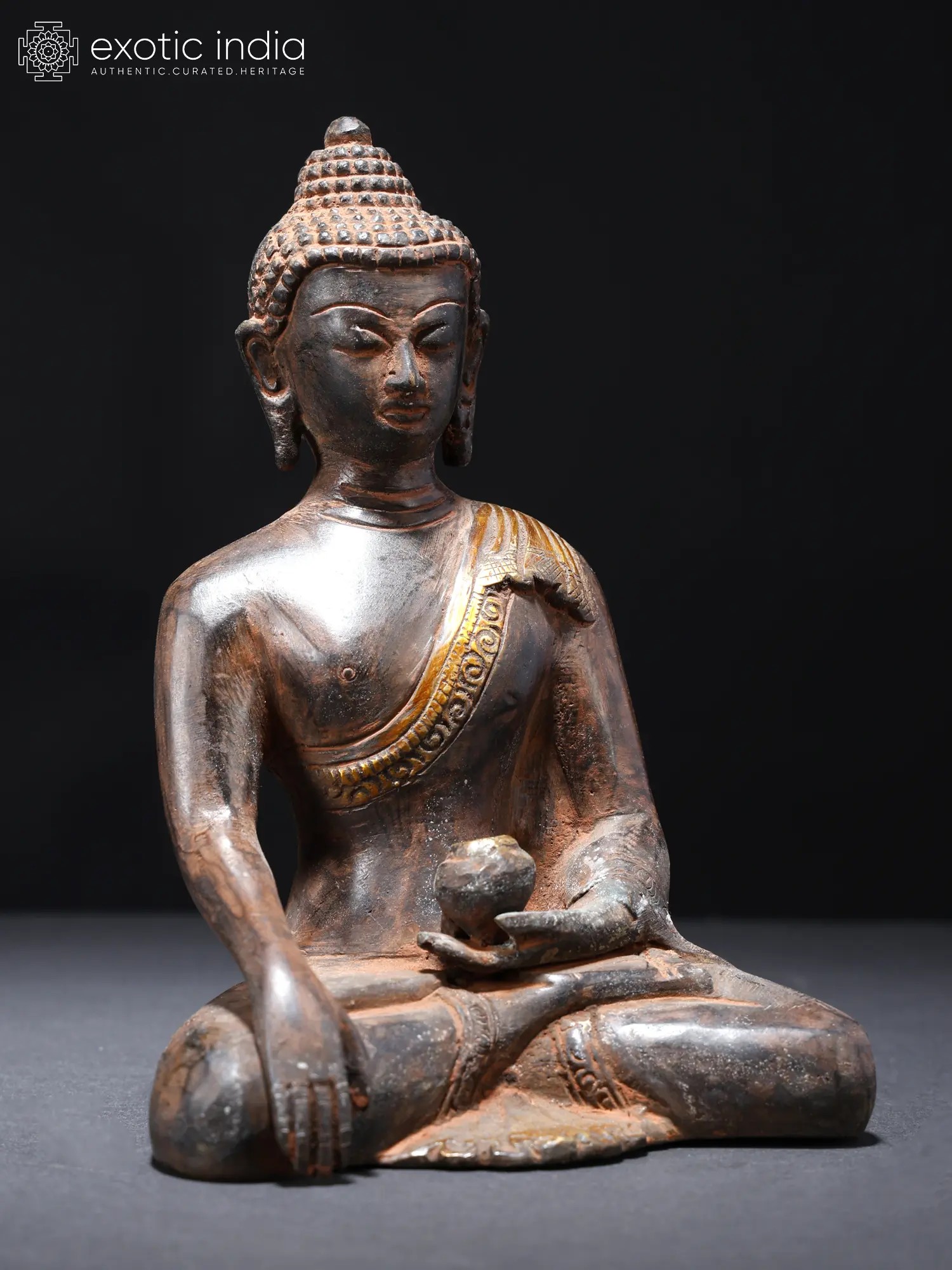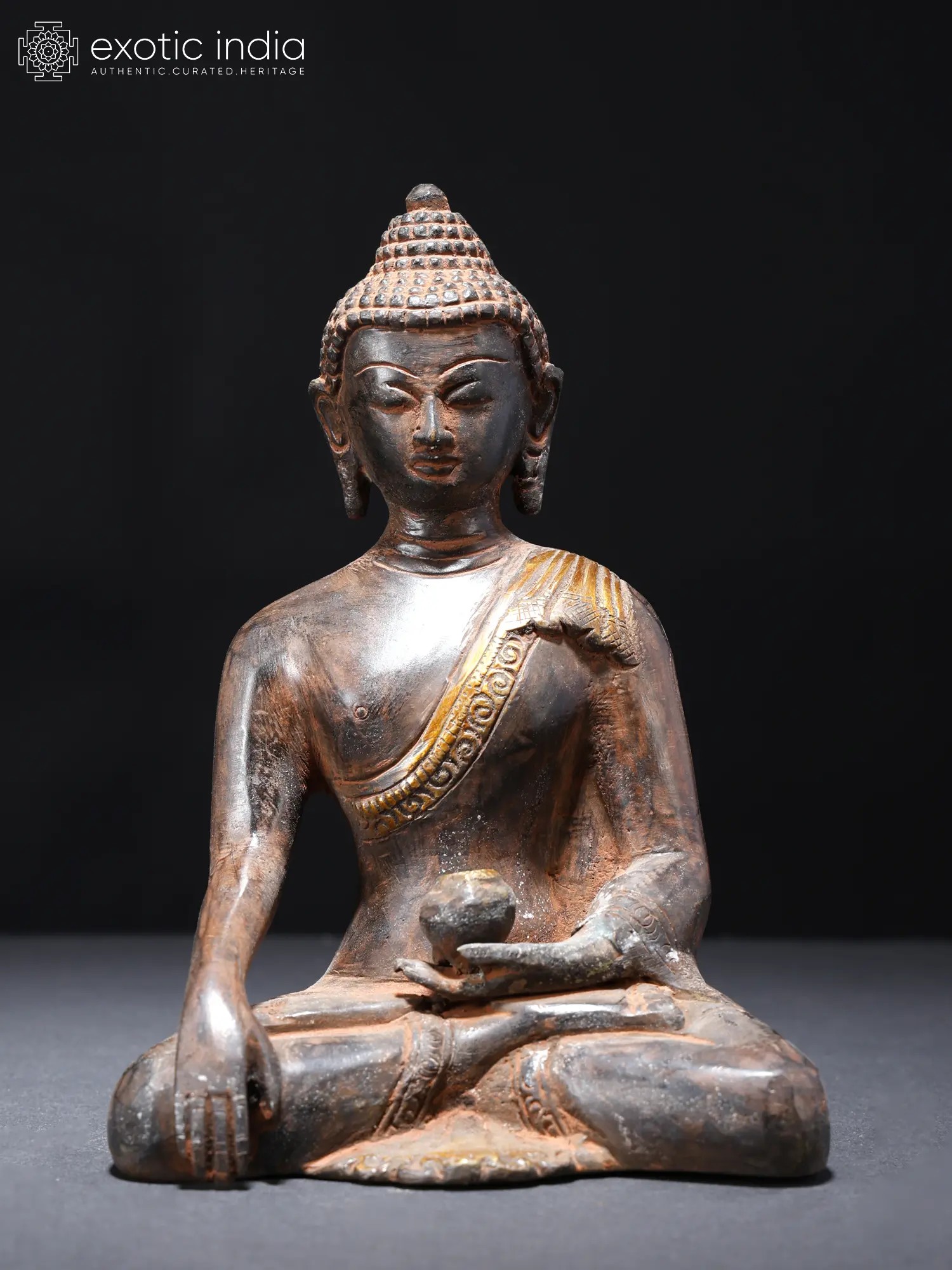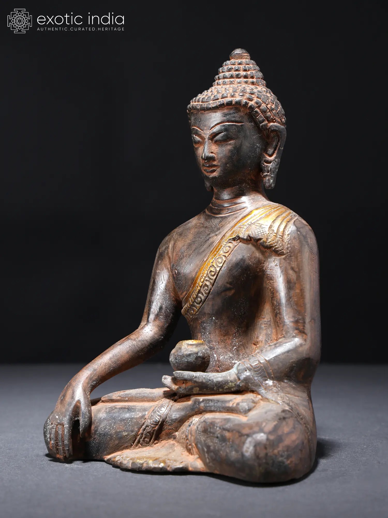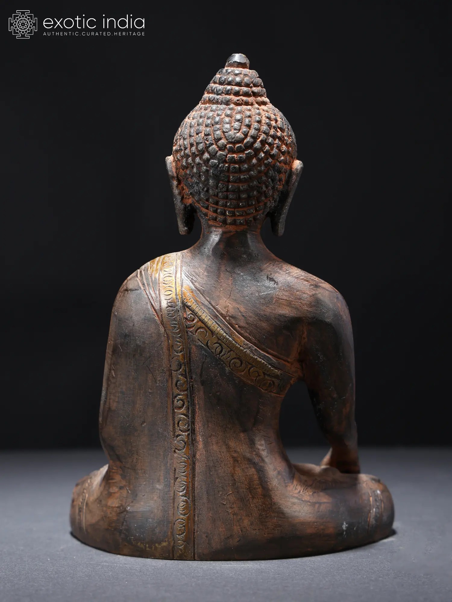 In this sculpture, Lord Buddha (the awakened one) is seated cross legged with his right hand Bhumisparsha Mudra (Earth touching gesture), symbolising his enlightenment and the moment when he called the goddess earth as his witness. Serene and composed, he is depicted wearing simple robes, with closed eyes in deep meditation. His left hand is resting on his lap, carrying a bowl of healing. It is a potent illustration of Lord Buddha’s spiritual development and serves as a guide towards the path of enlightenment.