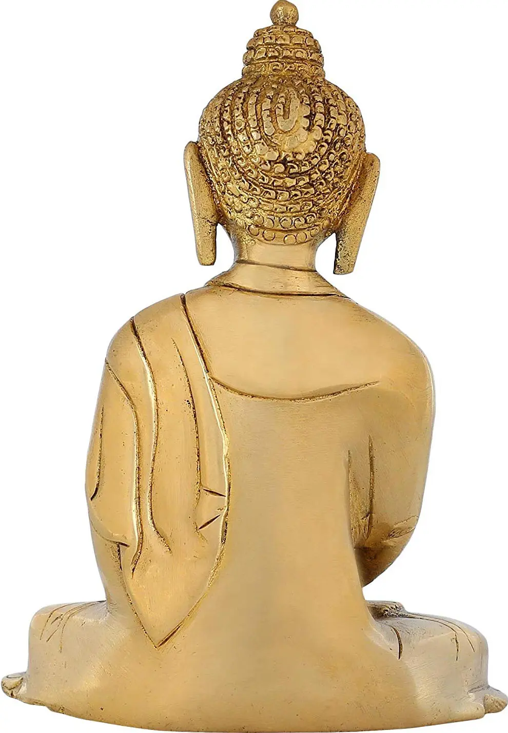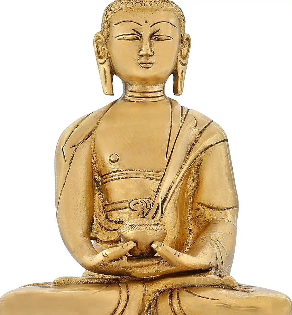 Seated in a cross-legged position (diamond posture), with closed eyes, Lord Buddha (the awakened) symbolizes inner reflection and enlightenment. His tightly curled hair signifies his renunciation of worldly pleasures, while the elongated earlobes represent his rejection of material desires. Carrying an alms bowl, Lord Buddha embodies humility and compassion, reminding devotees of the importance of giving and receiving with grace. This portrayal invites you to embark on a journey of self-discovery, finding peace within and embracing the path to enlightenment. Crafted in brass, this statue exudes an eternal charm. Invite the spiritual essence into your space with this revered emblem of wisdom and compassion.