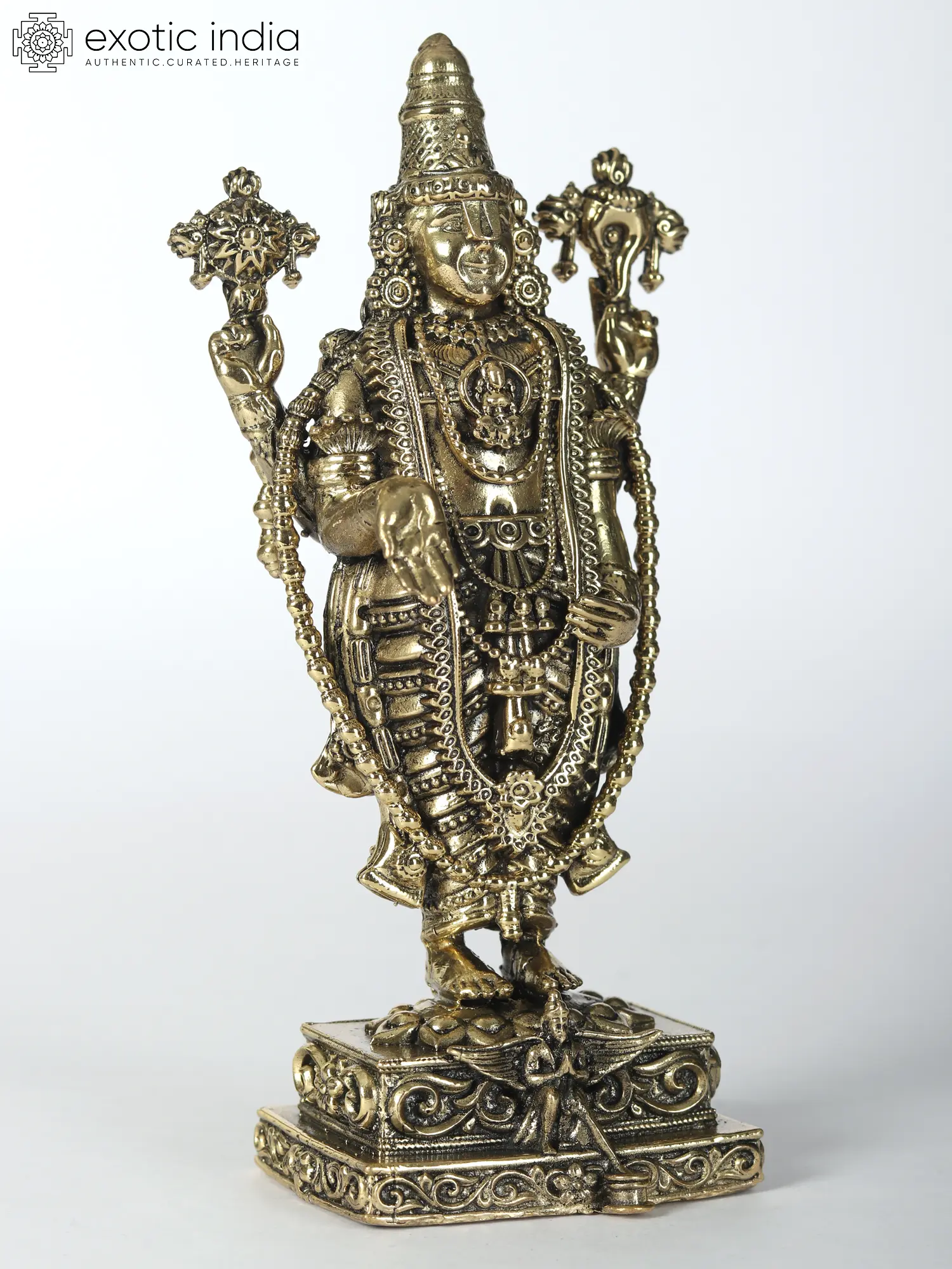 Clad in regal vestments, adorned with a Karanda Mukut crown and resplendent jewellery, Tirupati Balaji, bedecked with a cascade of flowers, symbolises the divine fusion of grace and majesty—an eternal promise of salvation. Cast in brass, this gorgeous creation beckons mortals to surrender, promising protection and cosmic solace in the embrace of divine splendour.