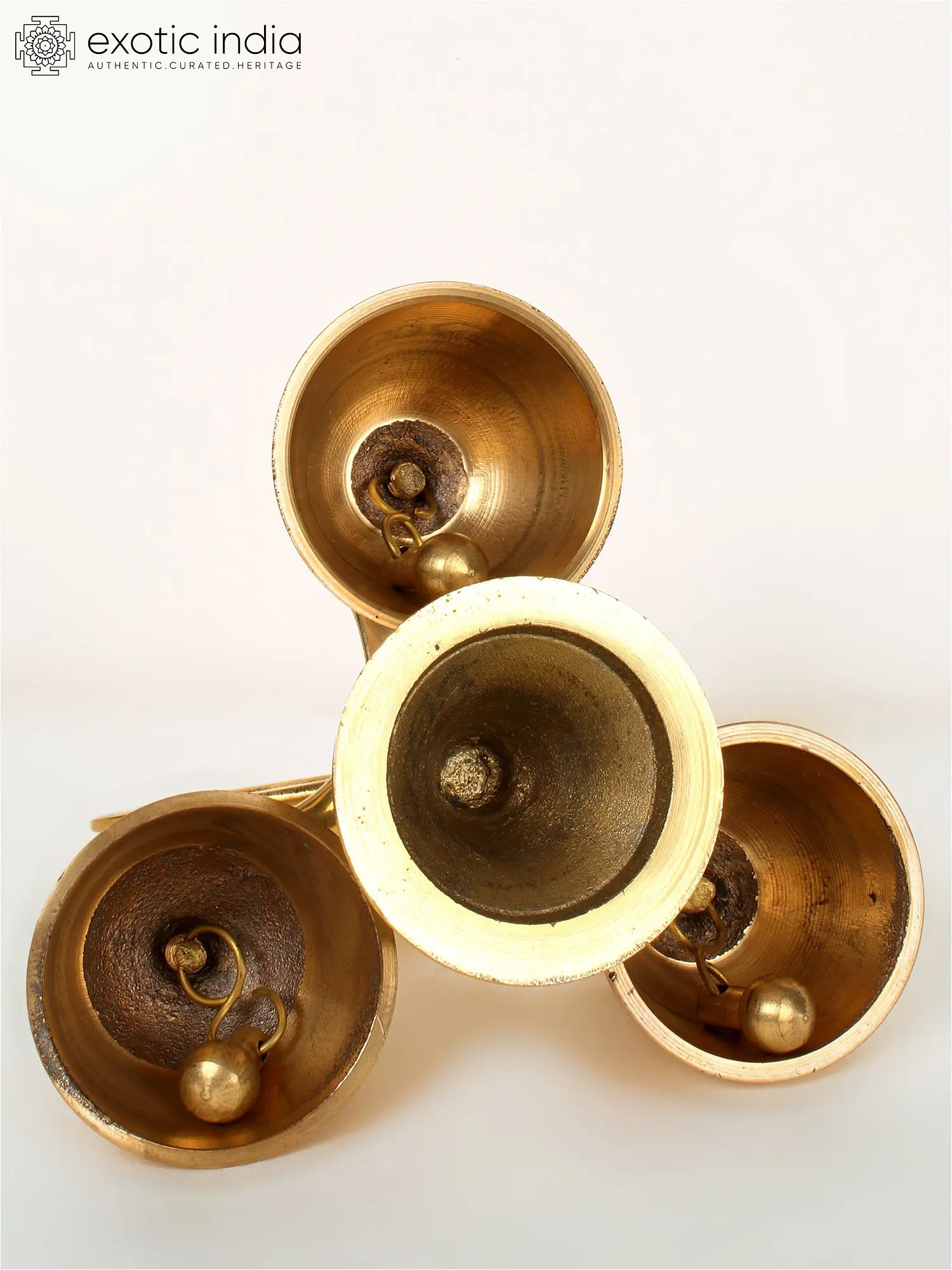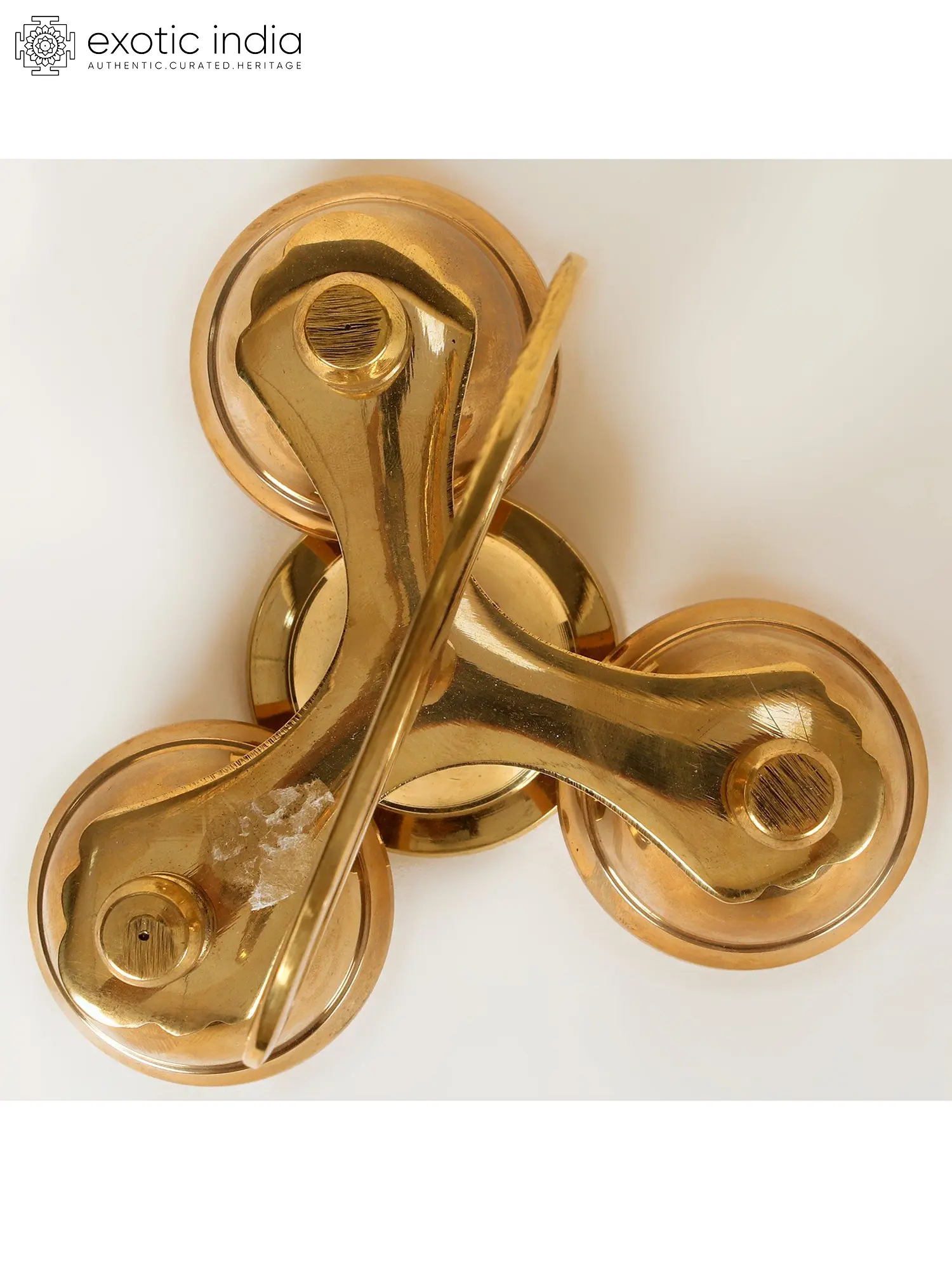 This ceremonial brass bell with holder is a sacred ritual object that combines modern concepts with classic shapes. It has three bells linked to a holder that resembles a fidget. The bells represent the three Lokas or Tridevs, Brahma, Vishnu, and Mahesh. The spine of the bell stand is supported with a circular handle atop. By ringing this bell, one can honor all three deities simultaneously.