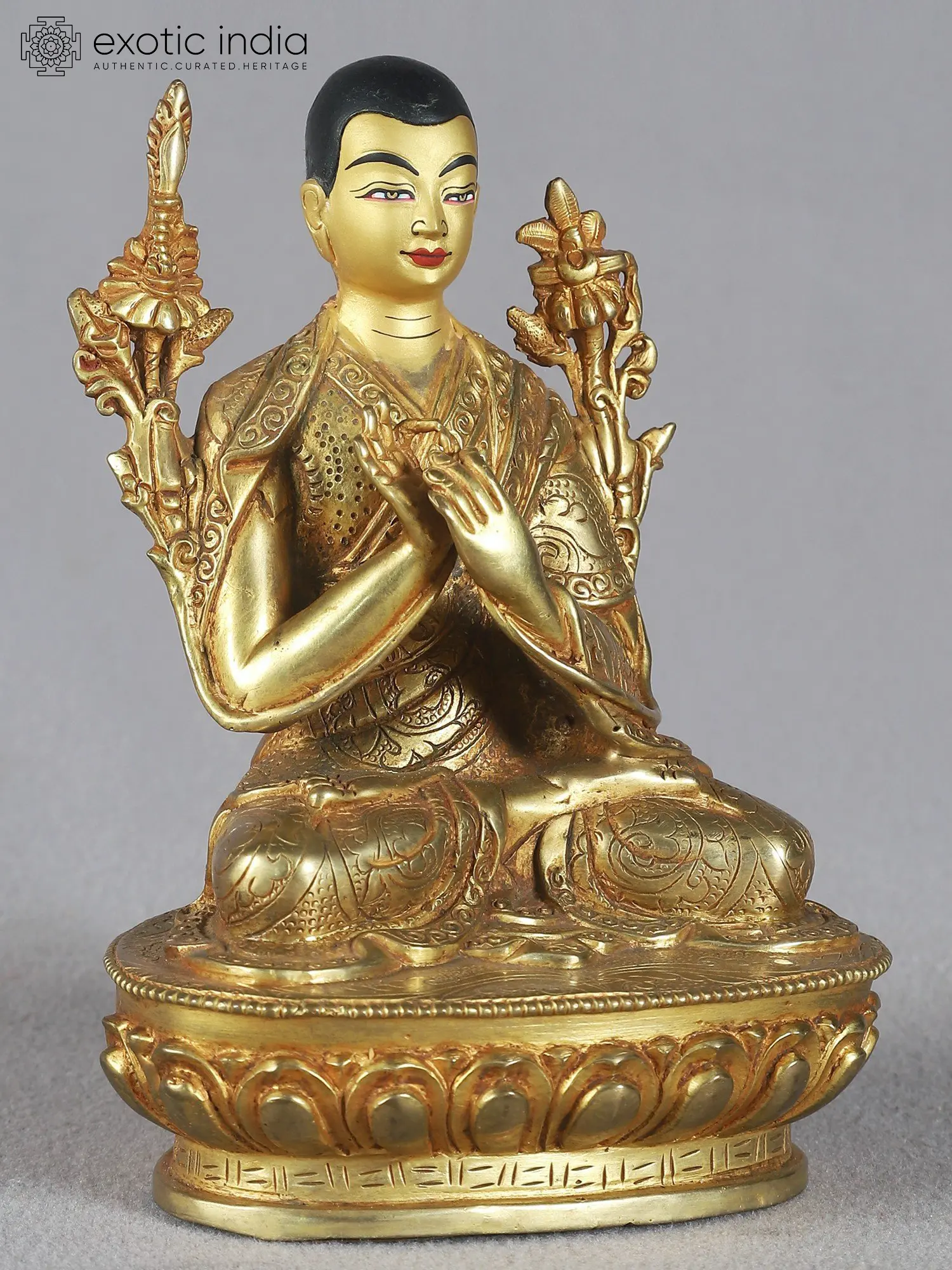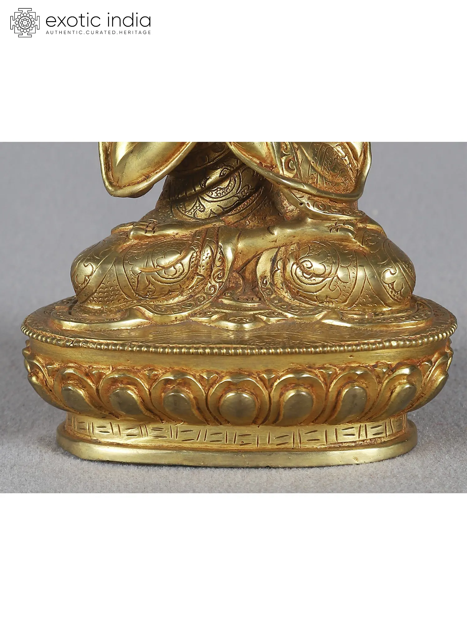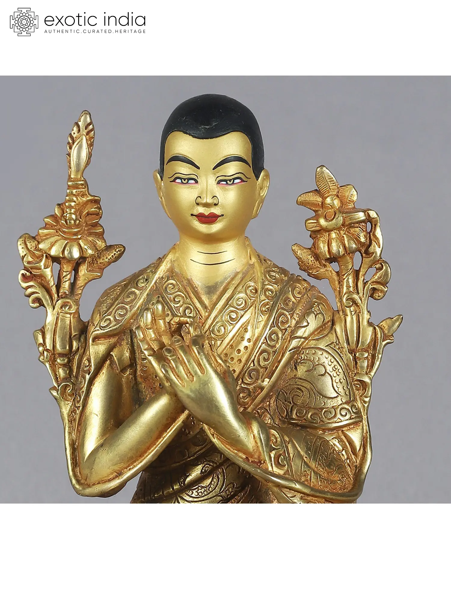 In his depiction, Tsongkhapa holds a lotus in his right hand, symbolizing purity, while a sword and book grace his left, representing wisdom. His posture captures the Dharmachakra mudra, signifying the initiation of the "Wheel of Dharma," conveying his pivotal role in spreading Buddhist teachings.