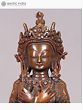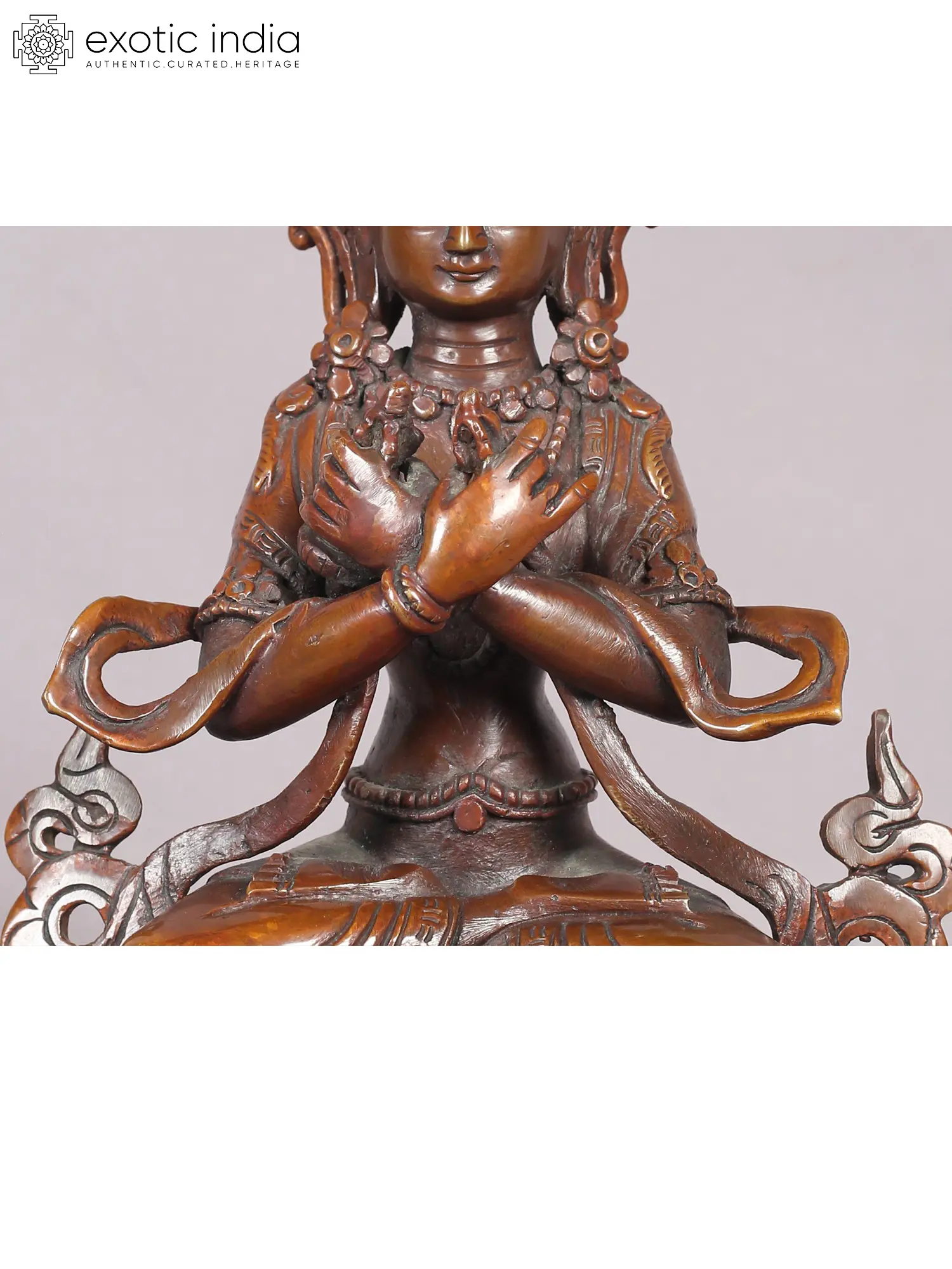 This exquisite copper statue depicts Vajradhara, a central figure in Vajrayana Buddhism, representing the primordial Buddha and the ultimate source of all enlightened activity. In Tibetan Buddhism, Vajradhara is considered the Dharmakaya aspect of the Buddha, embodying the truth body, the unmanifested reality that is beyond all form and conception. He is often visualized as dark blue or black, signifying his omnipresence and the boundless nature of the enlightened mind. This representation, however, uses the rich, warm tones of copper to convey a sense of tangible, yet divine, presence.