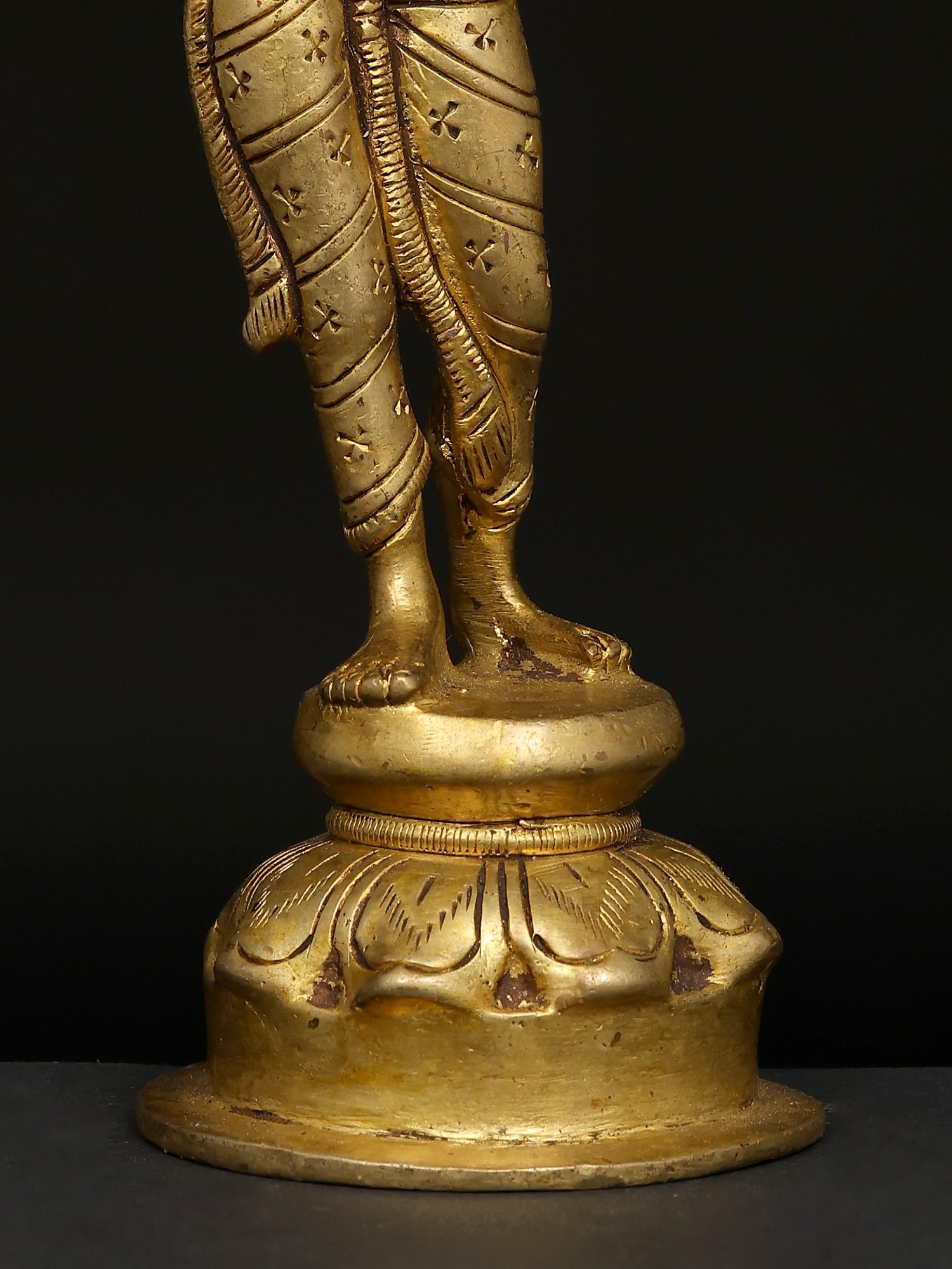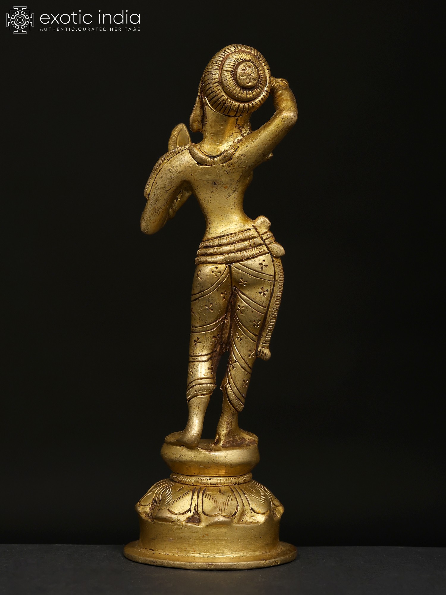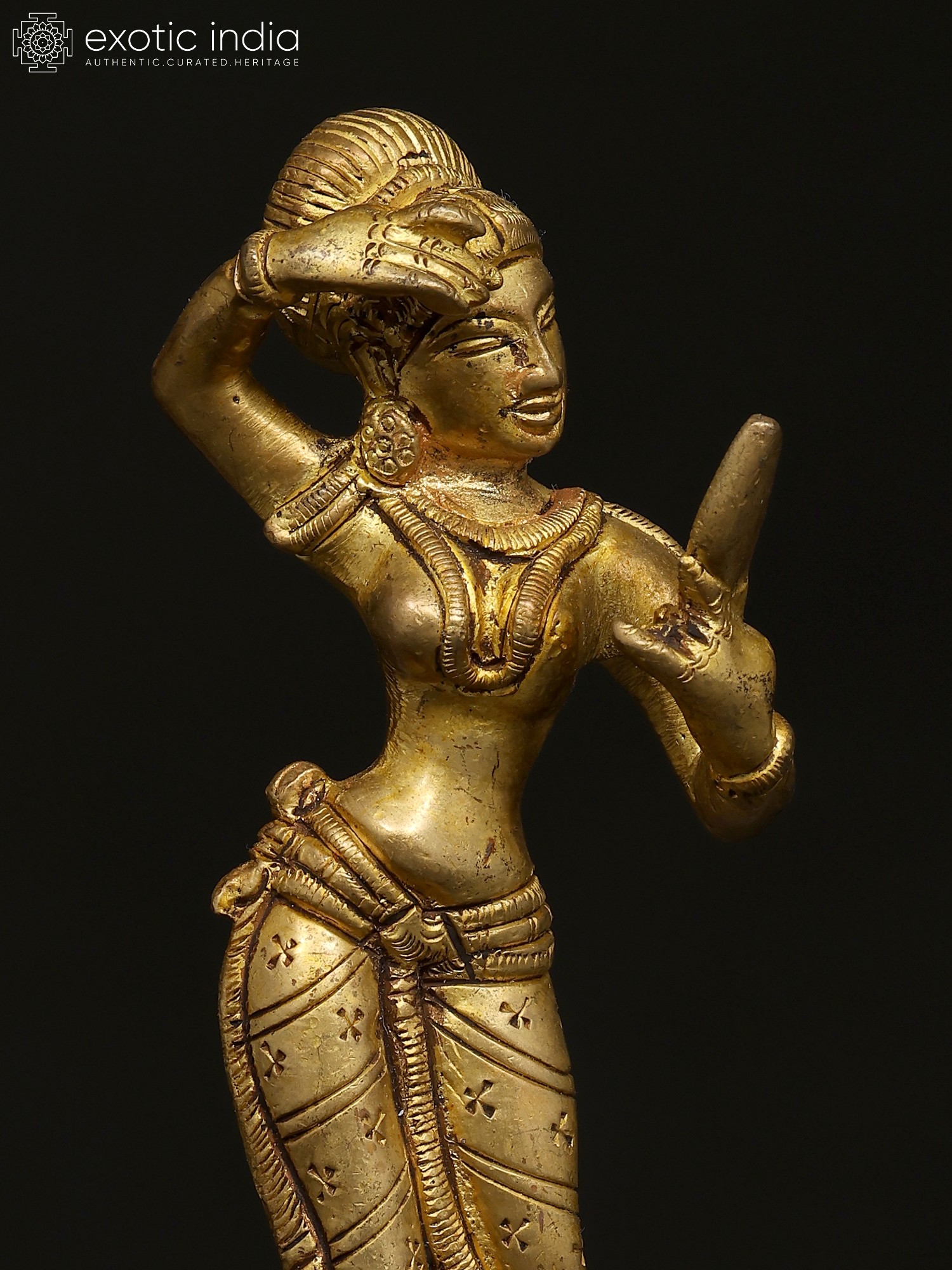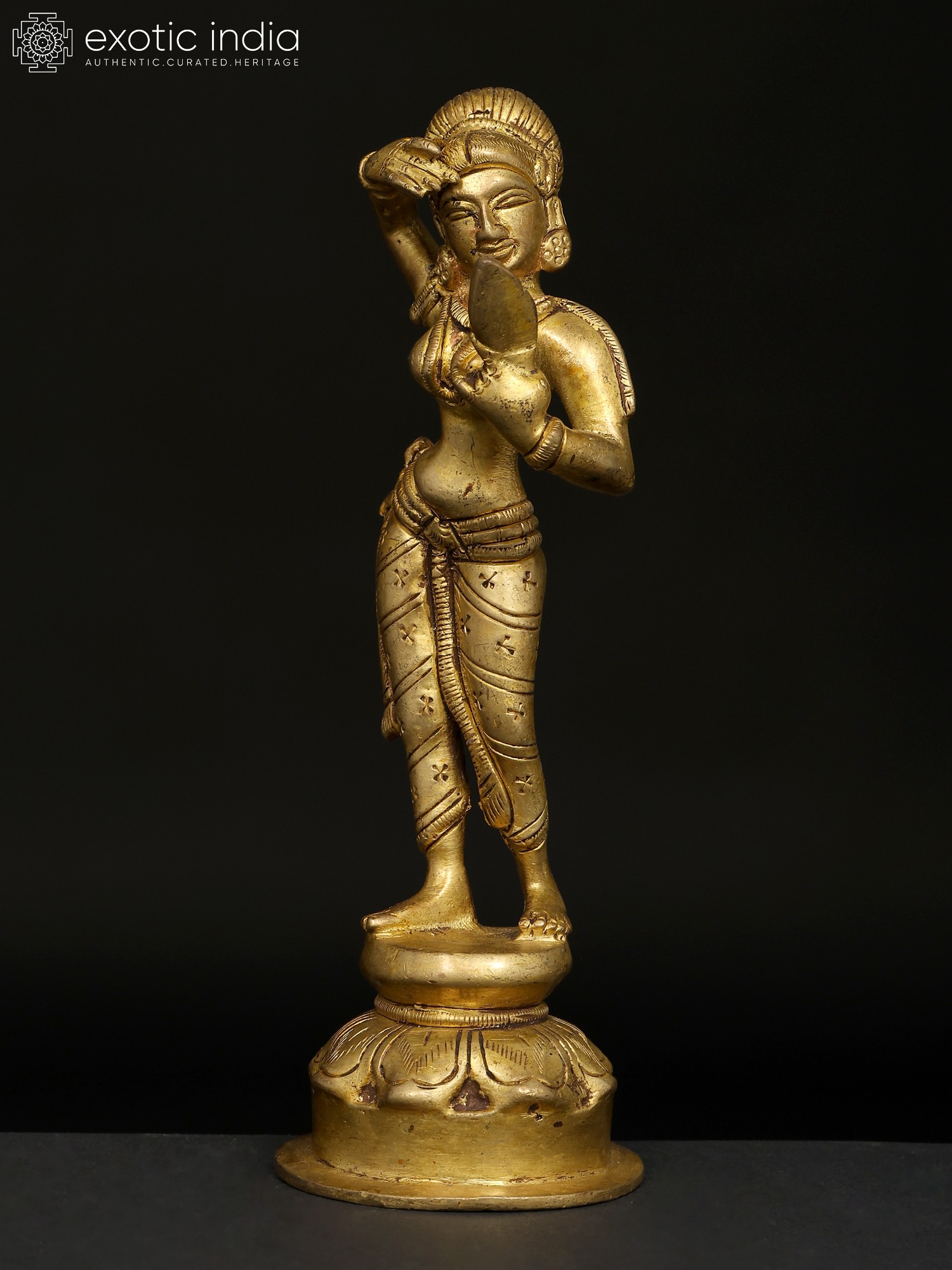 This brass sculpture of an Indian woman applying the sindoor vermilion on her hair-parting while looking into a mirror, considered the highest kind of virtue ascribed to a woman, represents a tradition of auspiciousness said to have travelled through more than 5,000 years of Hindu culture.