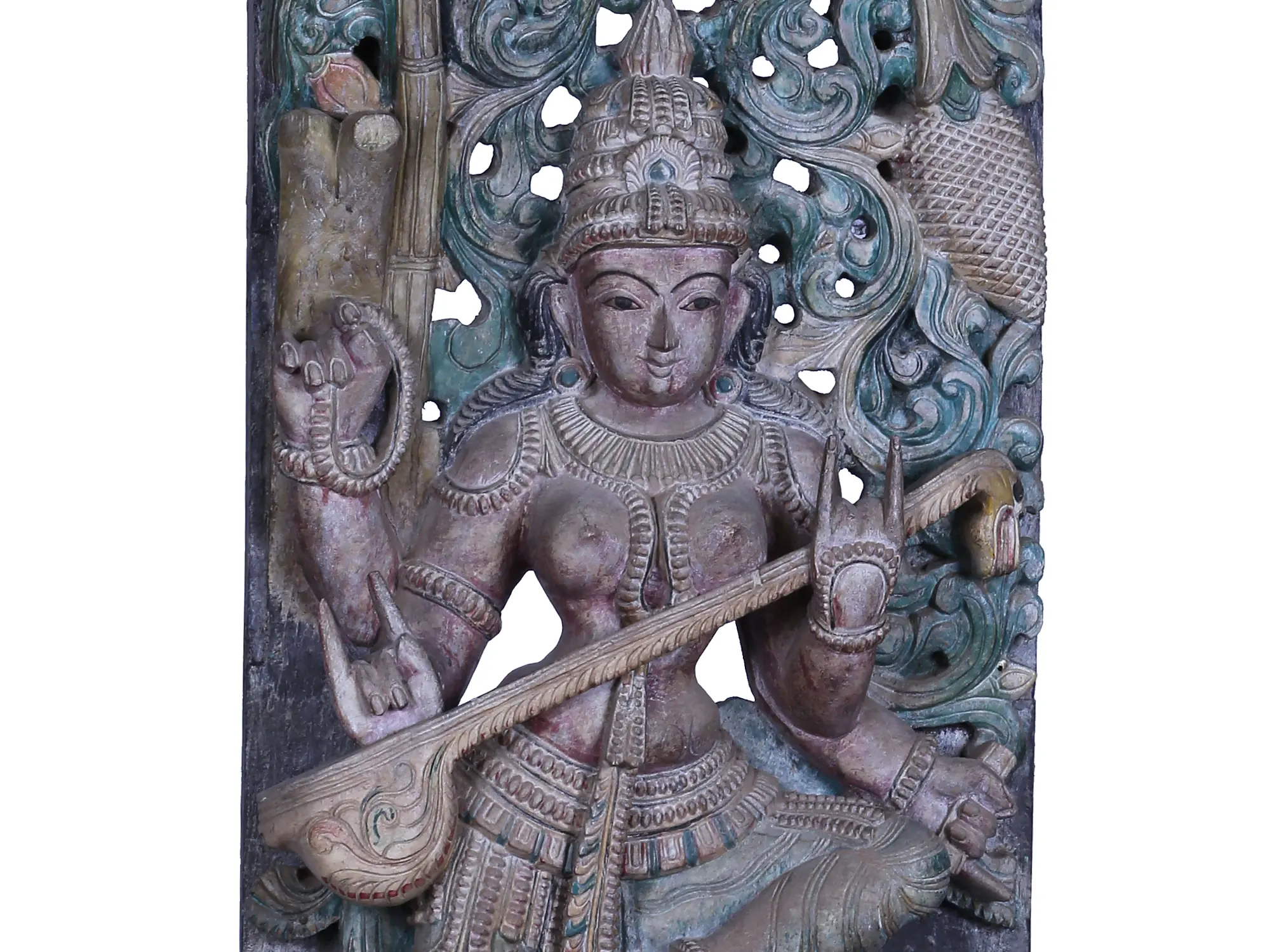 43" Large Wooden Goddess Saraswati Playing Sitar with Peacock