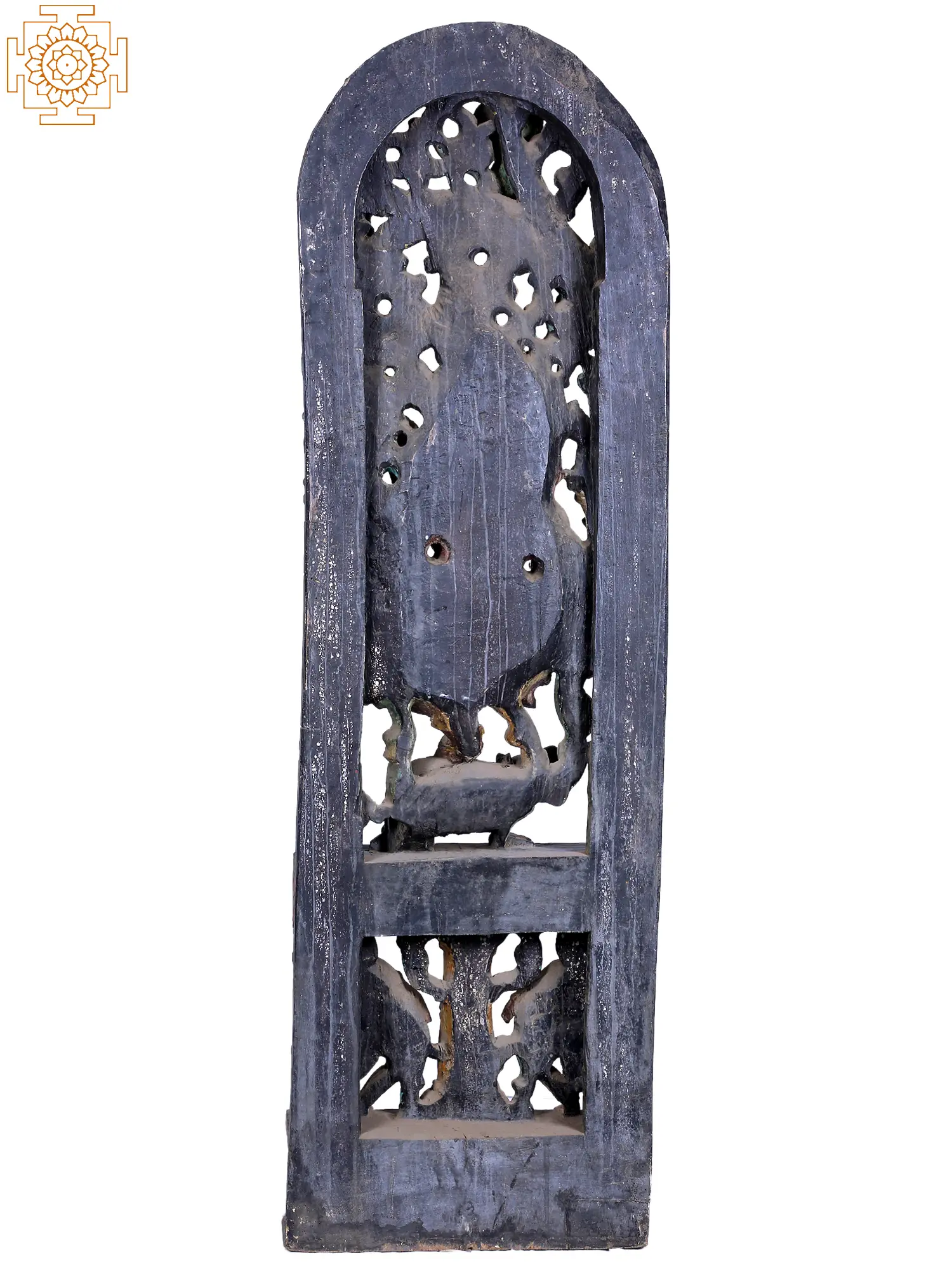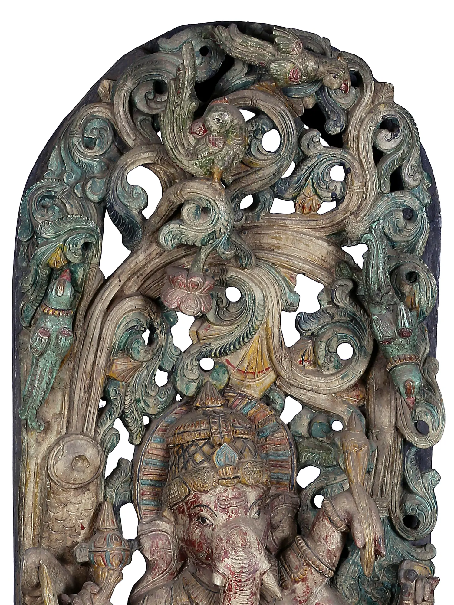 The detailed carvings extend beyond the central figure of Ganesha. The elaborate archway framing the deity is a masterpiece of naturalistic and ornamental motifs. Twisting vines, blooming lotuses, and mythical creatures intertwine, creating a sense of cosmic harmony. The inclusion of celestial dancers at the base further enhances the celebratory and artistic nature of the piece. These dancers, adorned in traditional attire, evoke the joy and ecstasy associated with divine gatherings and the auspicious occasions Ganesha presides over. Their graceful poses and intricate detailing add another layer of narrative to the sculpture, inviting contemplation on the cyclical nature of life and the celebration of creation. The aged patina and subtle coloration contribute to its antique charm, hinting at a rich history and countless blessings bestowed upon those who have revered it over time. This impressive wood carving is more than just a decorative item; it is an artifact imbued with centuries of devotion and cultural heritage. It serves as a powerful reminder of the spiritual principles Ganesha embodies – overcoming challenges, embracing new beginnings, and seeking knowledge. Its grand scale makes it a statement piece, perfect for adorning a prominent space in your home or sanctuary, radiating positive energy and inviting divine grace. Whether you are a devotee seeking spiritual connection or an admirer of exceptional artistry, this Lord Ganesha sculpture promises to be a source of inspiration and a cherished addition to your collection.