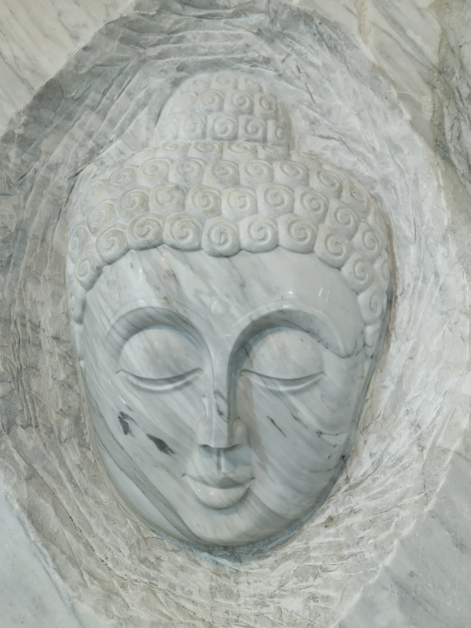 This sculpture represents a striking fusion of traditional reverence and contemporary artistic expression. While the subject matter is deeply rooted in centuries of Buddhist tradition, the execution is distinctly modern. The raw, unpolished edges of the marble slab provide a dramatic contrast to the meticulously rendered details of Buddha's face. This juxtaposition highlights the eternal nature of spiritual truth emerging from the ephemeral world. The serene countenance, with its closed eyes and gentle smile, invites introspection and contemplation, drawing the viewer into a moment of quietude. It is a piece that speaks to the soul, offering a visual anchor for spiritual practice or a powerful statement of inner peace in any environment.