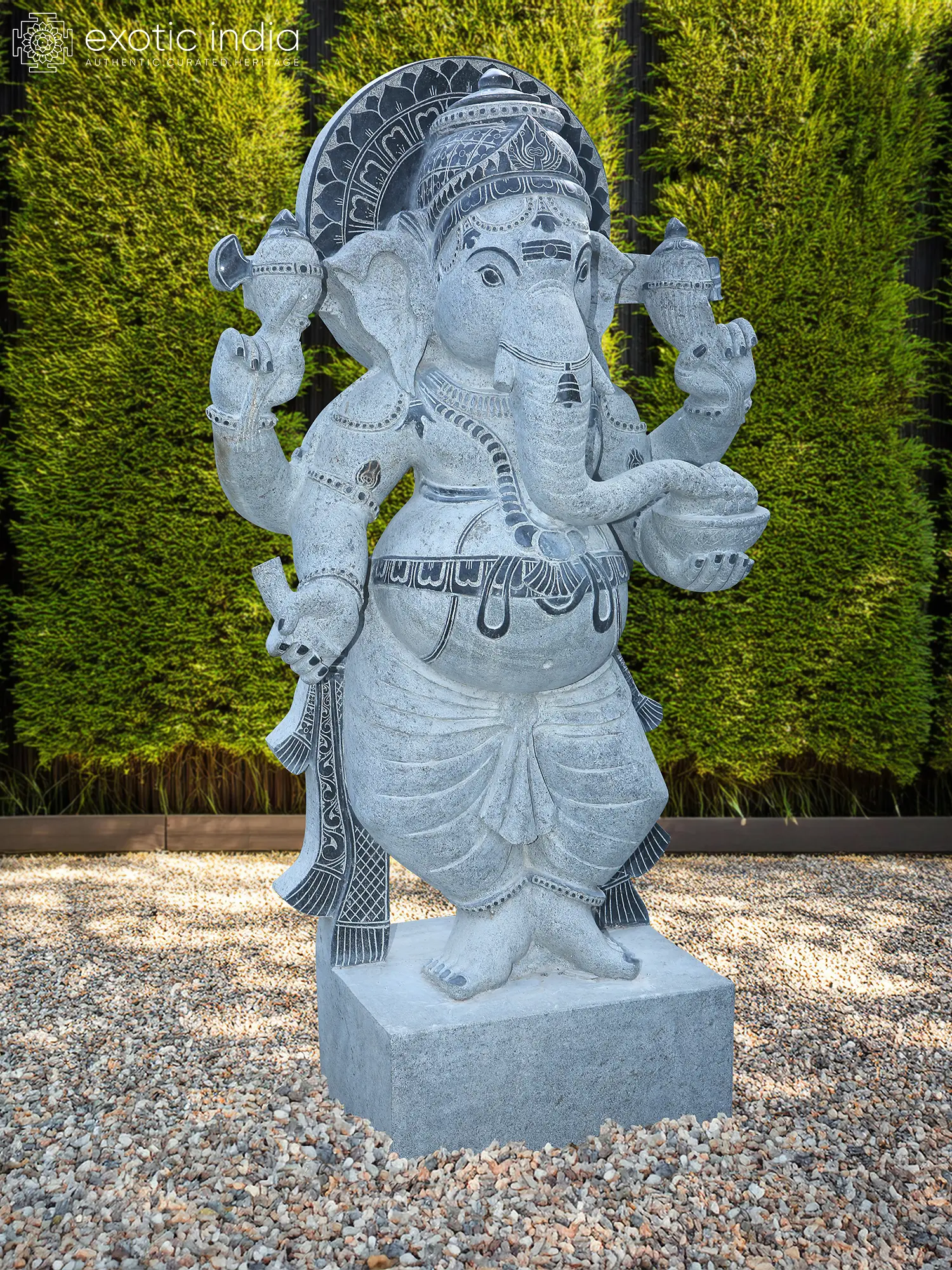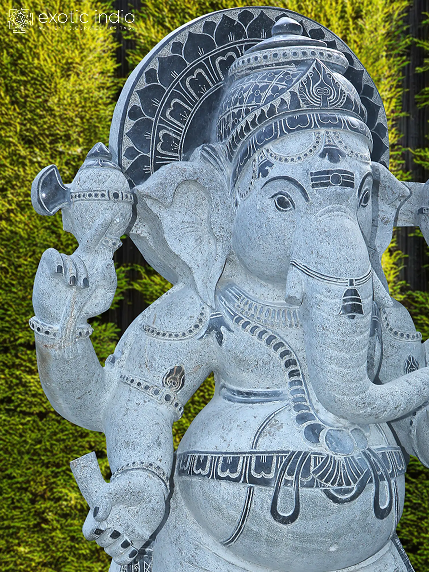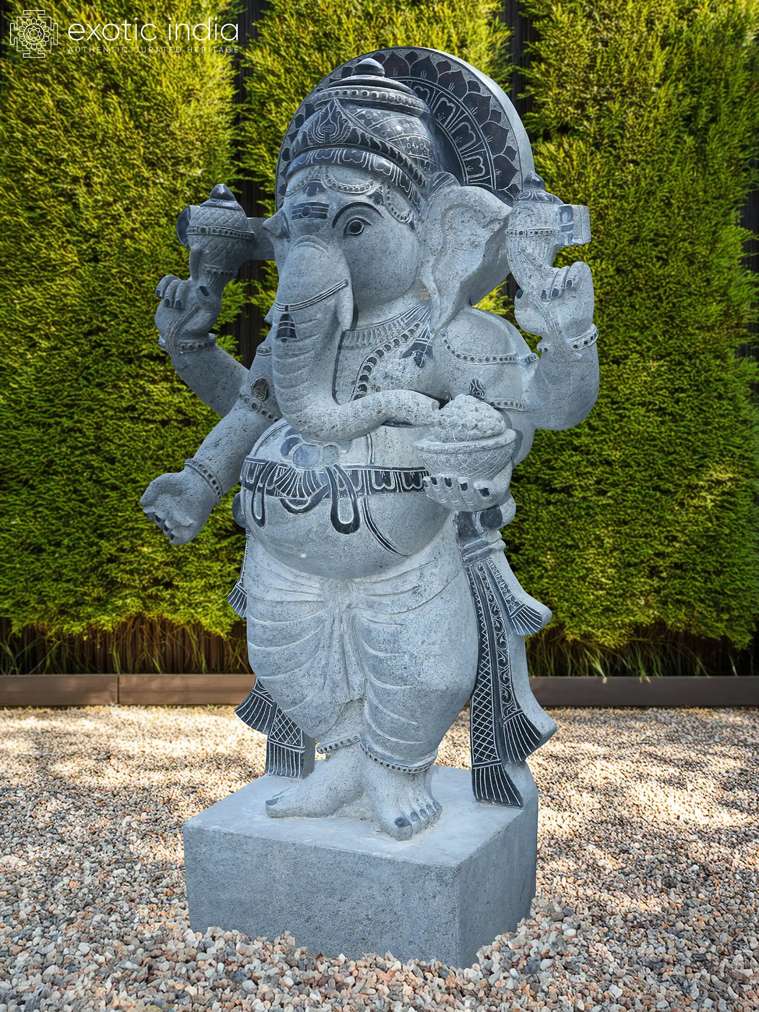 This Large Granite Stone Statue of Standing Lord Ganesha elegantly portrays the beloved deity with four arms, symbolizing his immense power and divine abilities.