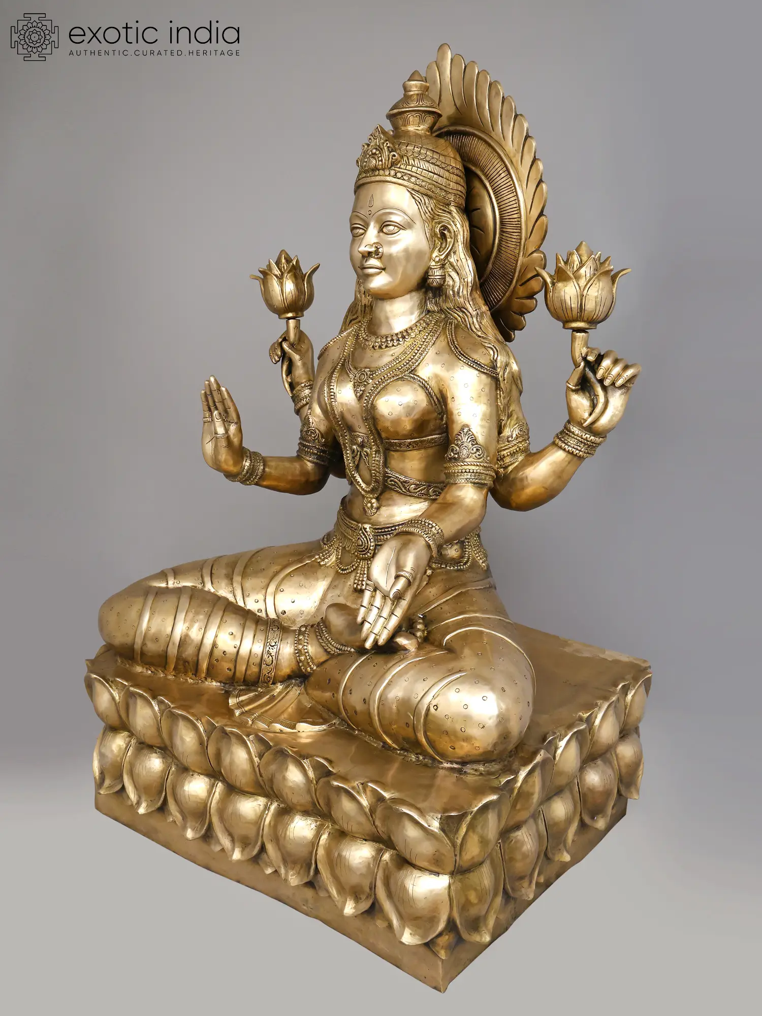 Lakshmi holds fully blossomed lotuses in her hands, their stems, petals, and curves presented with a natural softness that belies the solidity of the metal. She is seated upon a large lotus pedestal whose layered petals appear to have bloomed organically, reinforcing her identity as the source of purity and abundance.