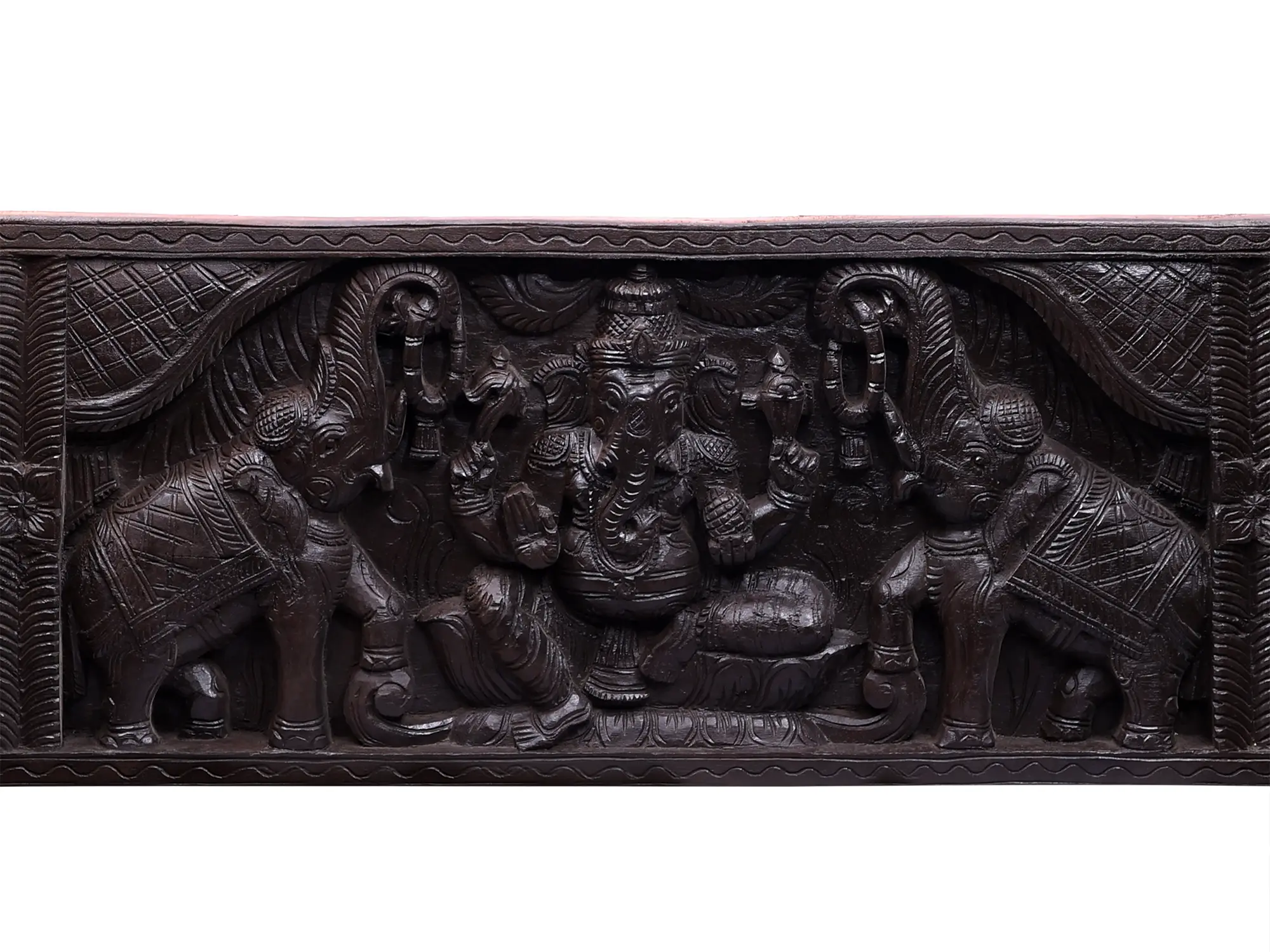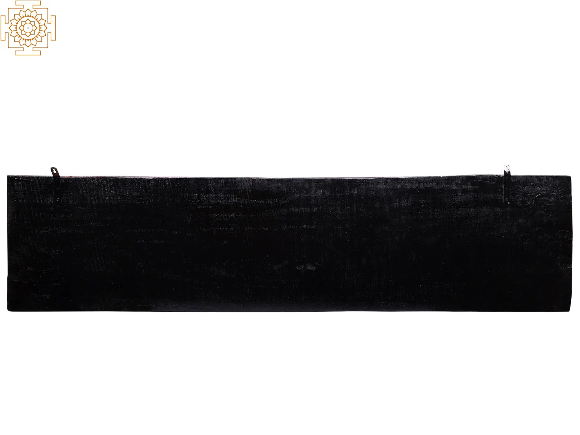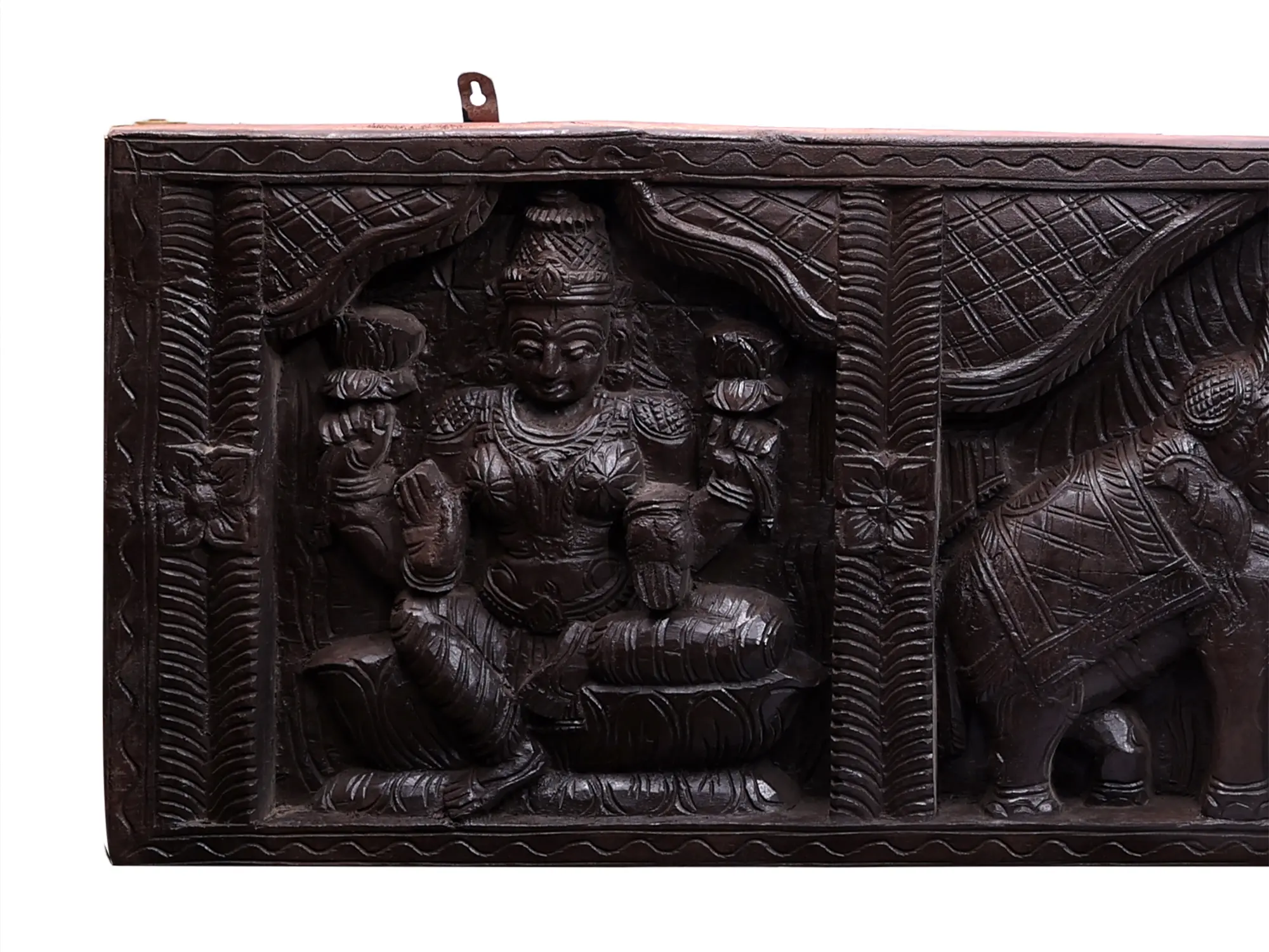 Flanking her sides are Lord Ganesha, remover of obstacles, and Saraswati, goddess of knowledge and arts, emanating blessings of success and enlightenment. With vibrant hues and meticulous carvings, this wooden masterpiece becomes a focal point in any home or sacred space. Embrace the divine energies of Gaja Lakshmi, Ganesha, and Saraswati, and usher in prosperity, wisdom, and divine grace into your surroundings with this enchanting wall panel.