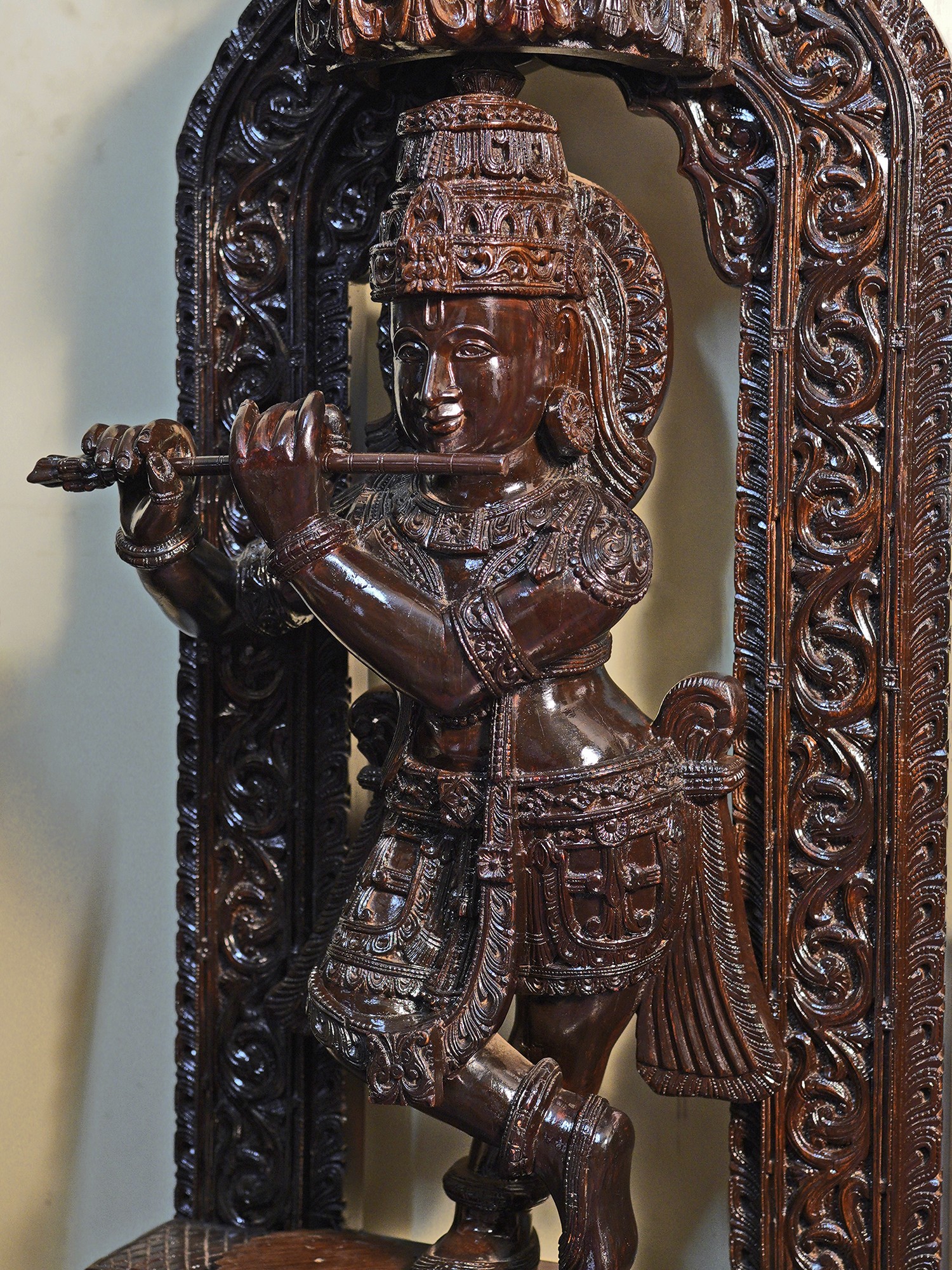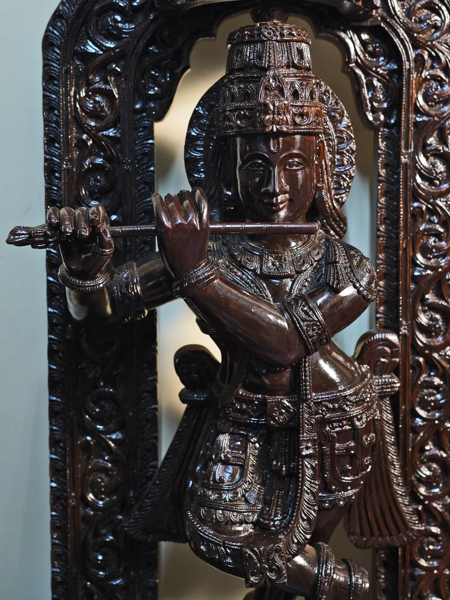 This statue is a testament to the skill and dedication of master artisans who have inherited centuries-old traditions of wood carving. Each detail, from the delicate ornaments adorning Krishna's form to the swirling patterns of the archway, is a testament to their expertise. By bringing this artwork into your home, you are not only acquiring a beautiful piece of décor, but also supporting the preservation of a rich cultural heritage. This hand-carved sculpture is a treasure to cherish for generations, a symbol of devotion and artistry that will enrich any space with its divine presence.