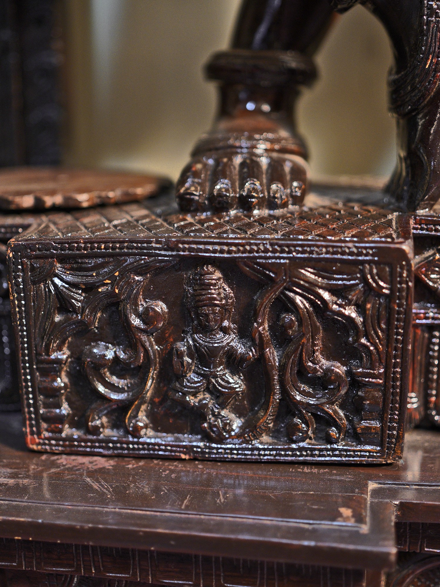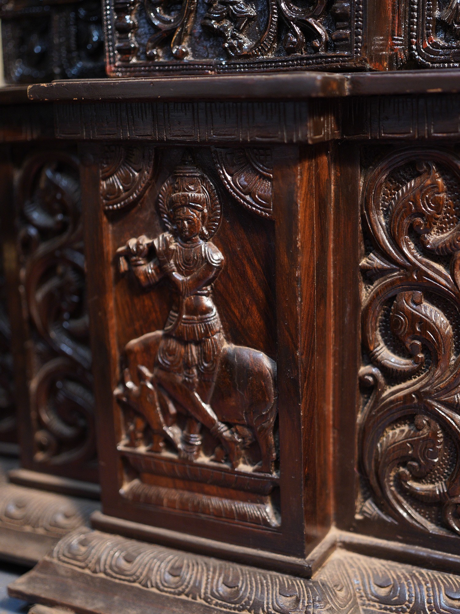 Crafted from rich rosewood, this sculpture is imbued with a warm, earthy tone that complements the intricate carvings. Rosewood, prized for its durability and beautiful grain, is a fitting medium for depicting a deity whose presence is both timeless and grounding. The natural variations in the wood grain add a unique character to each piece, ensuring that yours will be a truly one-of-a-kind representation of the beloved deity. The hand-rubbed finish enhances the wood's natural luster, creating a smooth, tactile surface that invites touch.
