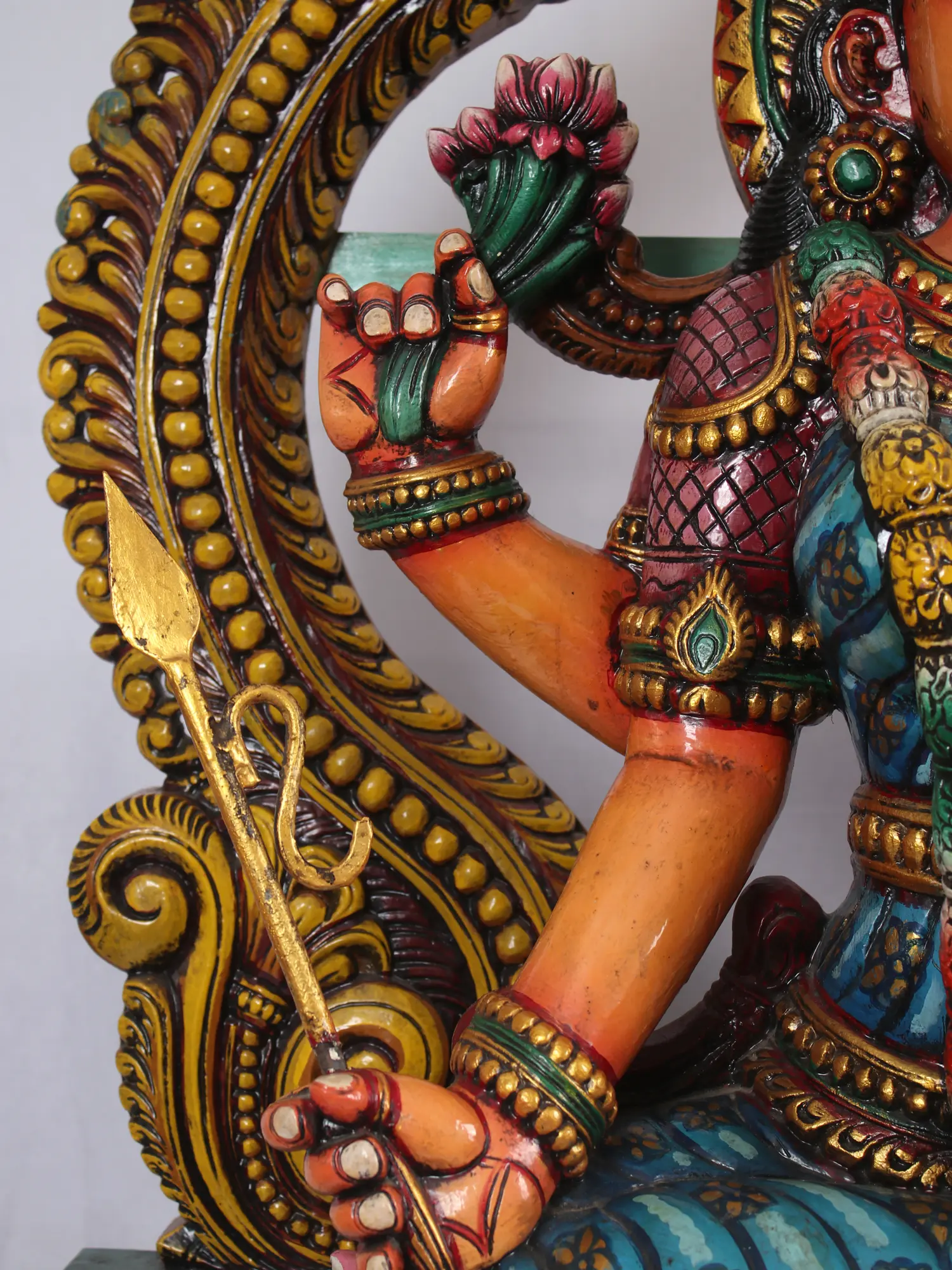 Adorned with beautiful ornaments that are carved with precision and painted with lovely colors, this wooden statue of Rajarajeshwari is an ode to the “Kameshwari” or the goddess of desire, who sows the seeds of virtuous wishes and is the origin of Kriya (action) which is a prerequisite for Srishti (creation).