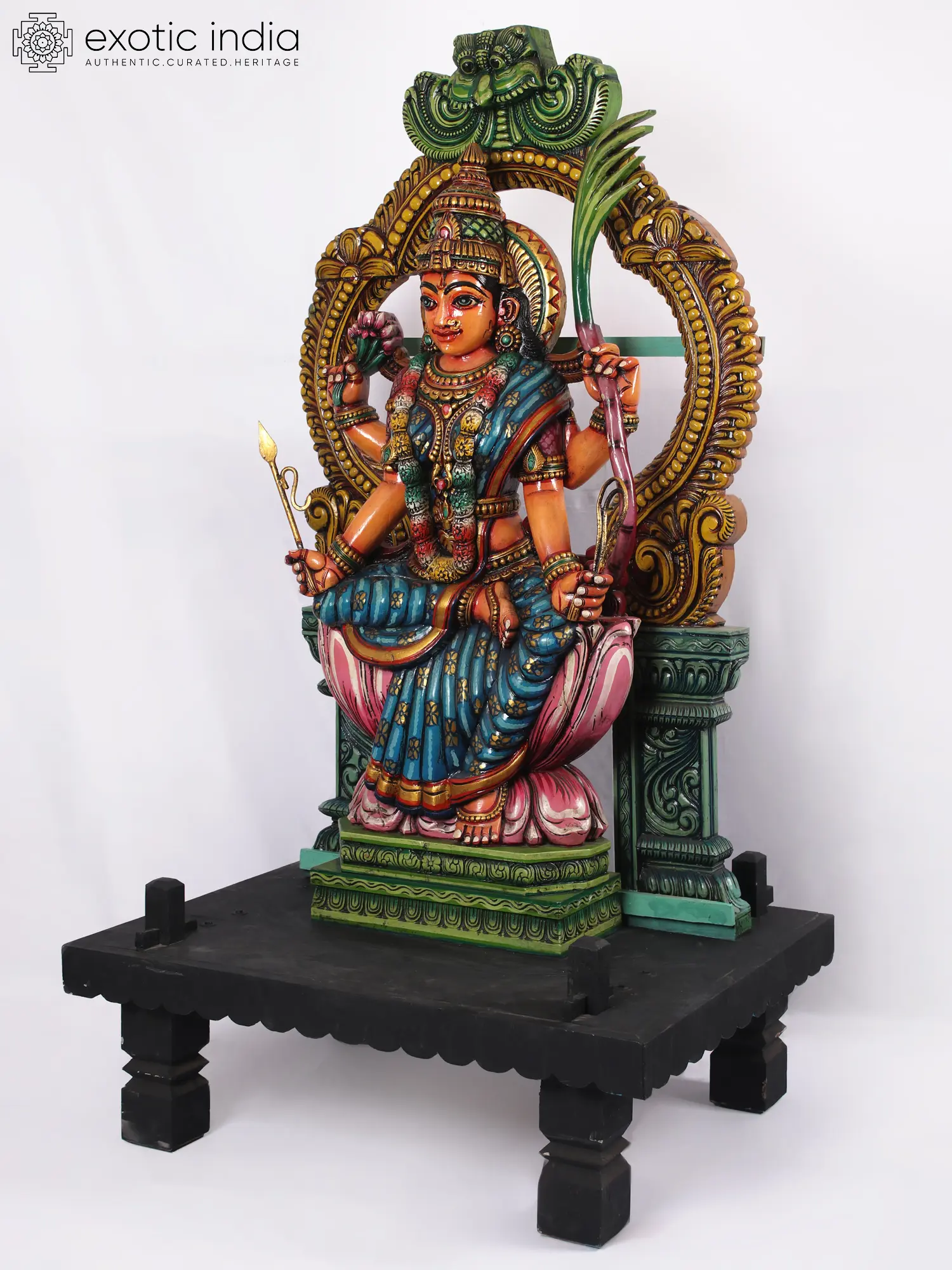 Brimming with the light of the morning Sun, and full of vitality and beauty, this wooden statue of goddess Rajarajeshwari (queen of kings) is a masterpiece of traditional wooden artwork. Sculpted like a sanctum murti, Devi Rajarajeshwari sits on the lotus flower, which is a symbol of the origin of the Universe, as the Adi-Shakti or primordial energy that causes and sustains creation.