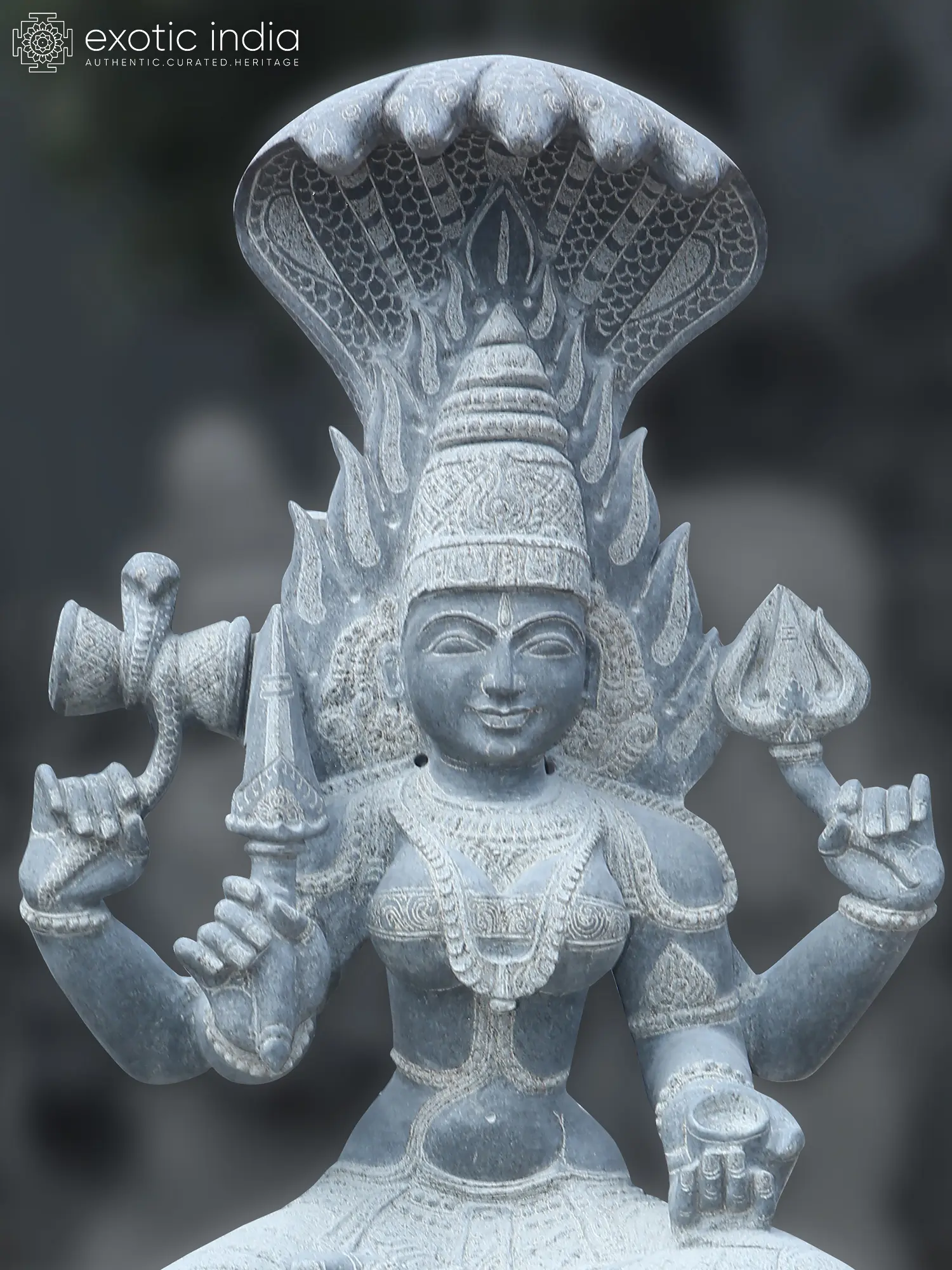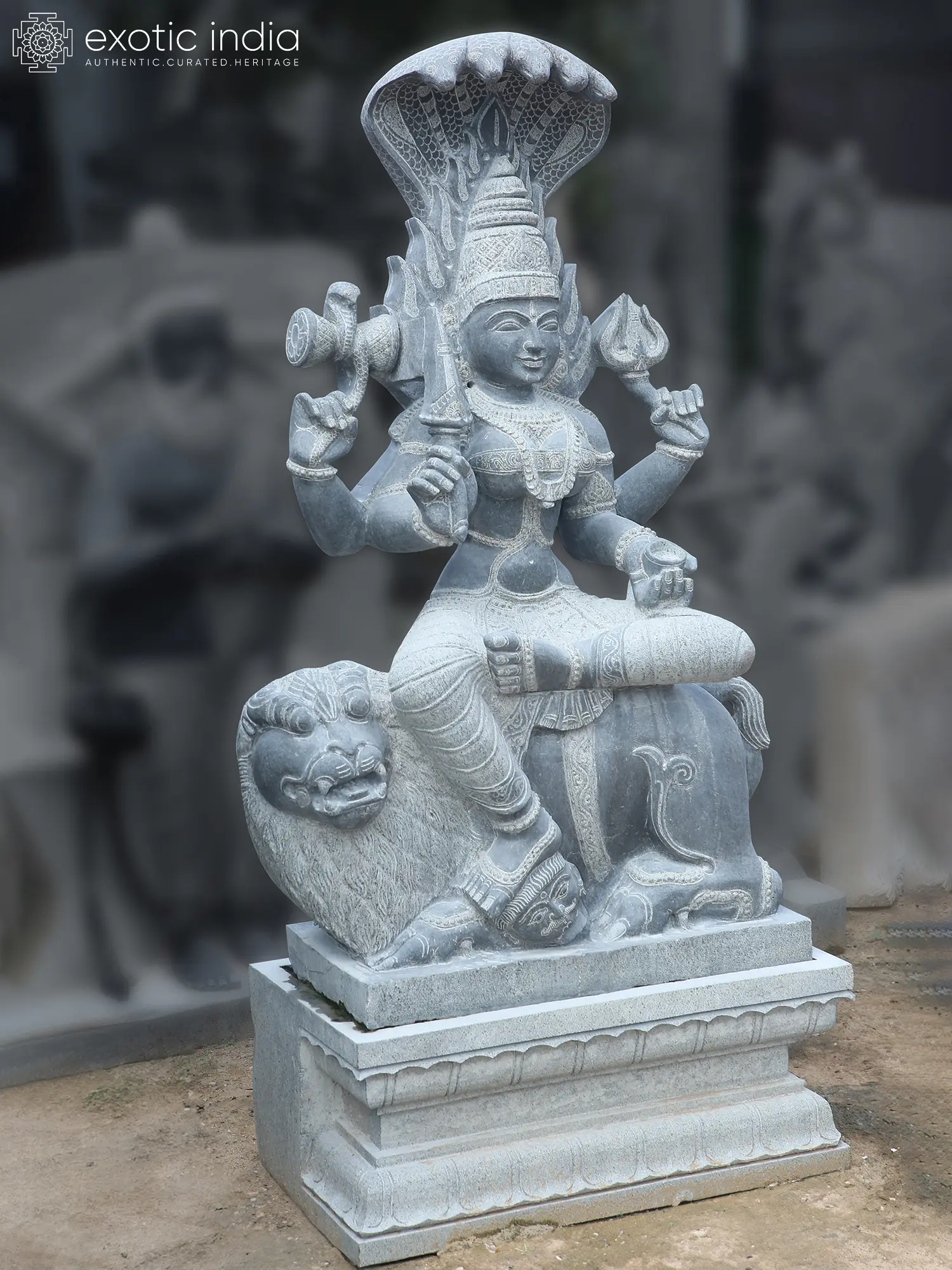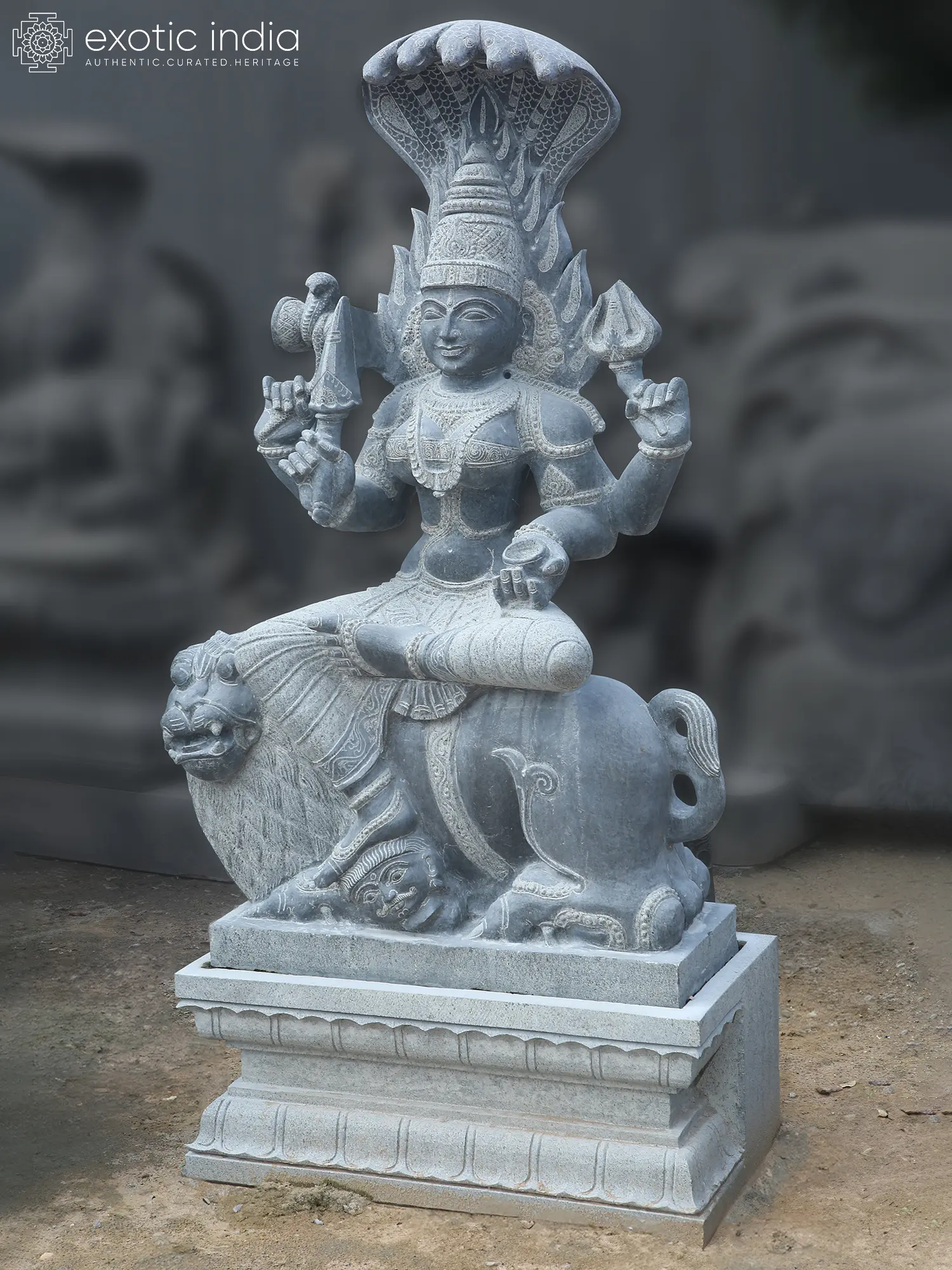 This marvelous nearly 5-foot large granite sculpture presents Mariamman seated on a lion-like Durga, with a flaming aura like Kali and the heavenly beauty of Parvati.