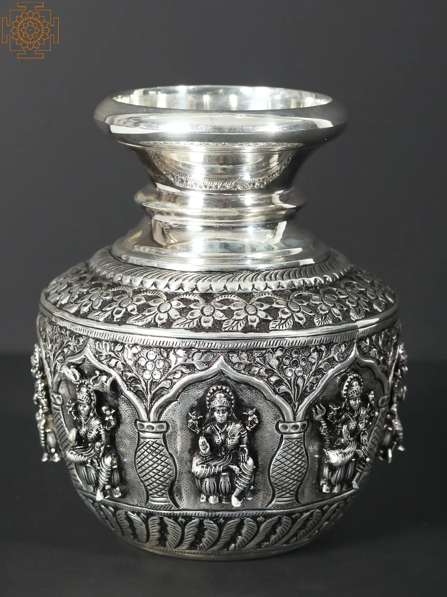 The 92.5 Silver Ashta Lakshmi Kalash is a remarkable addition to any collection of ritual and puja items. This exquisite piece features the depiction of the eight forms of Goddess Lakshmi, known as Ashta Lakshmi, on its surface. The silver Kalash holds immense significance on auspicious occasions, bringing good luck and prosperity to the home. With vines and flowers adorning its neck, the Kalash exudes an earthy charm. The middle ring showcases intricately crafted trees and idols of the Ashta Lakshmi, further enhancing its divine appeal. The silver matt finish adds an antique touch, exuding a sense of timeless beauty. The Ashta Lakshmi Kalash is a sacred and elegant addition to any puja place, infusing blessings and auspiciousness into the surroundings.