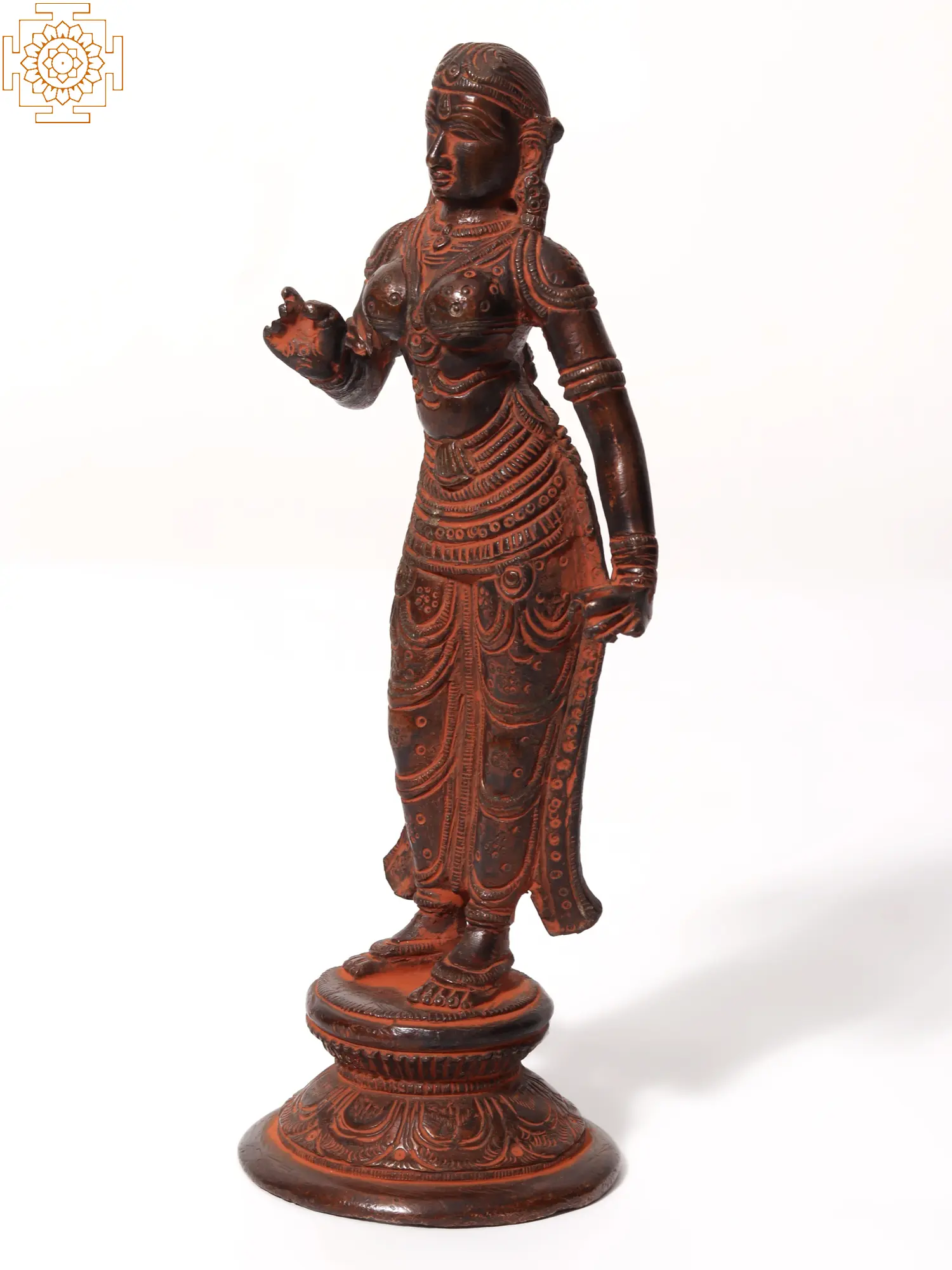 Standing in an immensely graceful posture, that highlights her lithesome form tastefully, the Devangana or Apsara in this brass statue infuses the environment with the sweetness of Sringaar Rasa. Her ornamentation and attire are inspired by the heavenly beauties that adorned the walls of Indian temples, and her form is the perfection of feminine grace described in ancient Indian texts. With a sublime emotion on her face, the Apsara raises her hand, as if offering a floral gift to her admirer. Sculpted in a rounded manner, this brass Apsara statue can be the perfect addition to your space, to give it a touch of exotic Indian aesthetics.