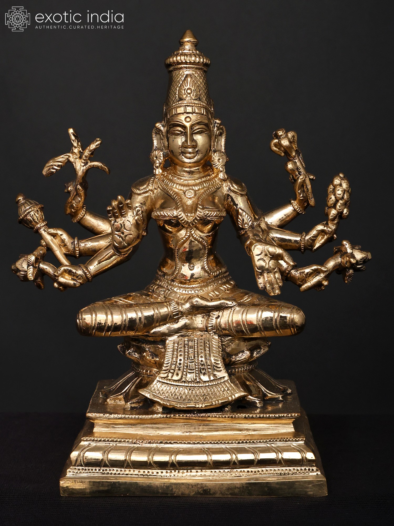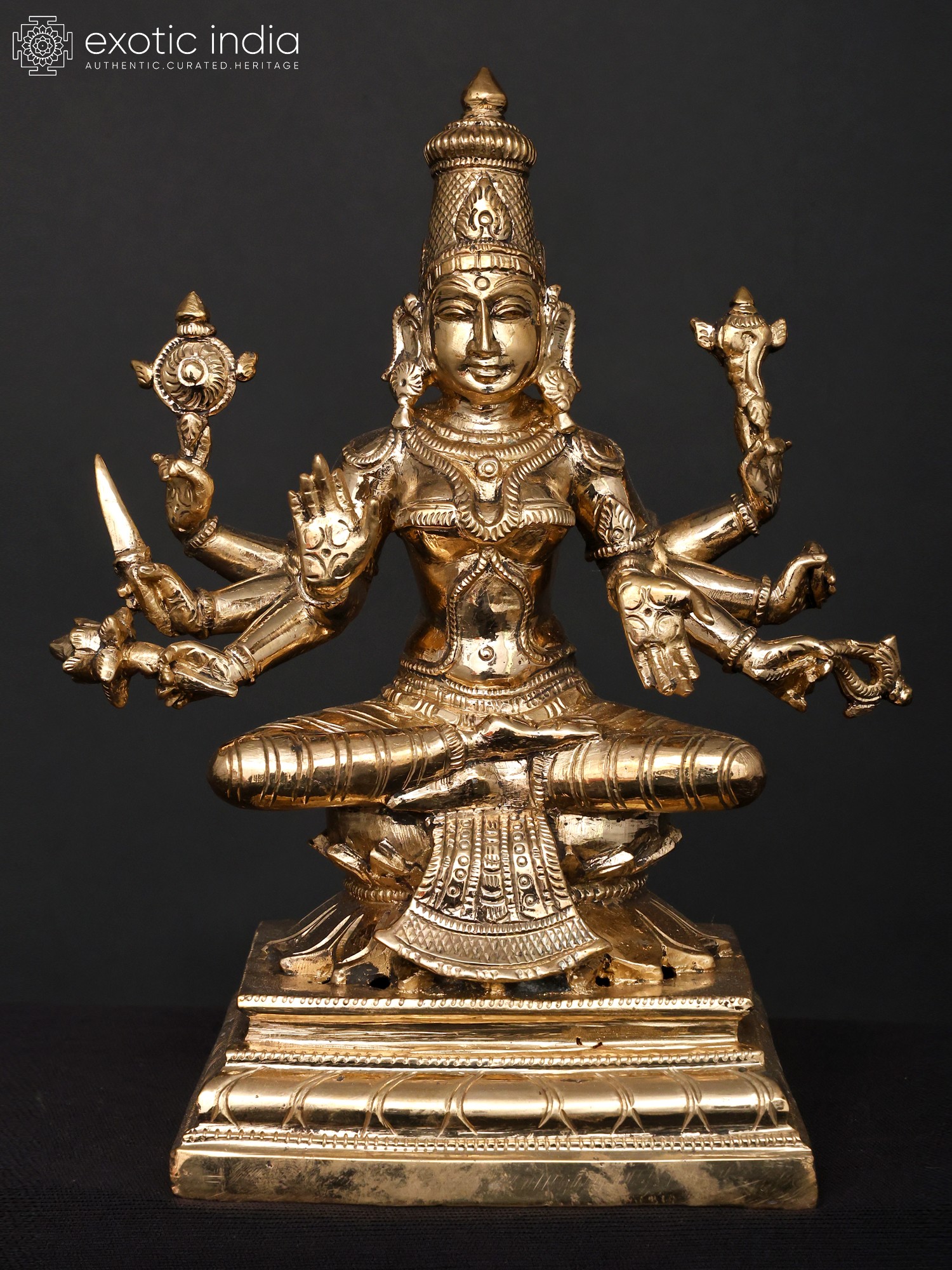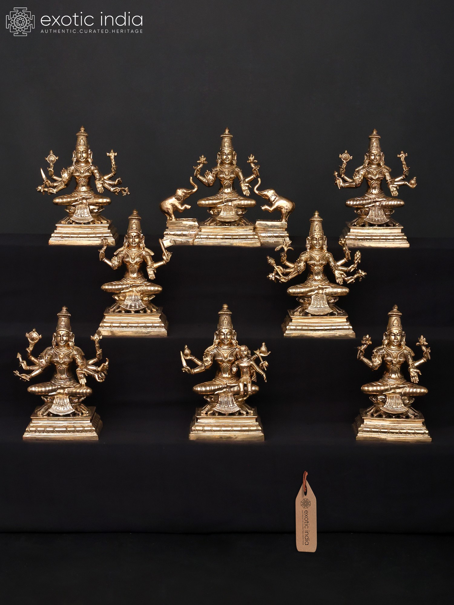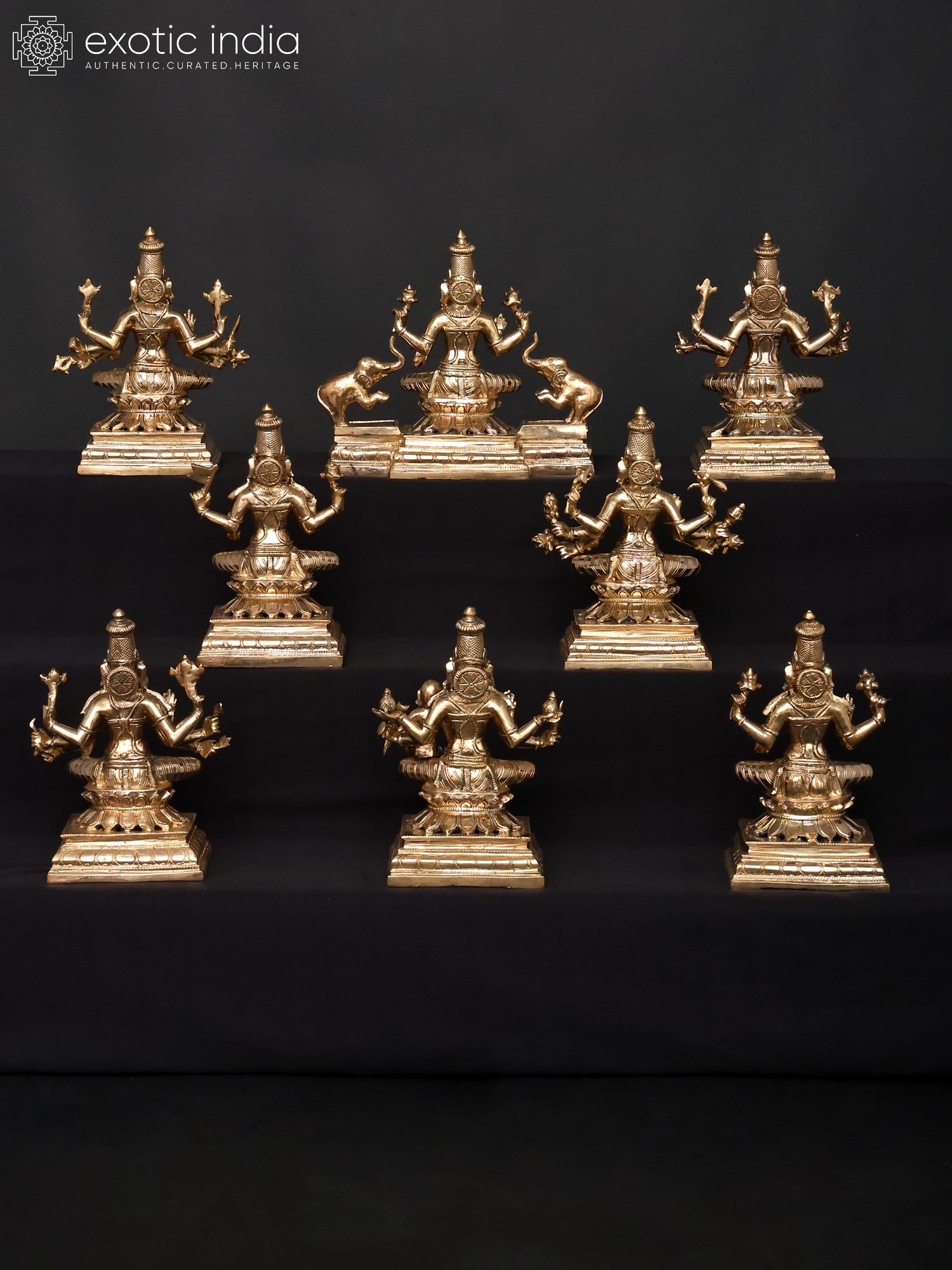 Do not be fooled by the seemingly small scale of these group of eight ‘panchaloha’ bronze images, for it is in their combined presentation that we truly witness the energetic and creative forces of the divine – the inherently female tendencies of Shakti, manifested here in the eight forms of Lakshmi.