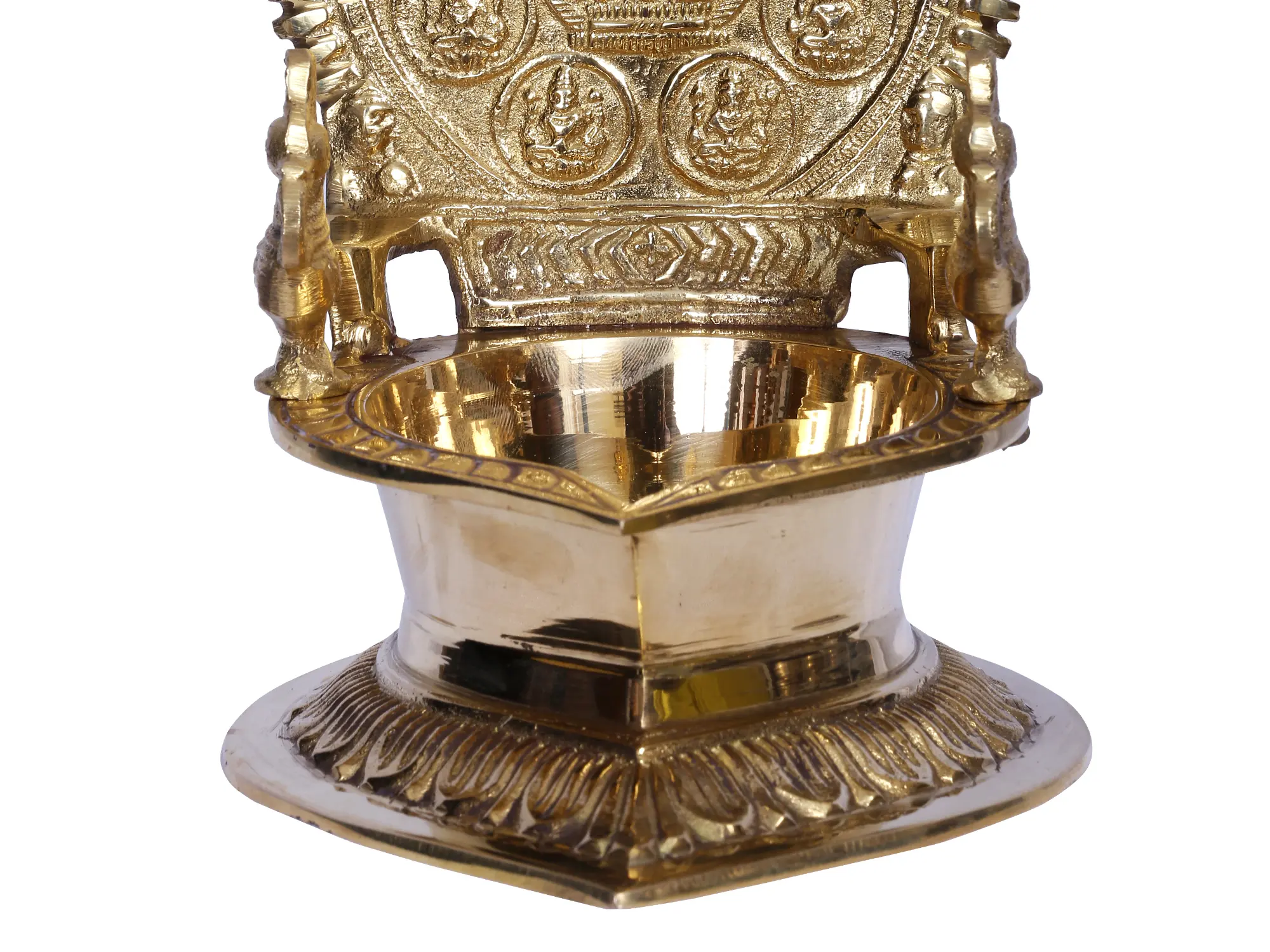 This Ashtalakshmi Diya is commonly used in welcome rituals. Lighting and worshipping with this brass Ashtalakshmi Diya brings all types of wealth. It is constructed using the lost wax casting process, and the flame arch or crown of the lamps comprises eight holy representations of Goddess Lakshmi in various shapes. The light represents good fortune and wealth. The golden matt finish is an amazing touch that exudes everlasting beauty. The Ashta Lakshmi Diya is a solemn and lovely addition to any puja location, pouring blessings and auspiciousness into the surrounding environment.
