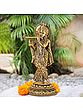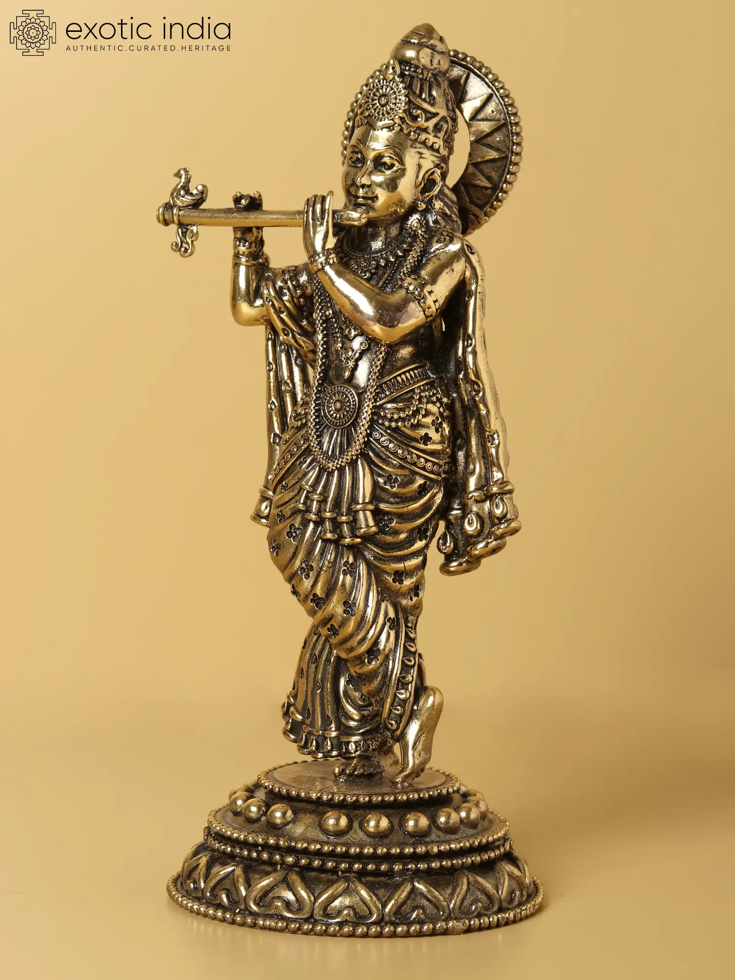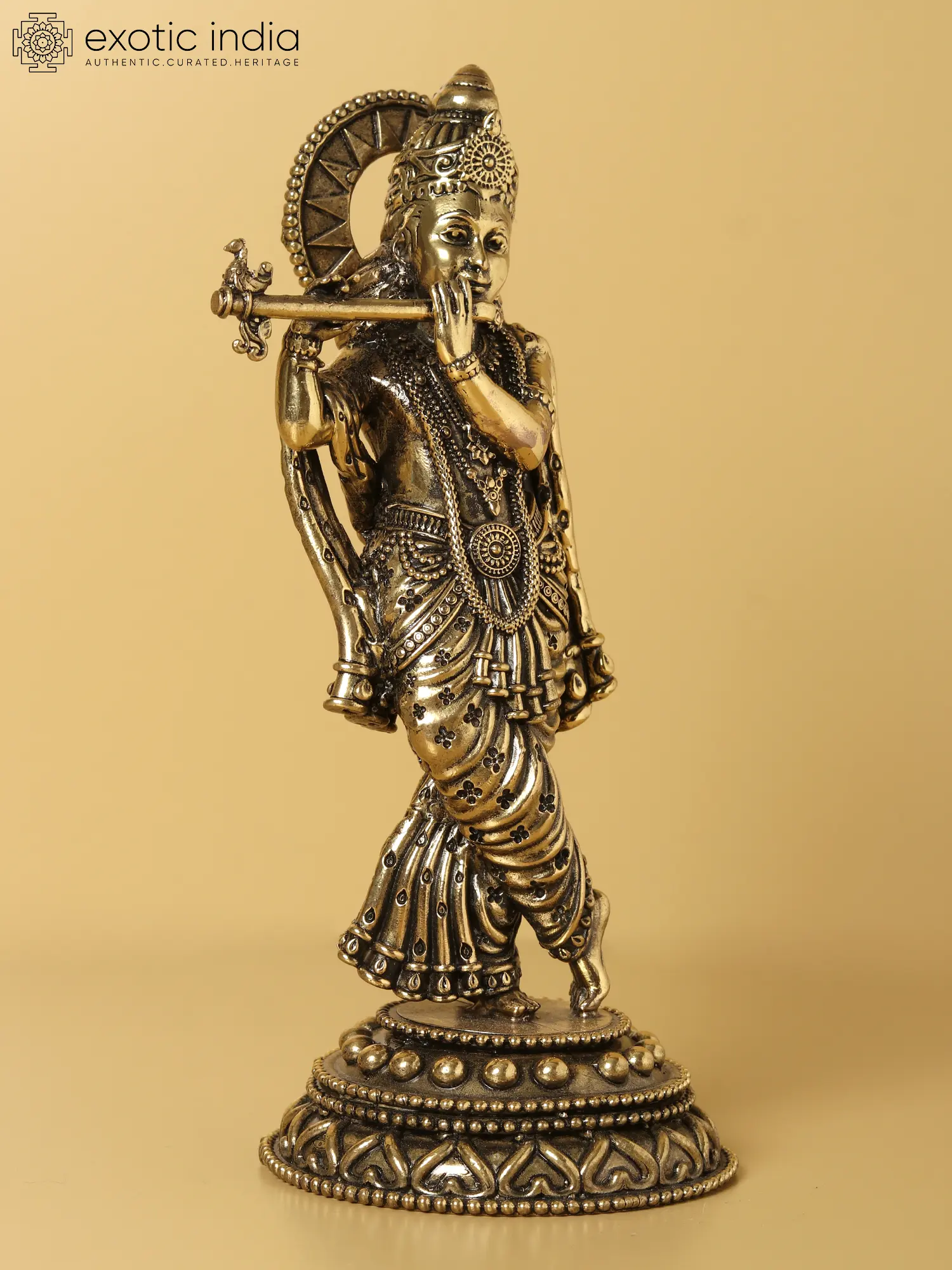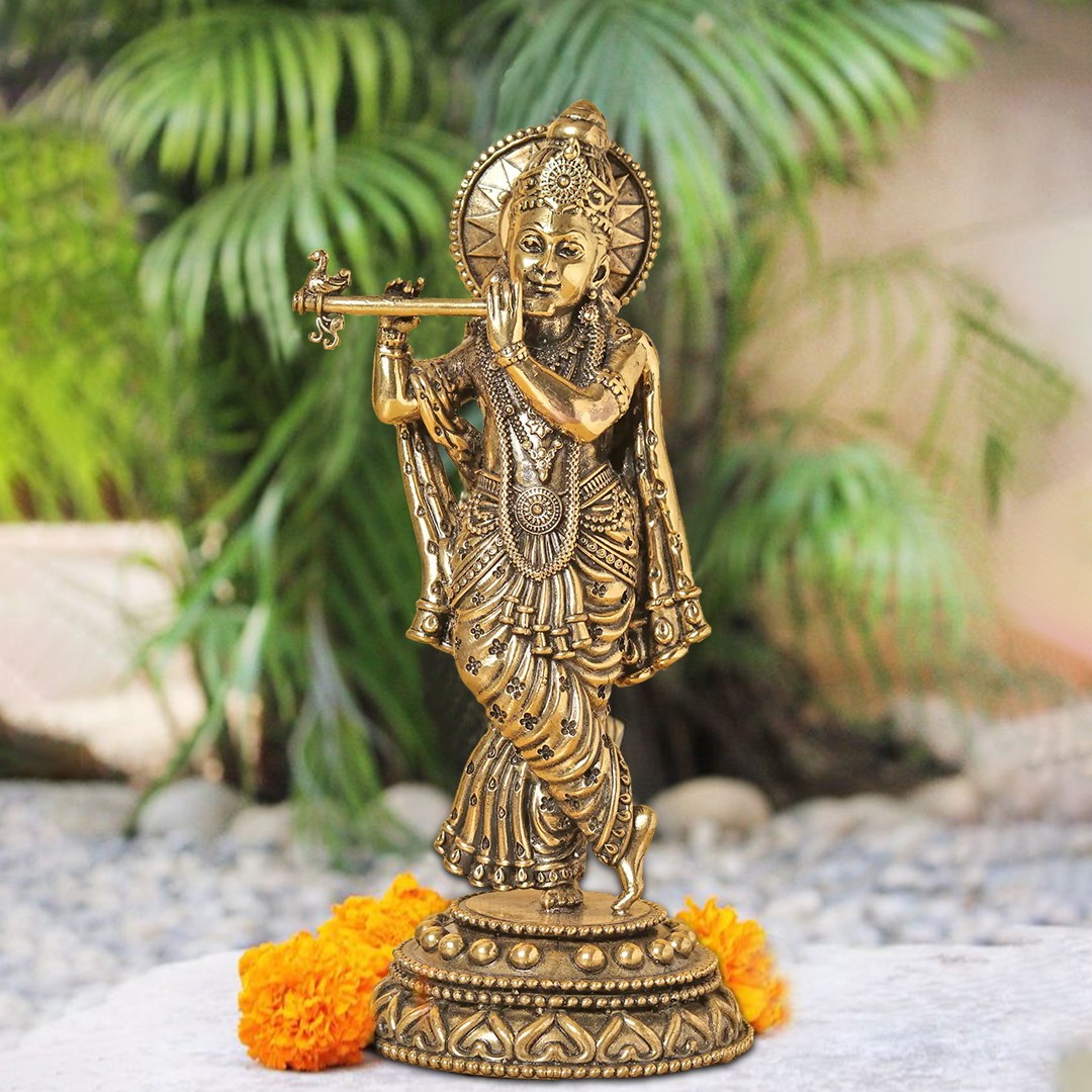 This stunning brass creation depicts Lord Krishna standing in the Natvar Asana posture, an embodiment of celestial elegance upon an ornate pedestal. Cloaked in regal attire, Krishna dons a “Kireedam Mukut”, adorning opulent jewels that shimmer like constellations. A symphony of spirituality unfurls as He breathes life into the cosmos, playing the flute with ethereal finesse. His floral garland, an ode to nature's bounty, embraces creation in its fragrant embrace.