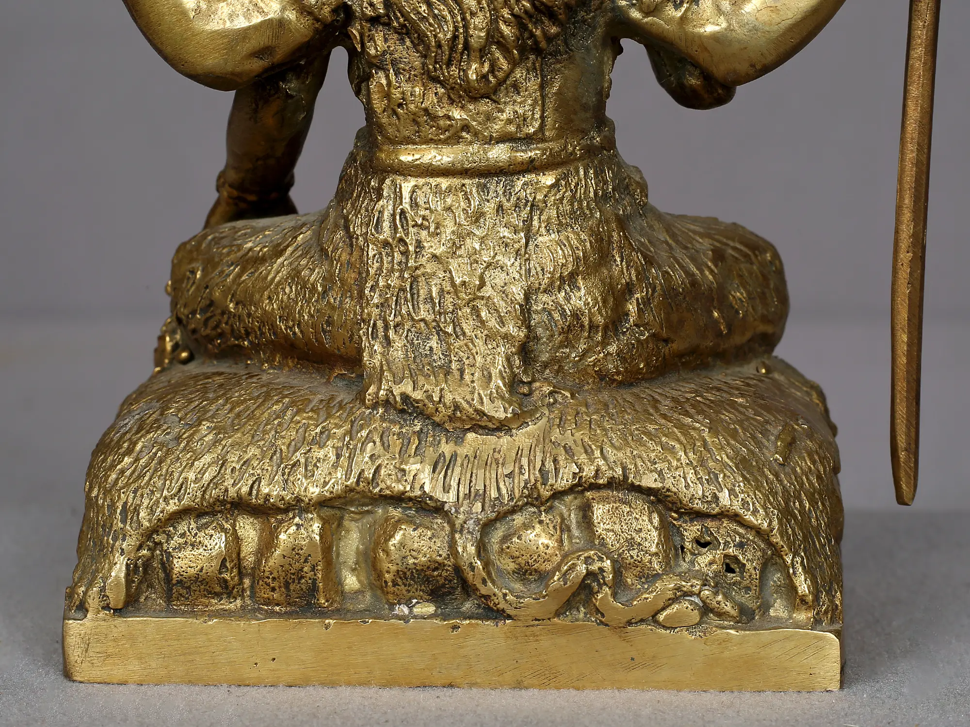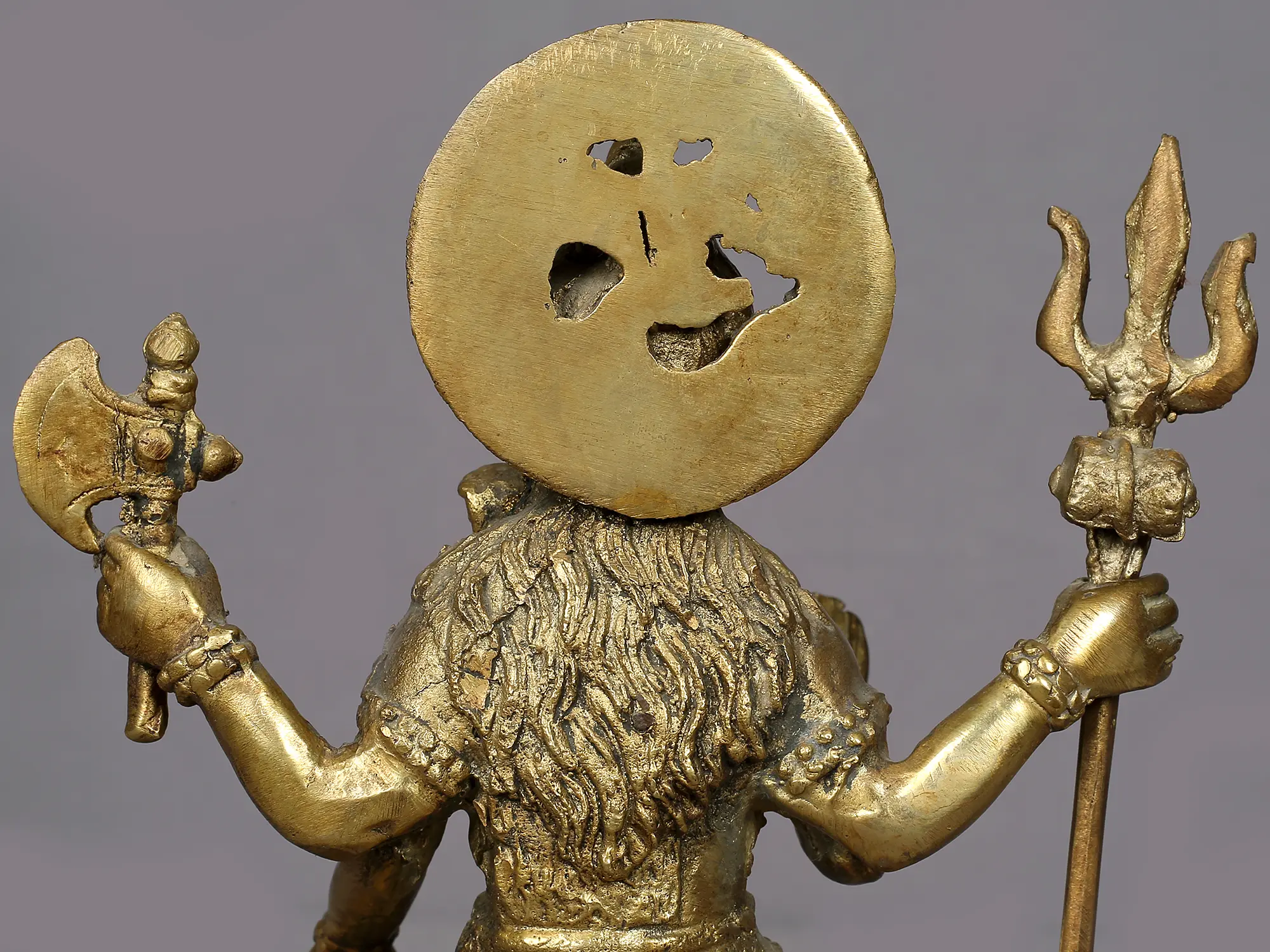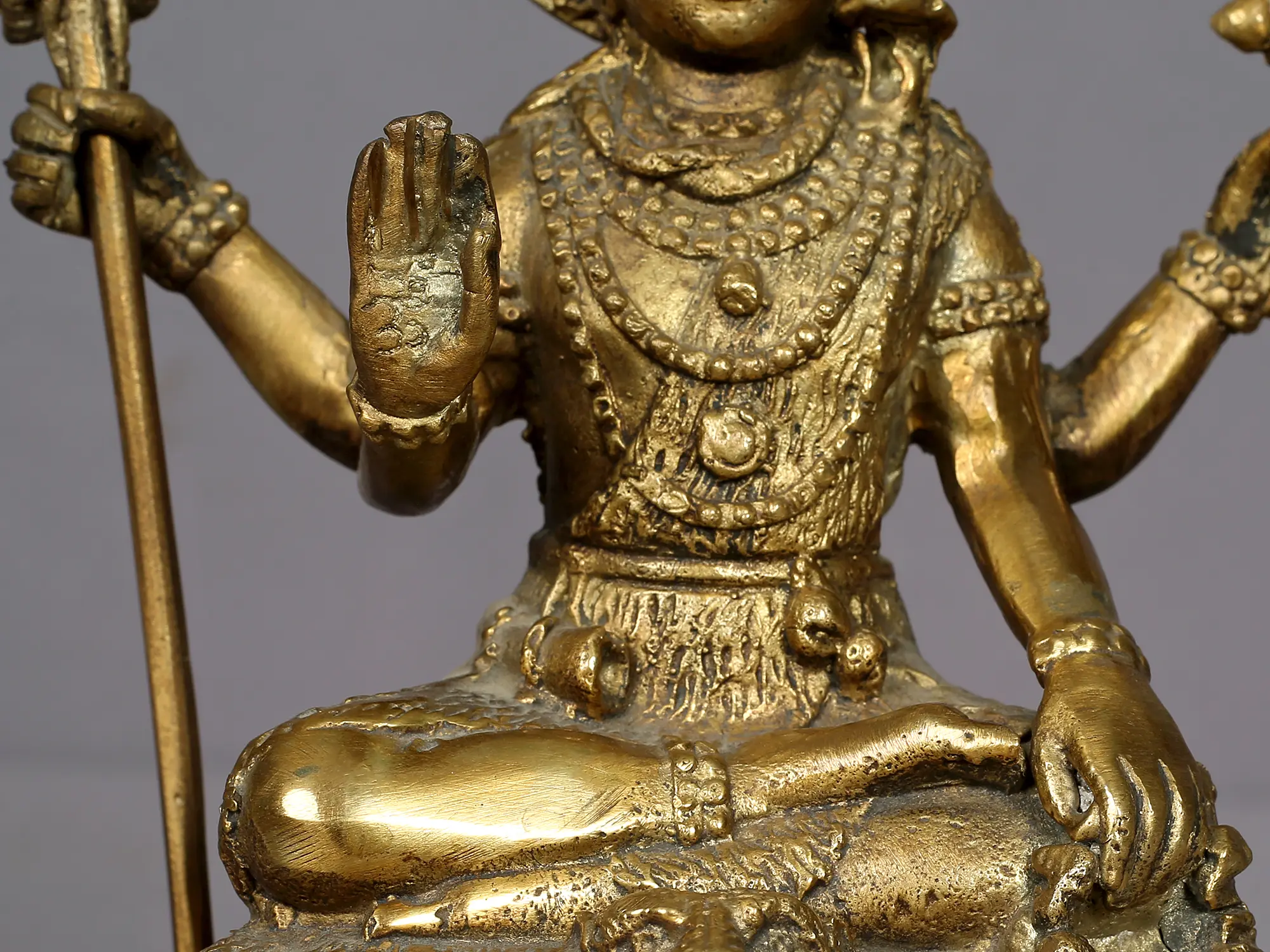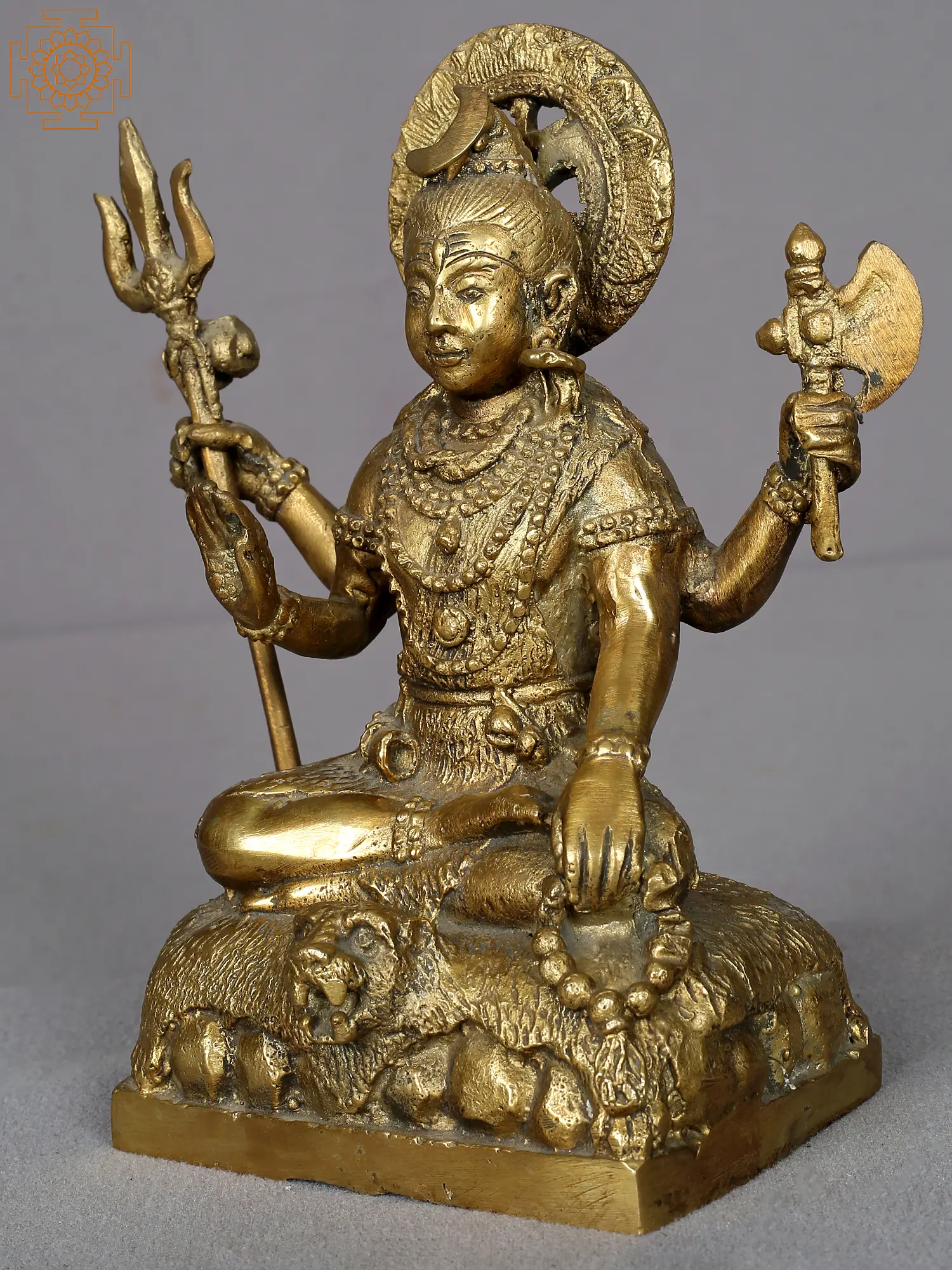 He is seated in a yogic posture, with both legs folded atop the skin of a cheetah. In two of his hands, Shiva wields the Trishul (trident) and an ax. The other two hands are raised in the abhaya mudra, signifying protection and fearlessness, reassuring his devotees that they need not be afraid. This mudra conveys divine safeguarding and the dispelling of fear for those seeking solace in Lord Shiva. His adornments include serpents adorning his hands and neck, a half-moon (ardh chand) and the Ganges River (Ganga Maiya) on his head.