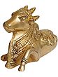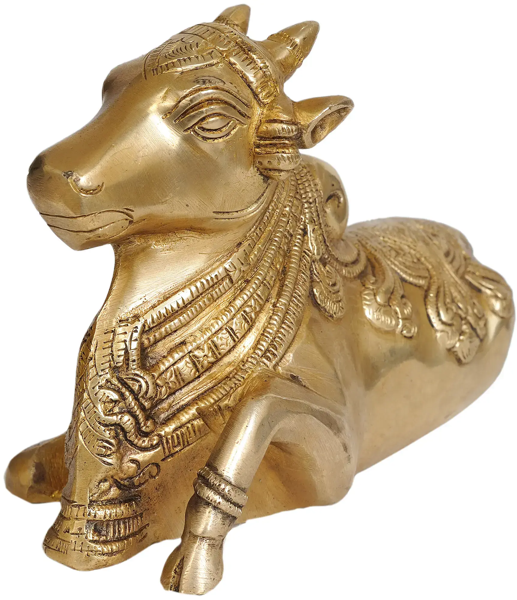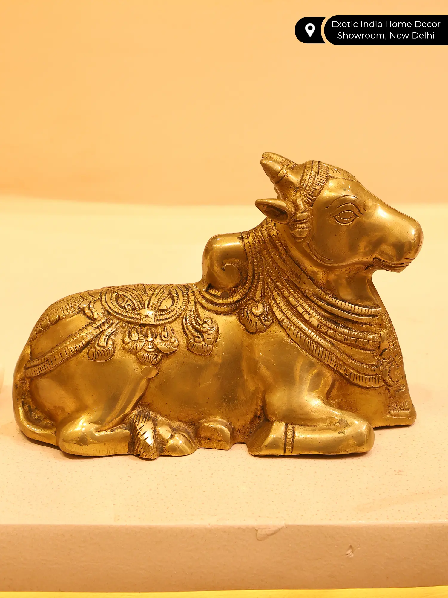 Handcrafted with devotion, the brass Nandi sculpture captures Shiva's sacred bull, the embodiment of unwavering devotion. Nandi's eyes reflect his deep reverence for Lord Shiva. His presence is both that of a guardian and a faithful friend. His posture signifies readiness to serve and obey. As Shiva's Vahana, Nandi's significance lies in his ability to traverse the physical and spiritual realms. This artwork invokes the essence of devotion and loyalty, inspiring us to emulate Nandi's unwavering commitment to the divine.