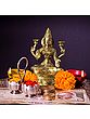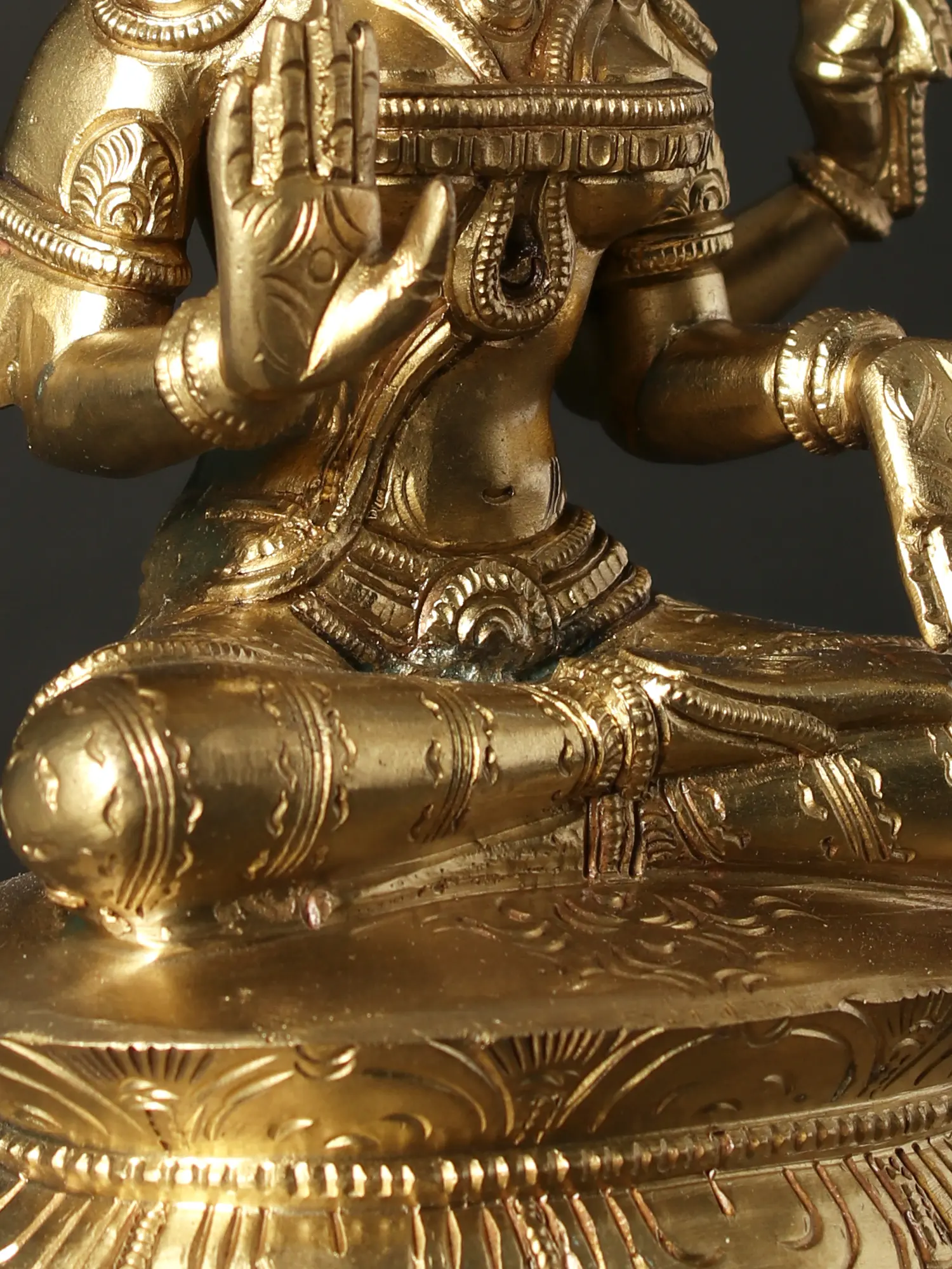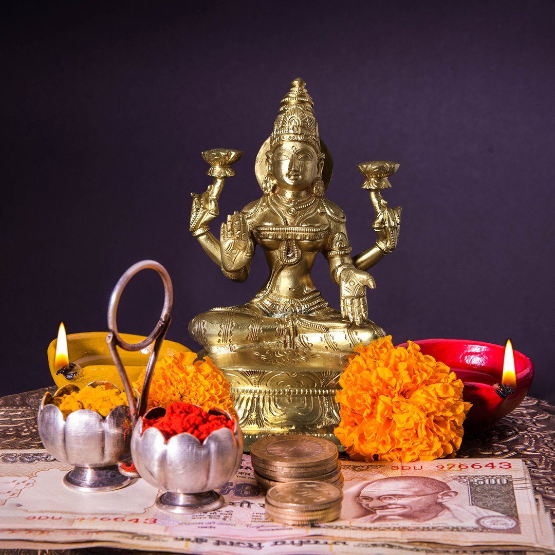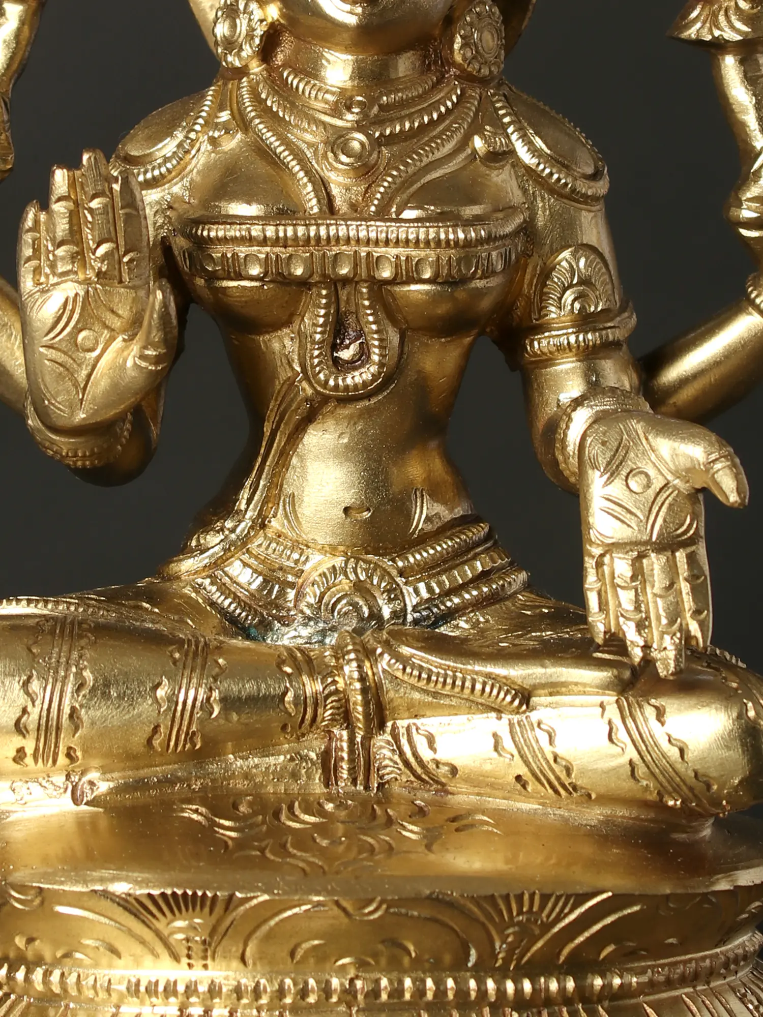 “Padmasana”- seated on a lotus throne, in the lotus pose, goddess Lakshmi in this superfine bronze icon is an auspicious image of the divine Devi, who is the home of fortune, abundance, virtues, and Dharma. Adorned with a long Kiritamukuta crown, dehri or circular earrings, necklaces, Kuchabandha or breastband, armlets, waistband, and a beautiful dhoti, goddess Lakshmi appears to be a celestial queen. In her four hands, Devi Lakshmi has her characteristic attributes- two lotuses symbolizing purity, divinity, and fertility, as well as the origin of the Universe and time, which are nourished by the ever-auspicious Sri Lakshmi. With her primary hands in Abhaya (gesture of fearlessness) and Varada (gesture of giving boons), goddess Lakshmi in this bronze statue stills the troubled minds of her devotees, assuring them of her omnipresent powers.