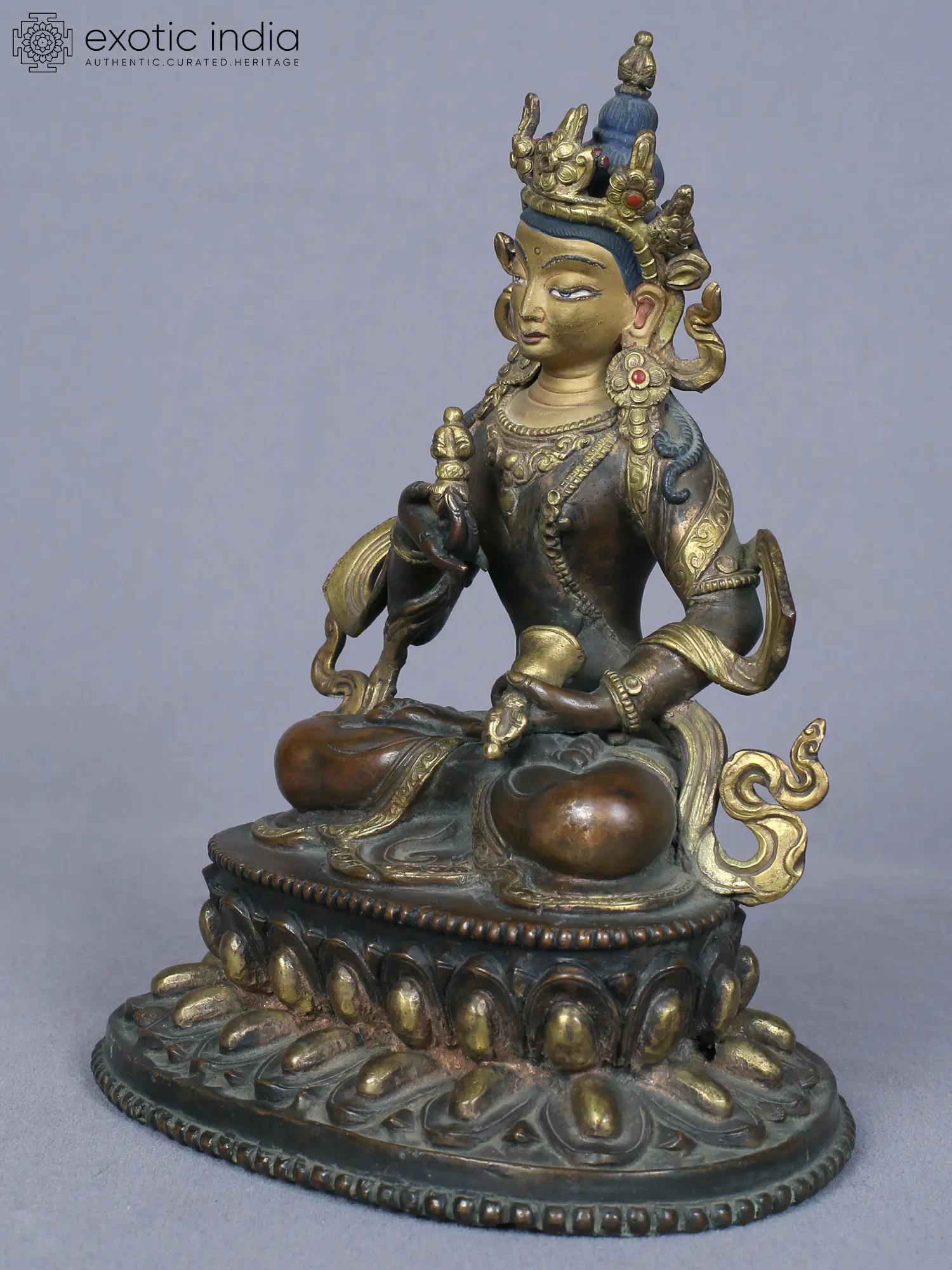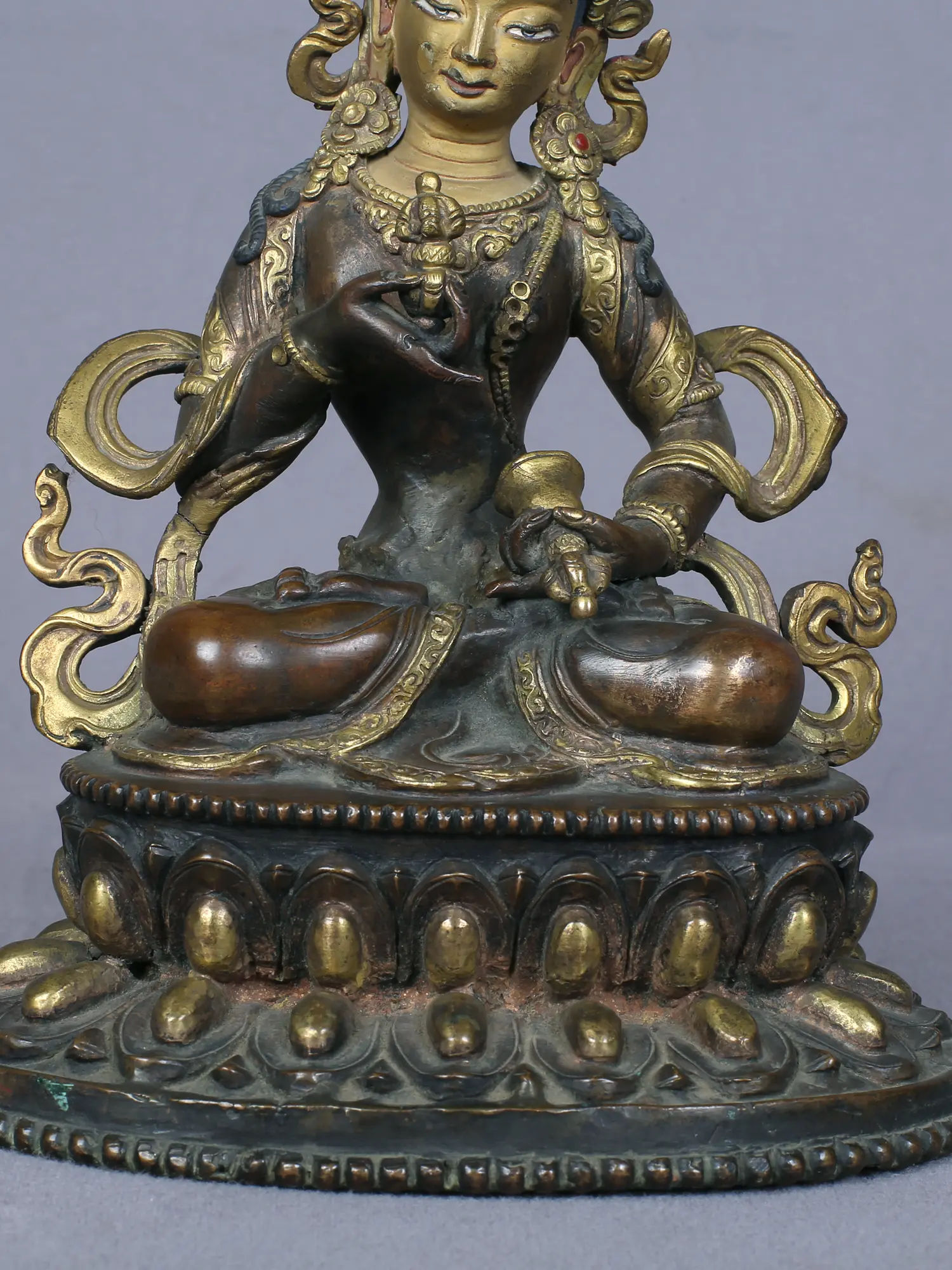 In the luminous realm of Buddhist deities, Vajrasattva shines with an ethereal brilliance, embodying the essence of purity and transformation. Adorned in flowing white robes that symbolize immaculate wisdom, Vajrasattva stands resplendent against the backdrop of spiritual radiance. With a tranquil countenance and eyes ablaze with boundless compassion, he holds the vajra, the symbol of enlightened awareness, in his right hand and the bell, symbolizing wisdom, in his left.