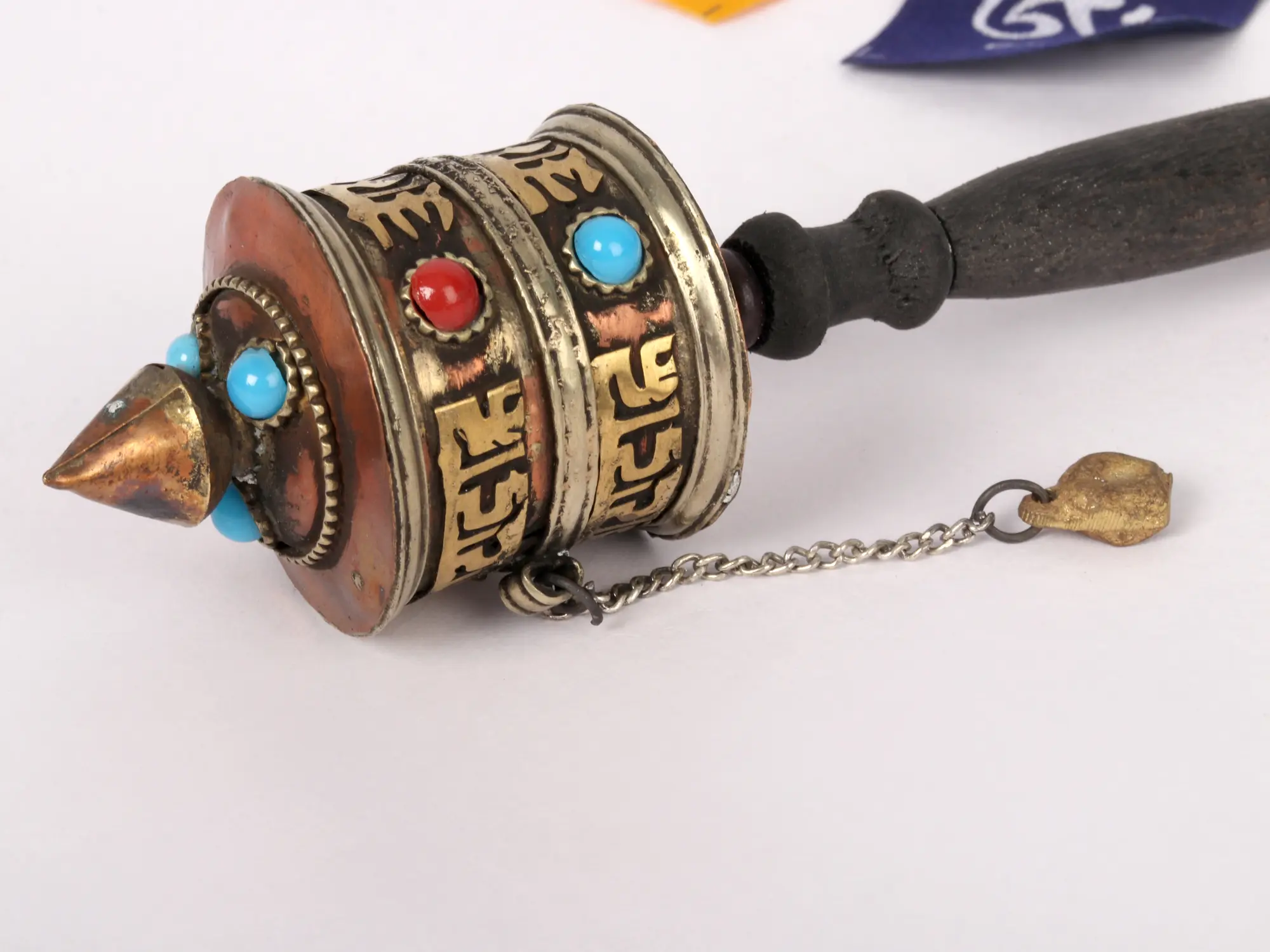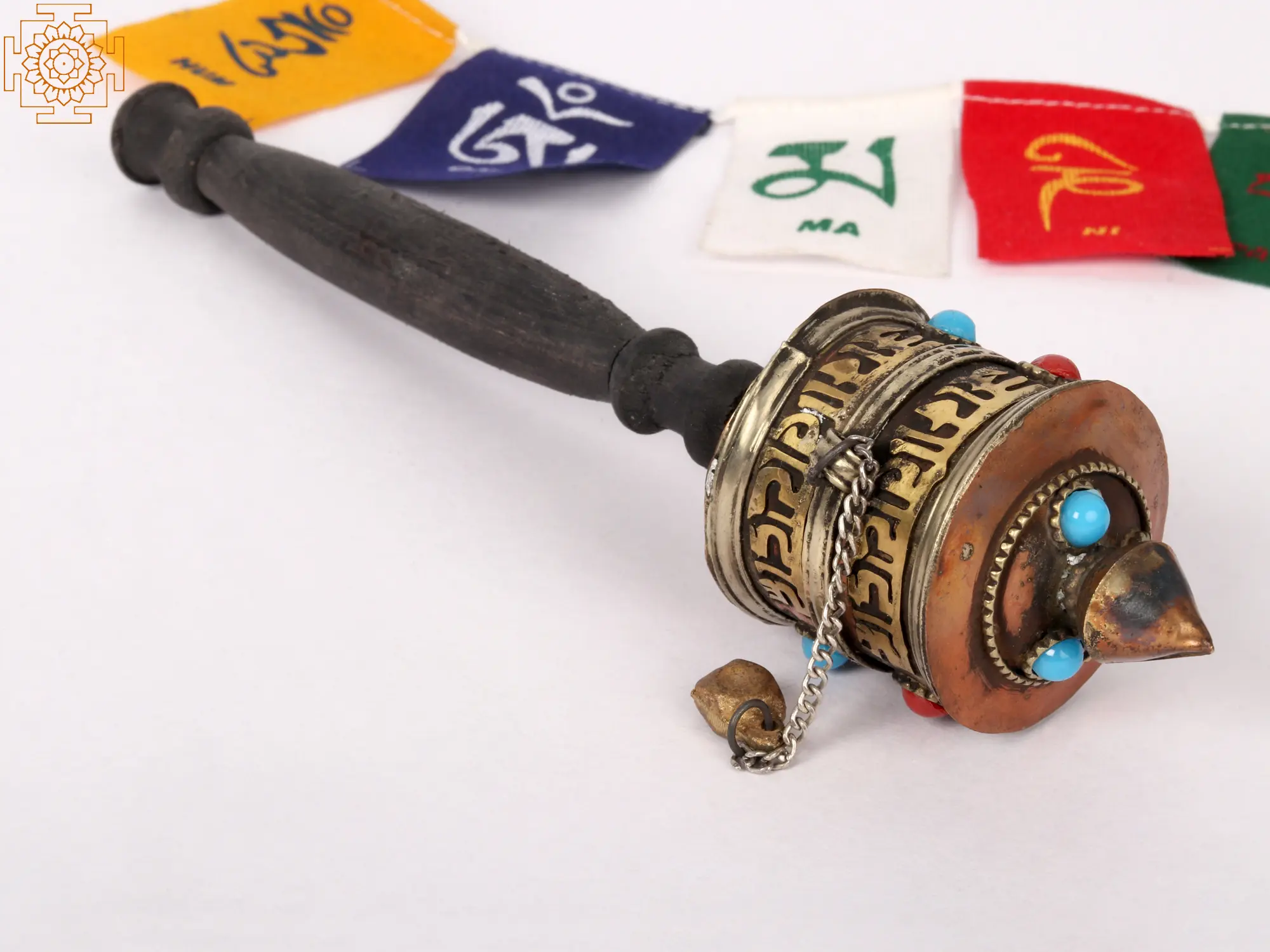 Originating from the spiritual heartland of Nepal, this prayer wheel carries with it the lineage of centuries-old Buddhist traditions. The creation of such items is not merely an act of manufacturing but a sacred undertaking, often performed by artisans who imbue their work with devotion and intention. The wooden handle, worn smooth from the hands of previous practitioners or the artisan's touch, speaks to a deep connection with this spiritual heritage. Holding and turning this prayer wheel connects you to the vast ocean of Buddhist wisdom and the countless beings who have found solace and liberation through these practices. It is a beautiful invitation to engage with the path of enlightenment, one mindful turn at a time.