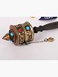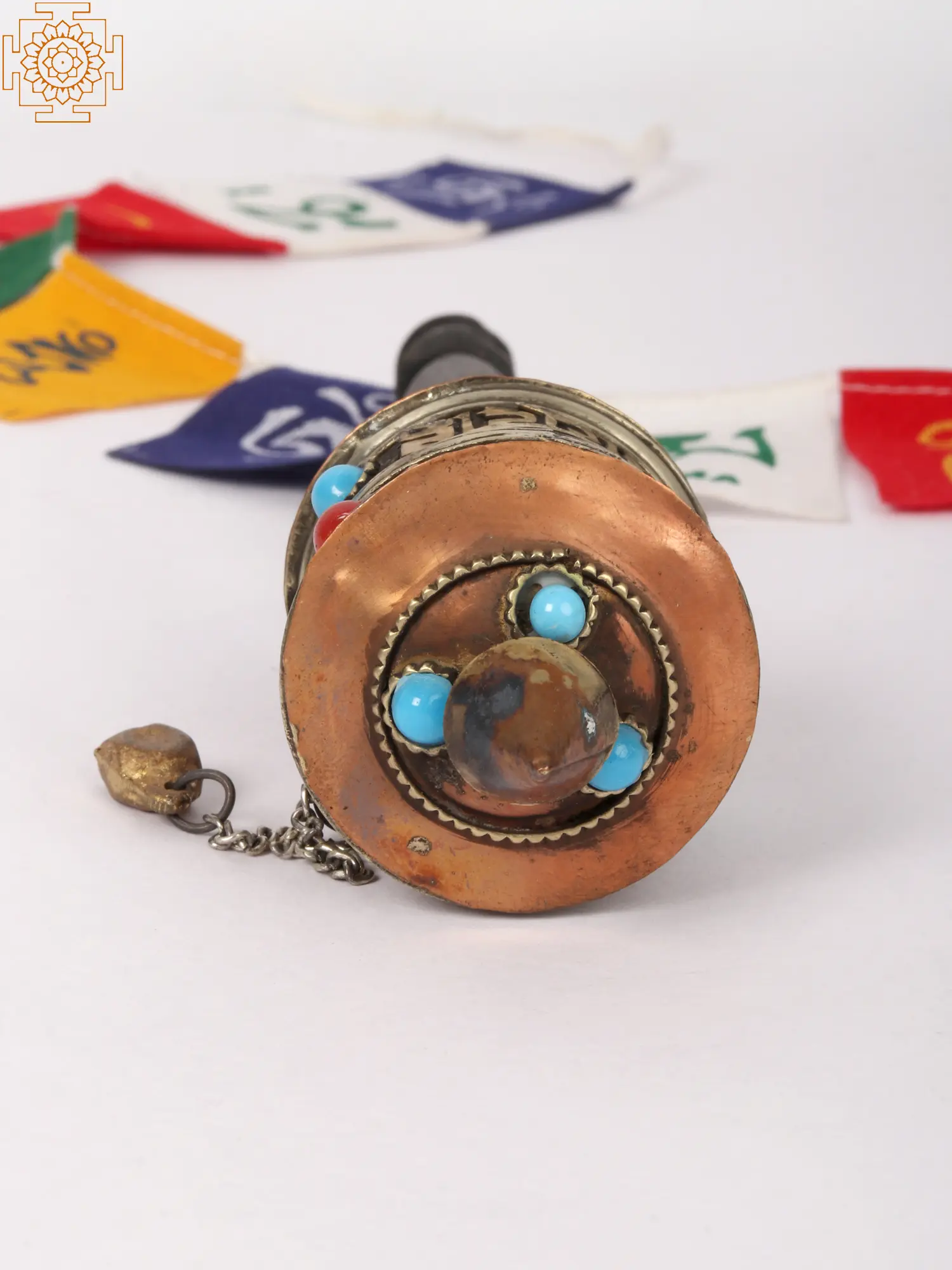 7'' Buddhist Prayer Wheel with Mantra and Stone Work | Copper and Wood | From Nepal