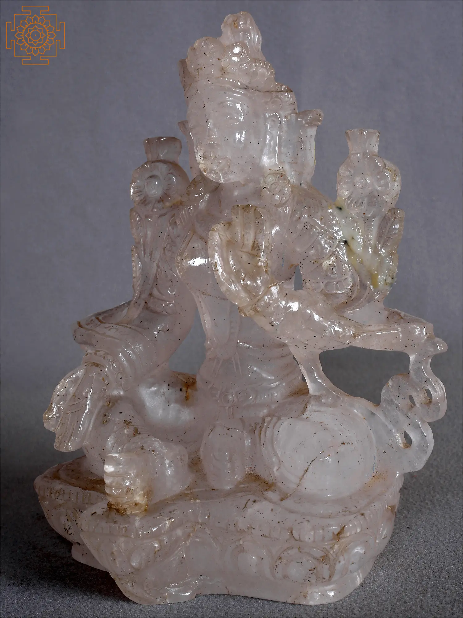 Crafted from the purest crystal, this exquisite statue embodies the serene and compassionate form of Green Tara, a revered bodhisattva in Mahayana Buddhism. Hailing from the spiritually rich landscapes of Nepal, this piece is more than just an object of devotion; it is a conduit of benevolent energy and a testament to the artistry of Himalayan craftsmanship. The translucent crystal, reminiscent of clear mountain streams, allows light to pass through, imbuing the deity with an ethereal glow that signifies her luminous presence. Each detail, from the gentle curve of her smile to the intricate adornments of her crown, has been meticulously hand-carved, reflecting the deep respect and devotion of the artisan.