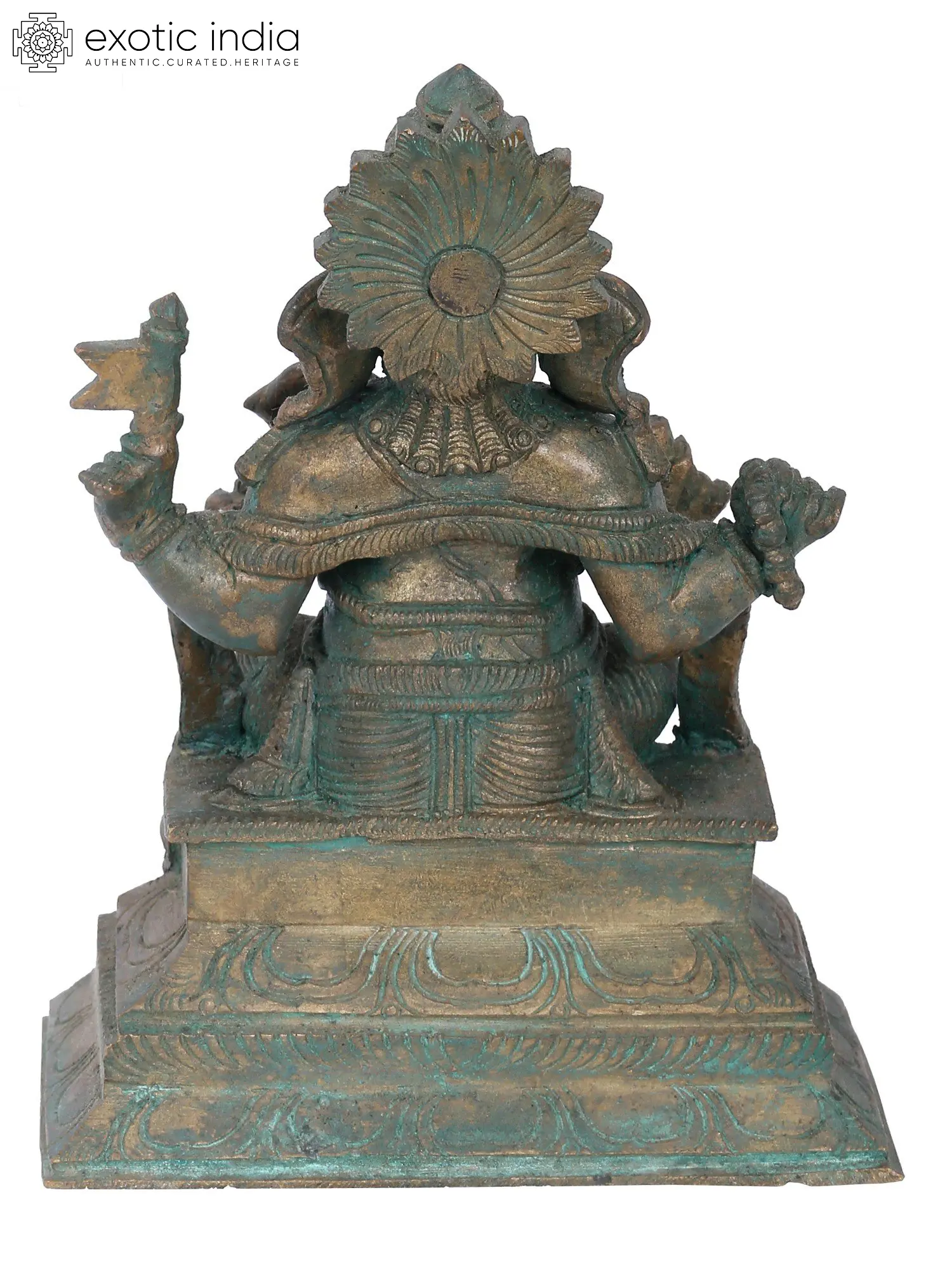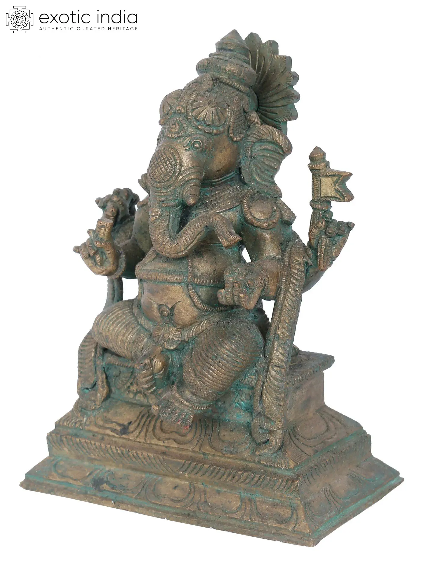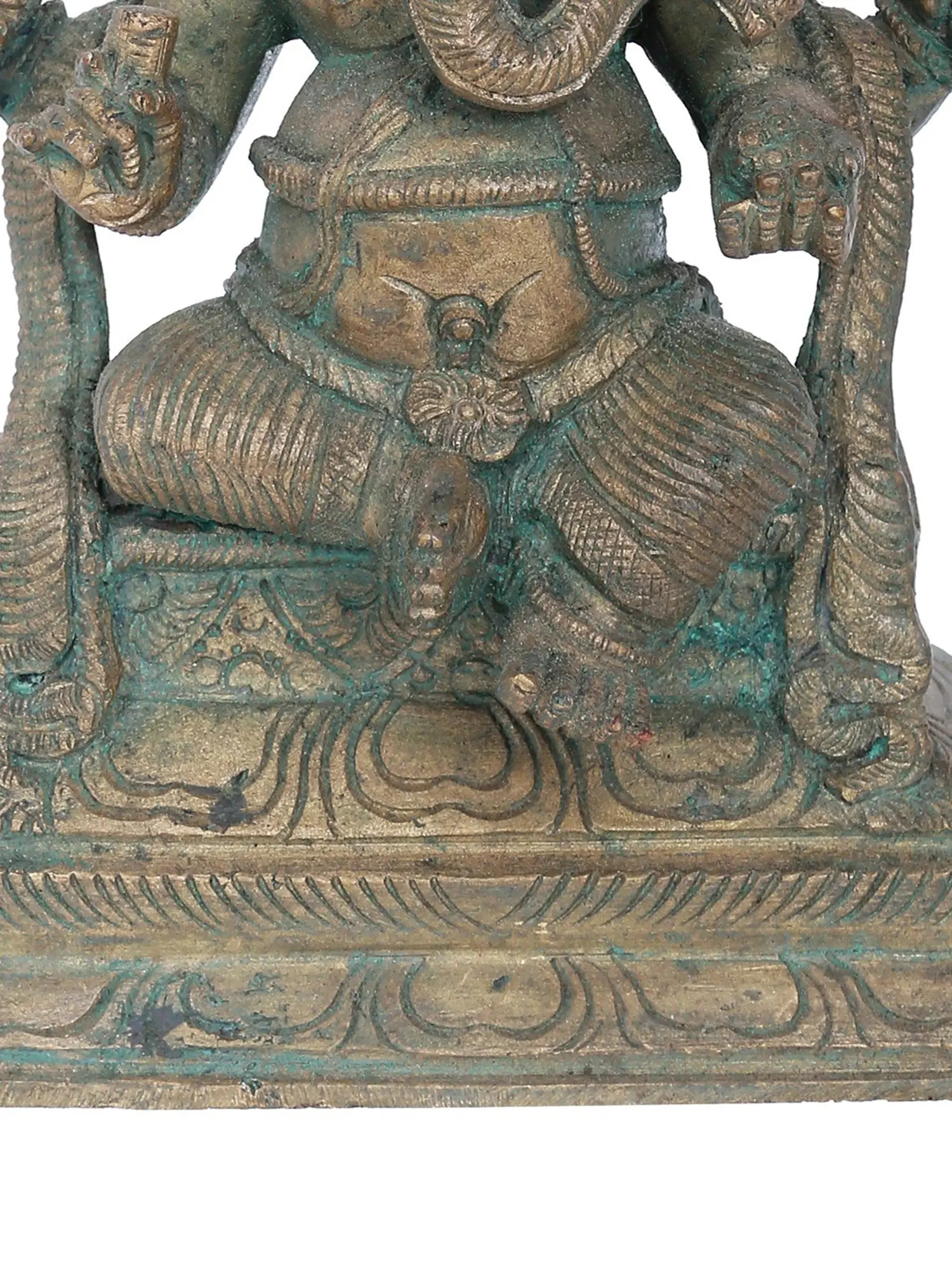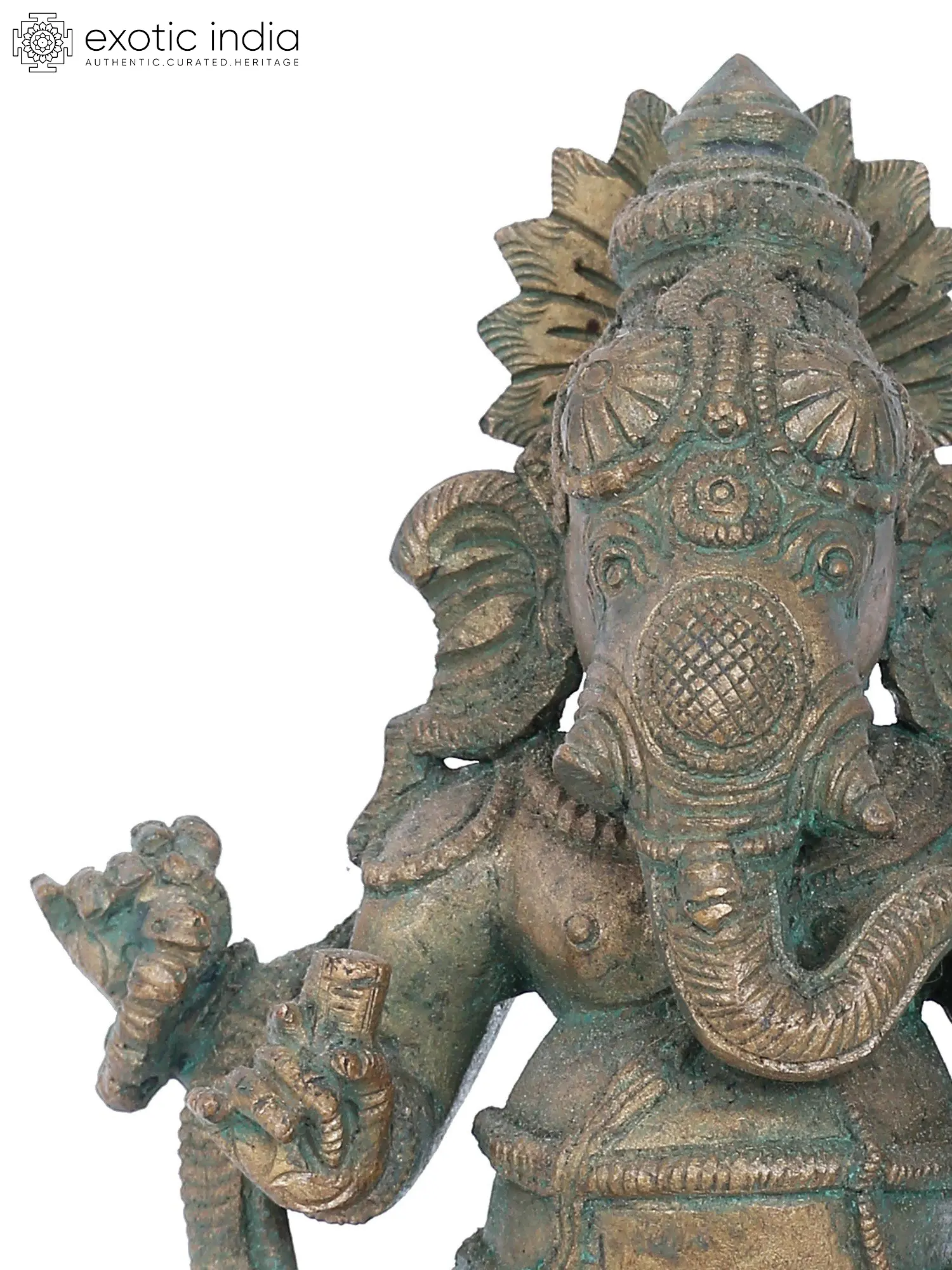 In this form, Lord Ganesha has four hands, one of which is holding his just broken tusk, while the other three are holding a hatchet, a japa mala of Rudraksha beads, and Laddu (sweet balls). The green patina tint of the statue has been created artificially to give the statue an antique look. Let the intricate details of this sculpture evoke a sense of maternal love and familial harmony, bringing the blessings of Parvati-suta into your sacred space.