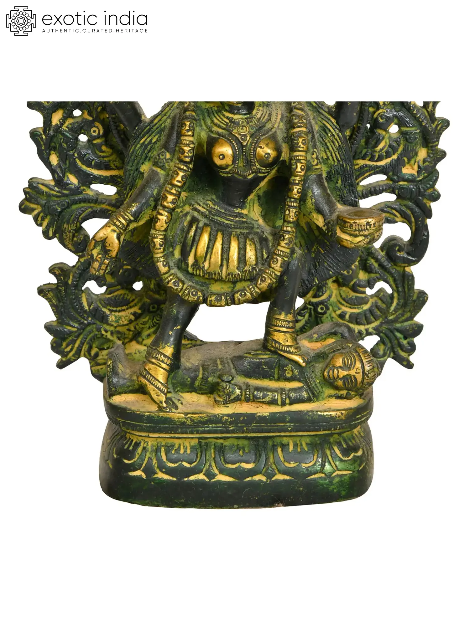 The brass depiction of Kali captivates with its striking portrayal of the goddess's ferocious beauty. In her image, dark and fearsome attributes harmoniously coexist with an undeniable allure. Her numerous arms brandish an array of weapons, symbolizing her formidable power to obliterate negativity and ignorance. Disheveled hair adds to her untamed appearance, yet within this ferocity lies an enigmatic magnetism, embodying her dual role as both a destructive and protective force. Kali, immortalized in brass, serves as a potent symbol of life's dualities and the goddess's pivotal role in creation and destruction, inspiring both reverence and wonder.
