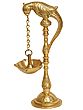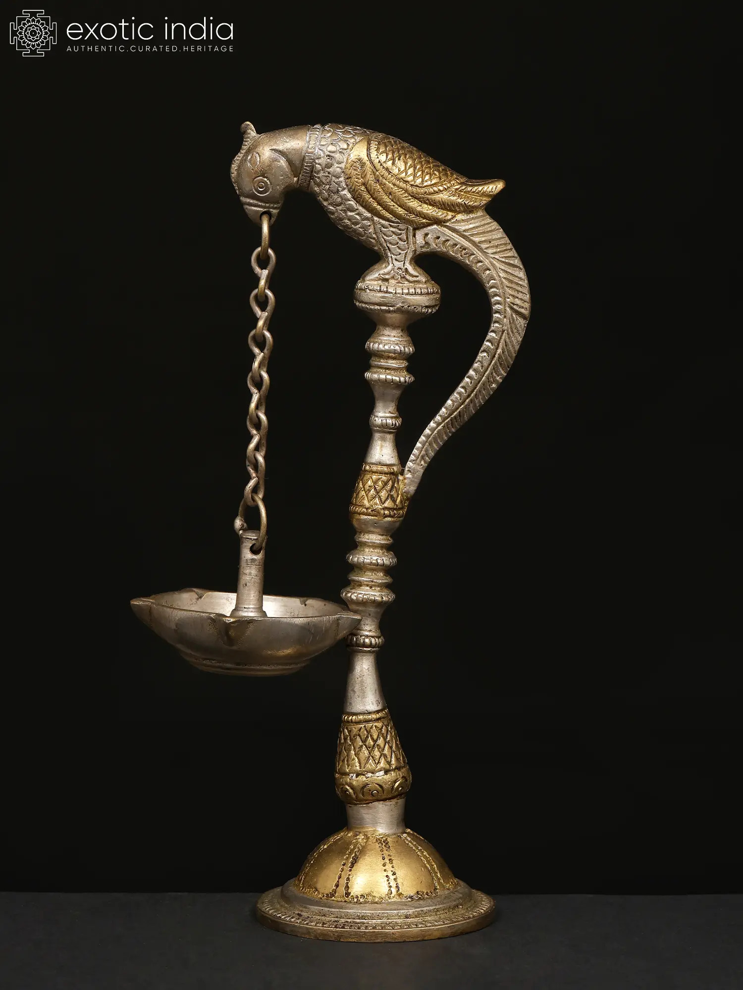 In Indian art, parrots are often revered for their association with love, beauty, and knowledge. They symbolize devotion and fidelity, making their presence in this lamp not only visually appealing but also imbued with cultural and spiritual significance, creating a captivating and sacred ambiance. This Five-Wick Parrot Hanging Lamp with Stand in Brass is a remarkable handmade creation. This unique lamp features a parrot perched atop, holding a hanging lamp in its beak, adding a whimsical touch to its design. Decorated in resplendent gold and silver hues, the lamp seamlessly blends elements of columnar and hanging lamps, resulting in a harmonious and eye-catching ensemble.