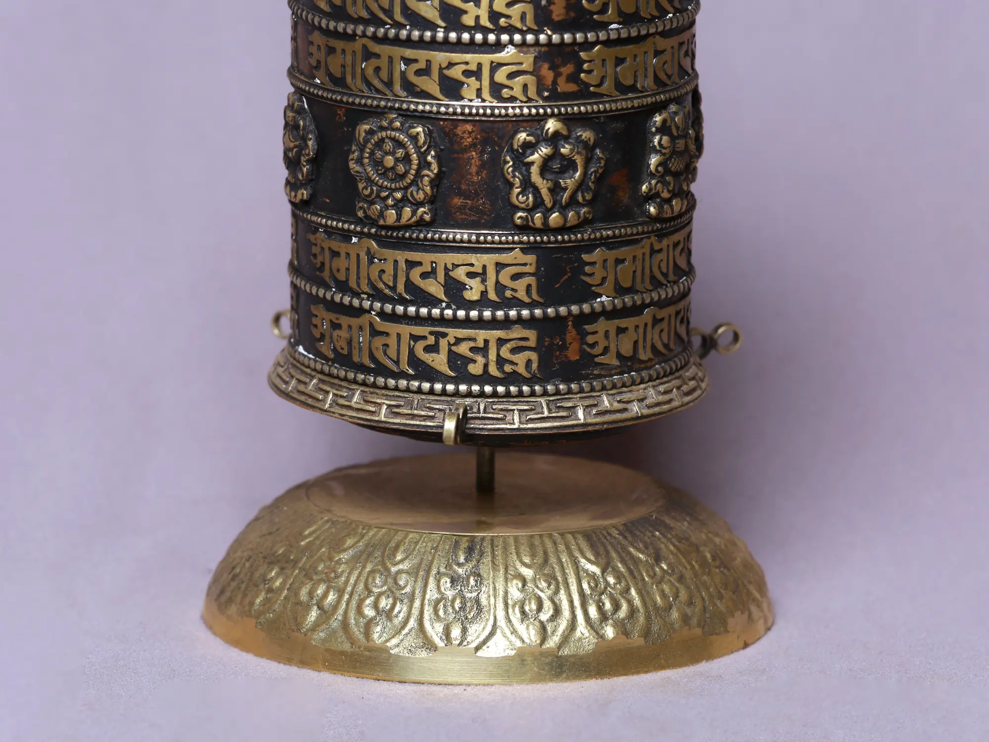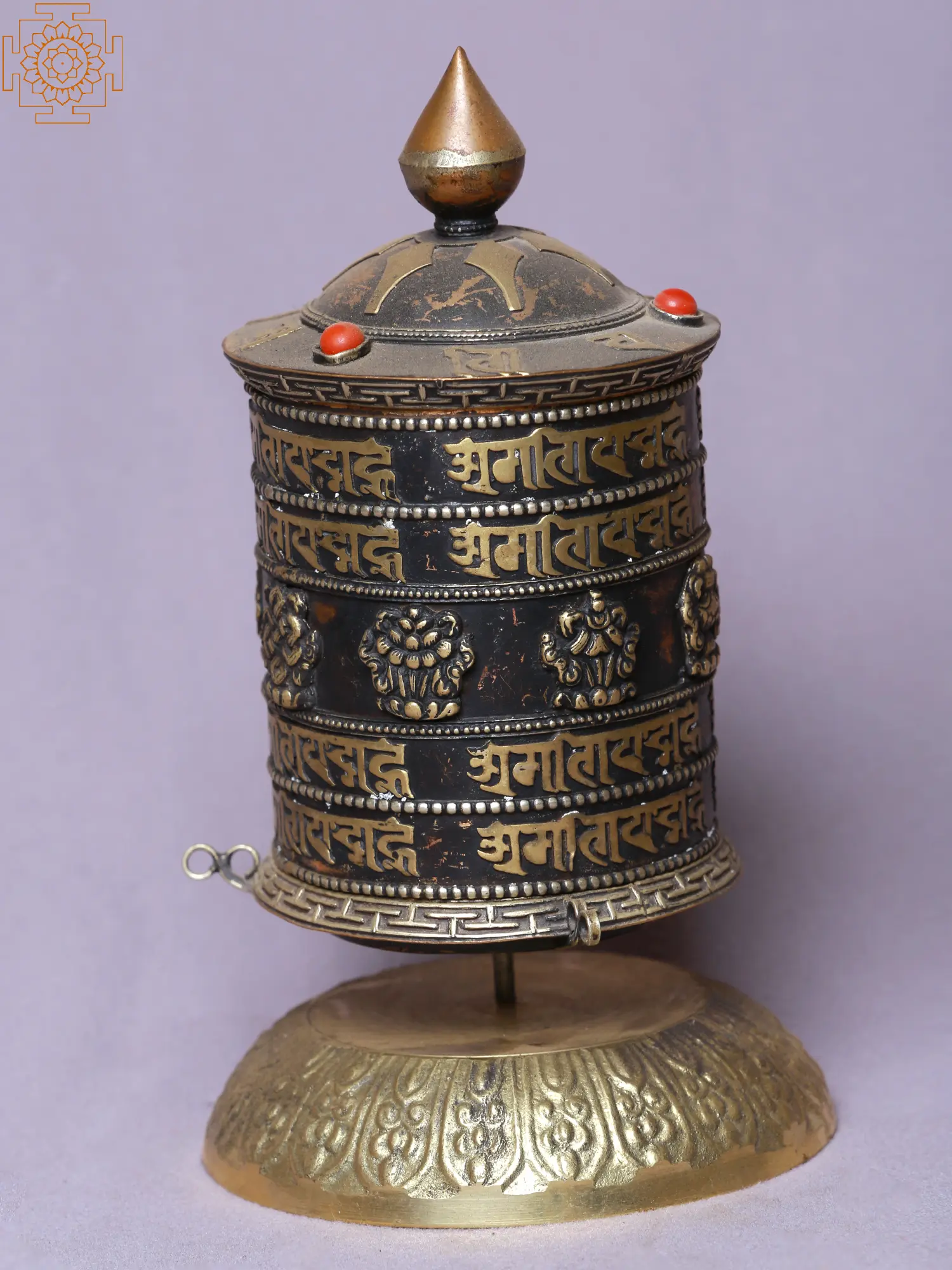 In plenty of cultures, a Prayer wheel is significantly a powerful spiritual tool. There is great significance in this Four Lines Mantra Ashtamangala Copper Prayer Wheel. It has been crafted in Nepal, this exquisite prayer wheel features the Ashtamangala mantra, a sacred mantra consisting of eight auspicious signs. The wheel is adorned with copper, and coral crystals, enhancing its beauty and spiritual energy. Each of the eight auspicious signs is intricately carved onto the centre of the wheel, representing different aspects of Buddhist teachings. By spinning the wheel, one can recite the mantra and evoke positive energy and blessings into their lives and surroundings.