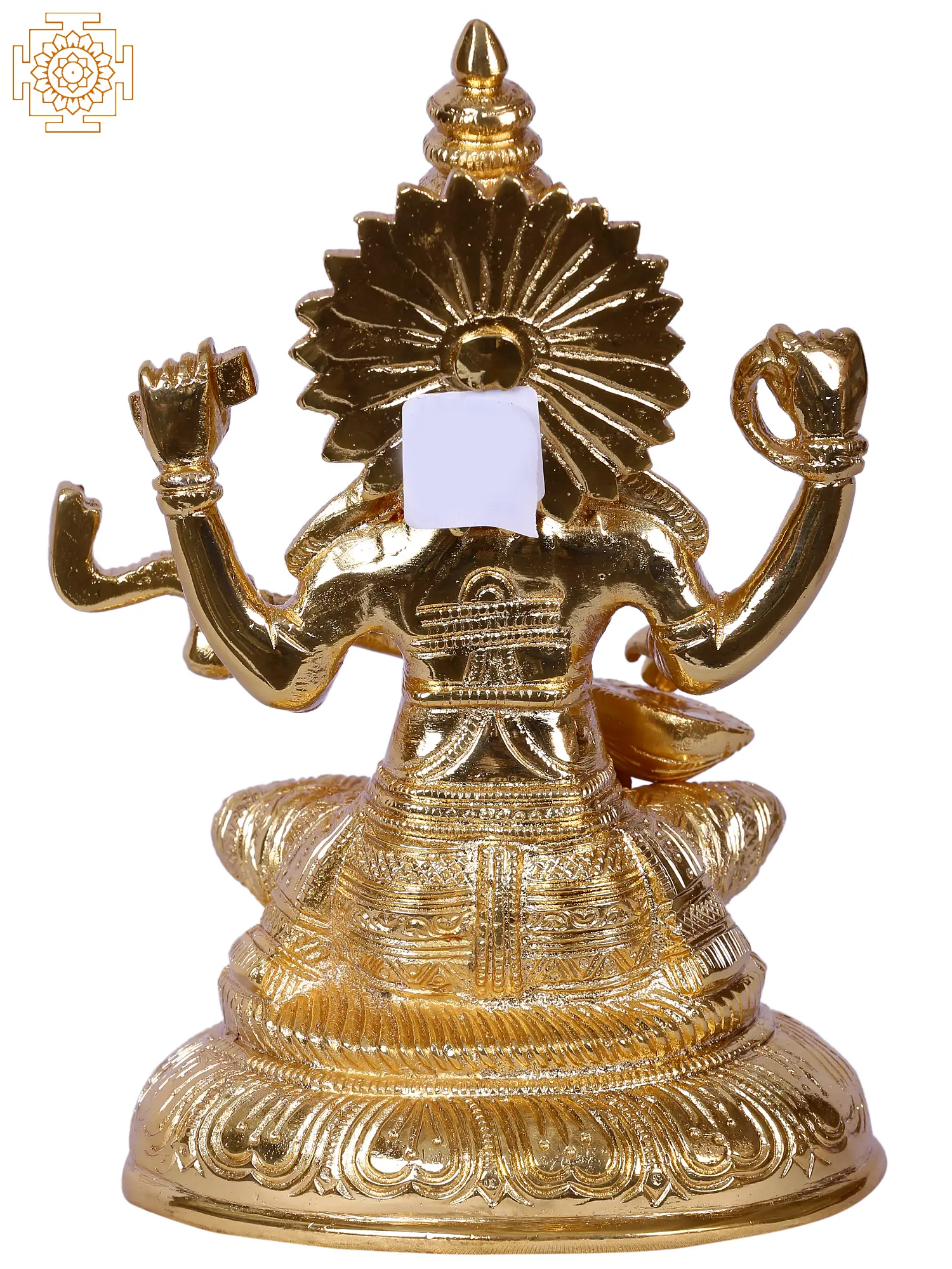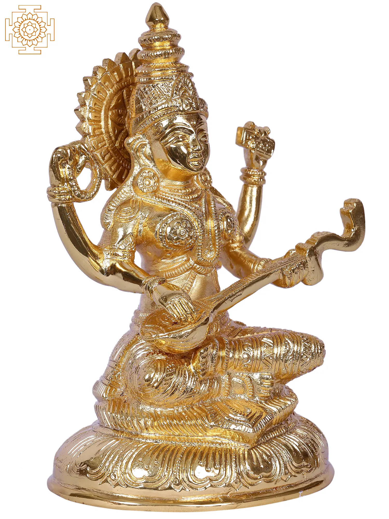 Goddess Saraswati, seated in padmasana, exudes an aura of tranquil wisdom. Her form is adorned with intricate jewellery and flowing garments that cascade gracefully, embodying the flowing melodies of the veena she holds lovingly in her hands. Each detail of the veena is exquisitely captured, symbolising the harmonious blend of creativity and intellect that the goddess bestows upon her devotees.