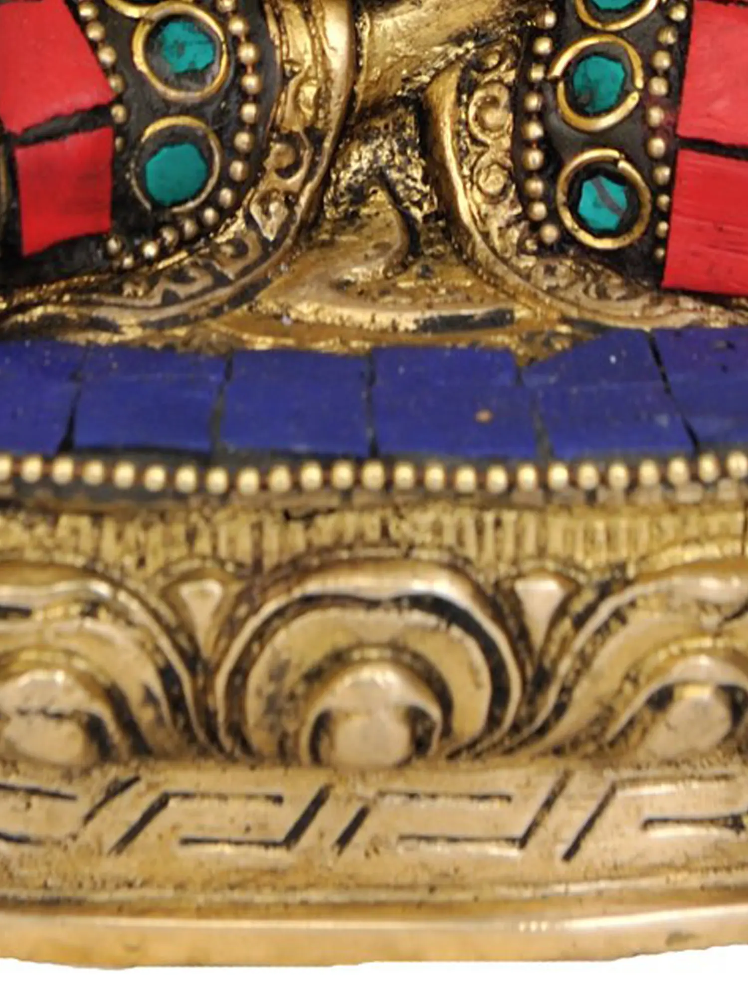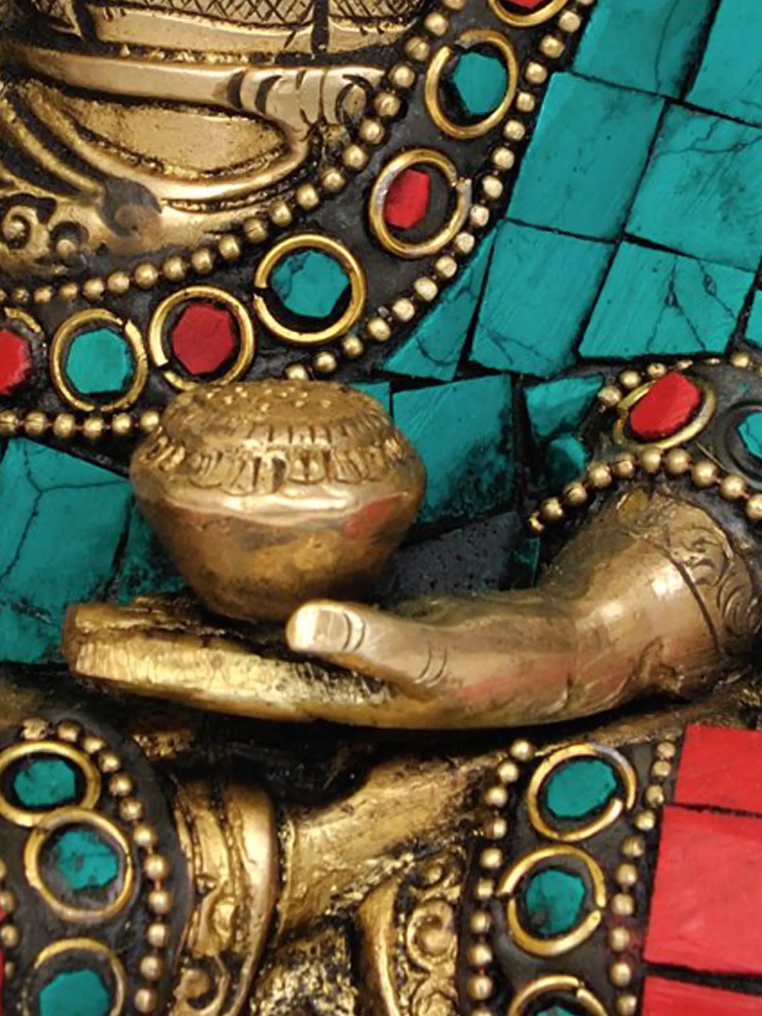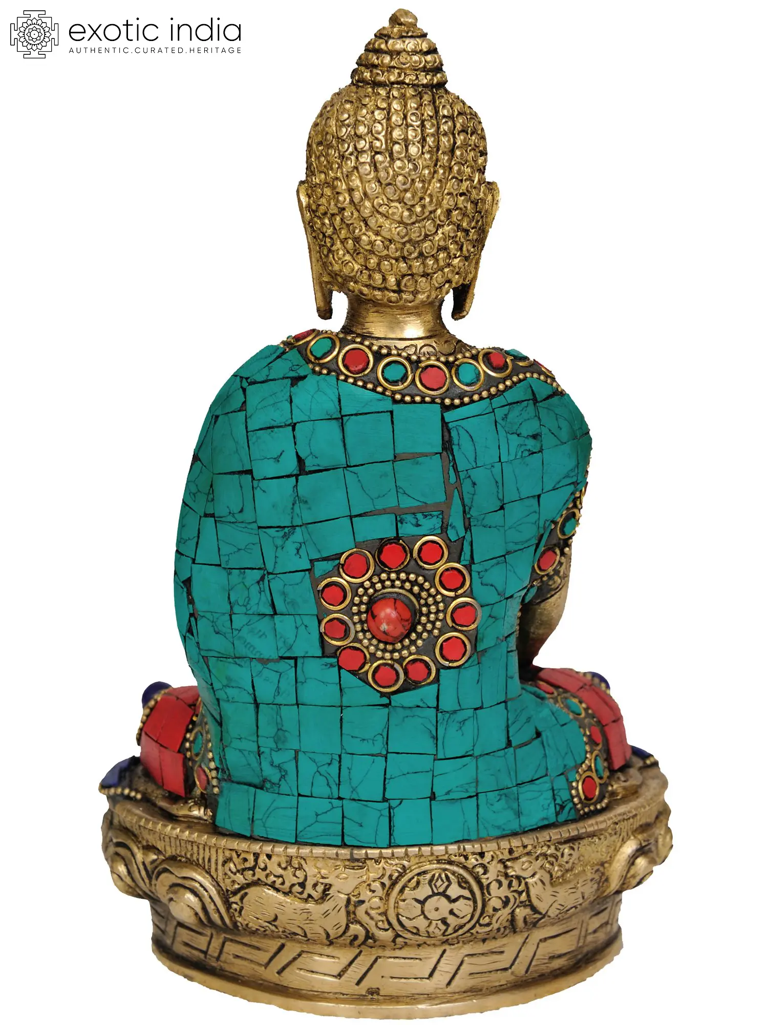 Handcrafted in India, this statue is a masterpiece of traditional artistry. The use of high-quality brass lends a timeless elegance and a substantial feel to the piece. The intricate details of Buddha's serene countenance, the flowing lines of his monastic robe, and the delicate posture are all rendered with exceptional skill. The robe itself is a vibrant display of inlaid semi-precious stones, including deep blues, vibrant reds, and calming turquoises, creating a striking contrast with the warm golden hue of the brass. These colorful inlays not only add to the aesthetic appeal but also symbolize various elements of spiritual well-being and cosmic harmony, echoing the rich symbolism found in Buddhist art and philosophy. The lotus seat upon which the Buddha rests is a classic symbol of purity and spiritual awakening, further enhancing the sacred aura of the deity.