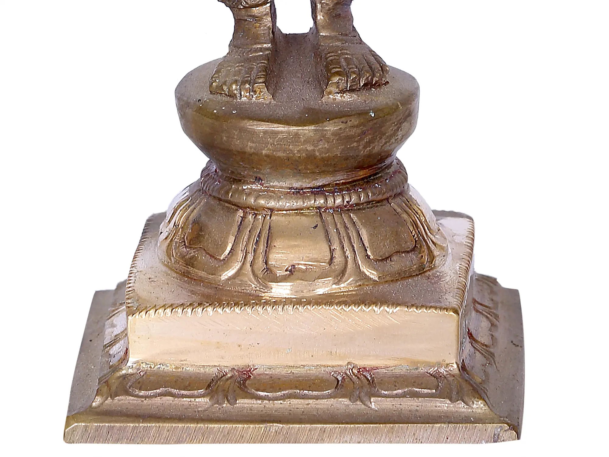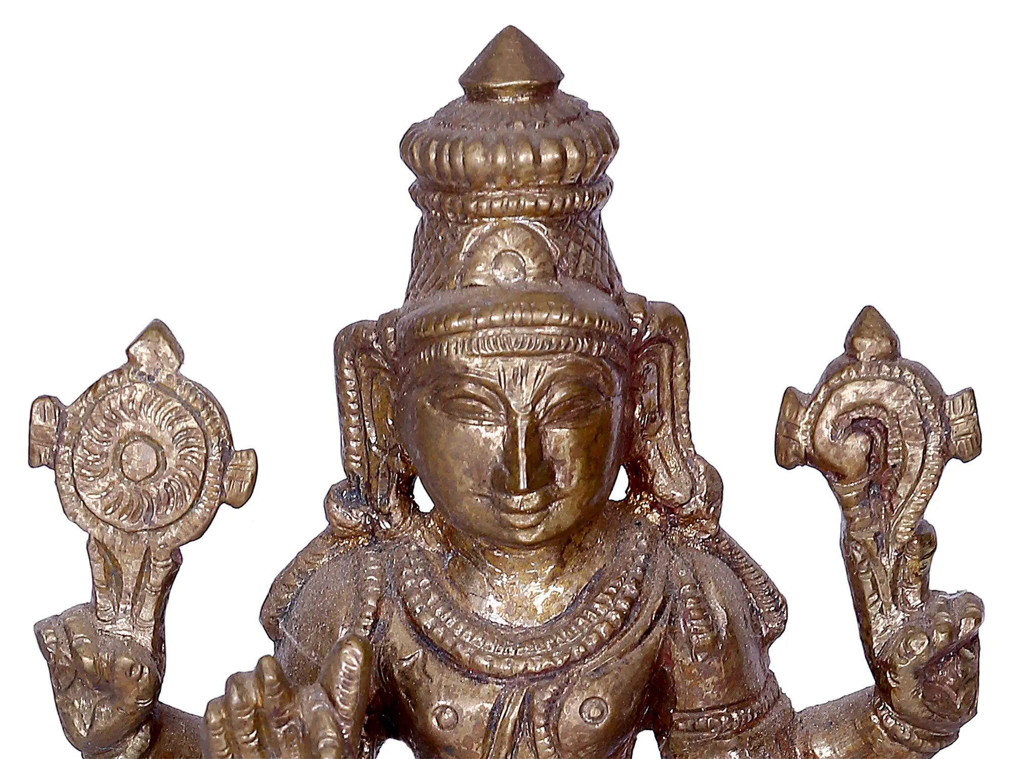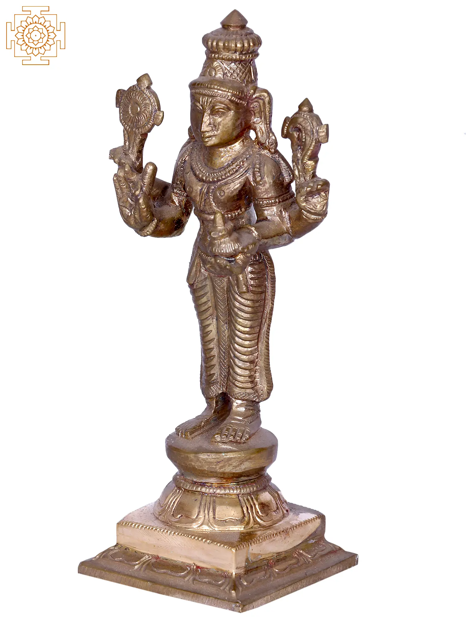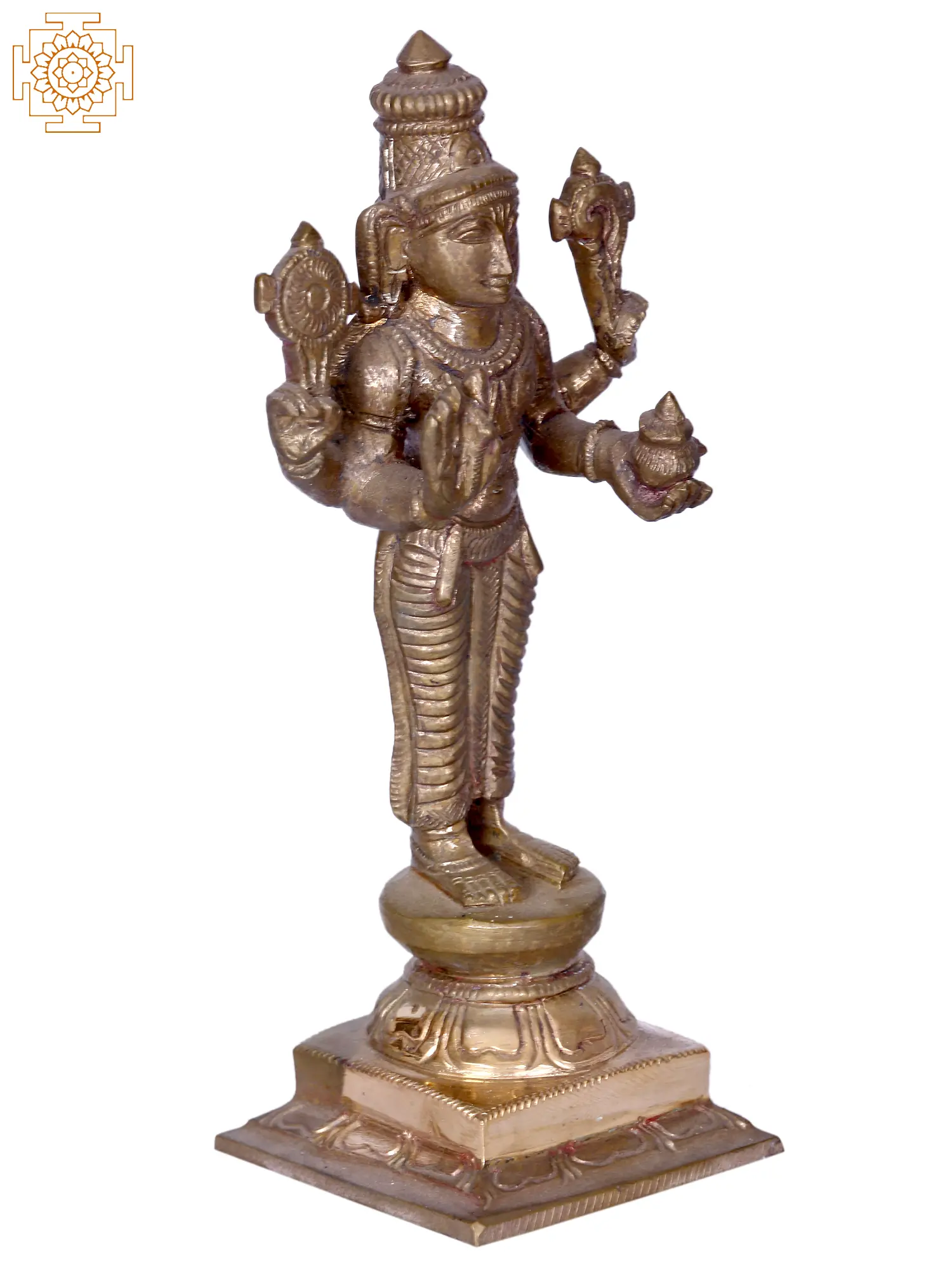 In this bronze creation, Bhagwan Dhanvantari, “the Physician of Gods”, is the incarnation of “Lord Vishnu”. Lord Dhanvantari, the embodiment of health and healing, has been elegantly depicted standing upon a lotus pedestal. In his hands, Dhanvantari, “the God of Ayurveda”, holds a “Disc” symbolising knowledge, a “Conch” denoting the cosmic sound, a Jalauka (Leech) representing medicinal wisdom, and “a bowl of Amrita”, the elixir of life. Draped in celestial vestments, regality befits his divine essence. Dhanvantari’s serene presence embodies the perpetual pursuit of well-being—where medicine, wisdom, and immortality converge in a sacred dance, echoing the divine connection between body, mind, and eternity.