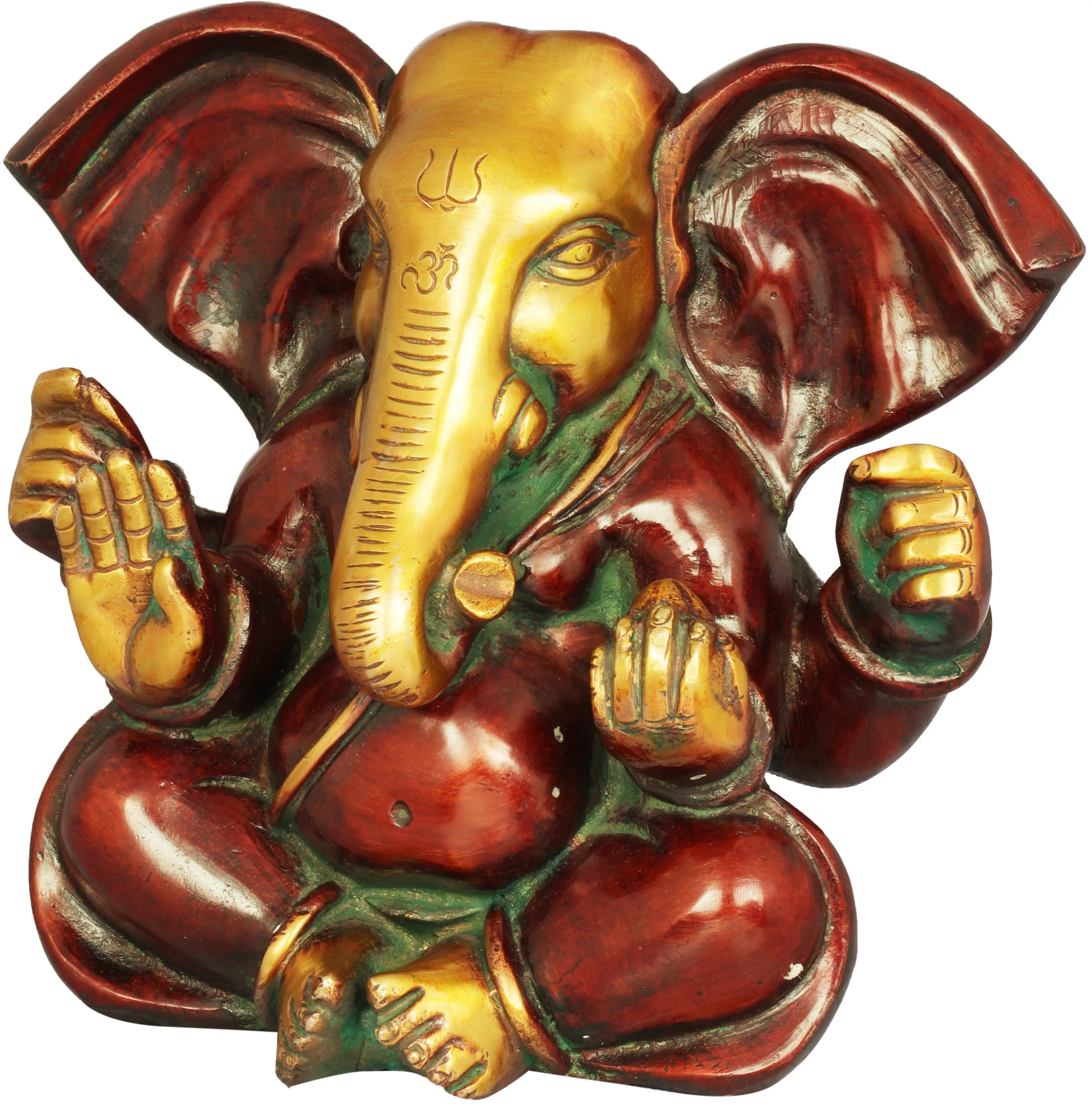 This captivating statue is cast in solid brass, a material revered for its durability and spiritual significance in Hindu traditions. The lustrous brass is brought to life with a striking combination of traditional gold and rich emerald green patinas, highlighting the divine form of the deity. Lord Ganesha's large, expressive ears, a prominent feature of this rendition, symbolize his ability to listen attentively to the prayers of his devotees. His gentle gaze and serene posture exude an aura of tranquility and divine grace. The subtle etchings on his trunk and the auspicious "Om" symbol on his forehead further enhance the spiritual resonance of this handcrafted masterpiece. Each detail, from the shape of his hands to the curve of his form, speaks to the artistry and devotion invested by the skilled artisans of India.