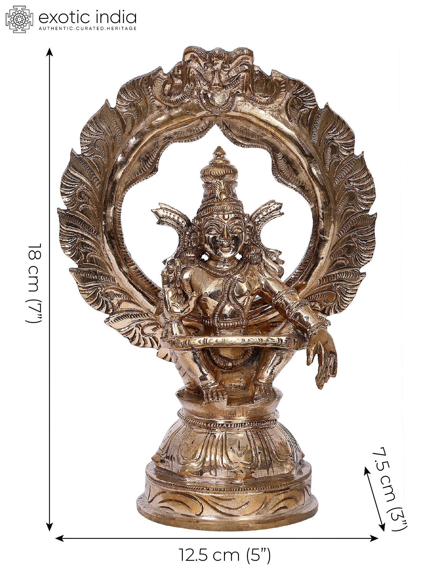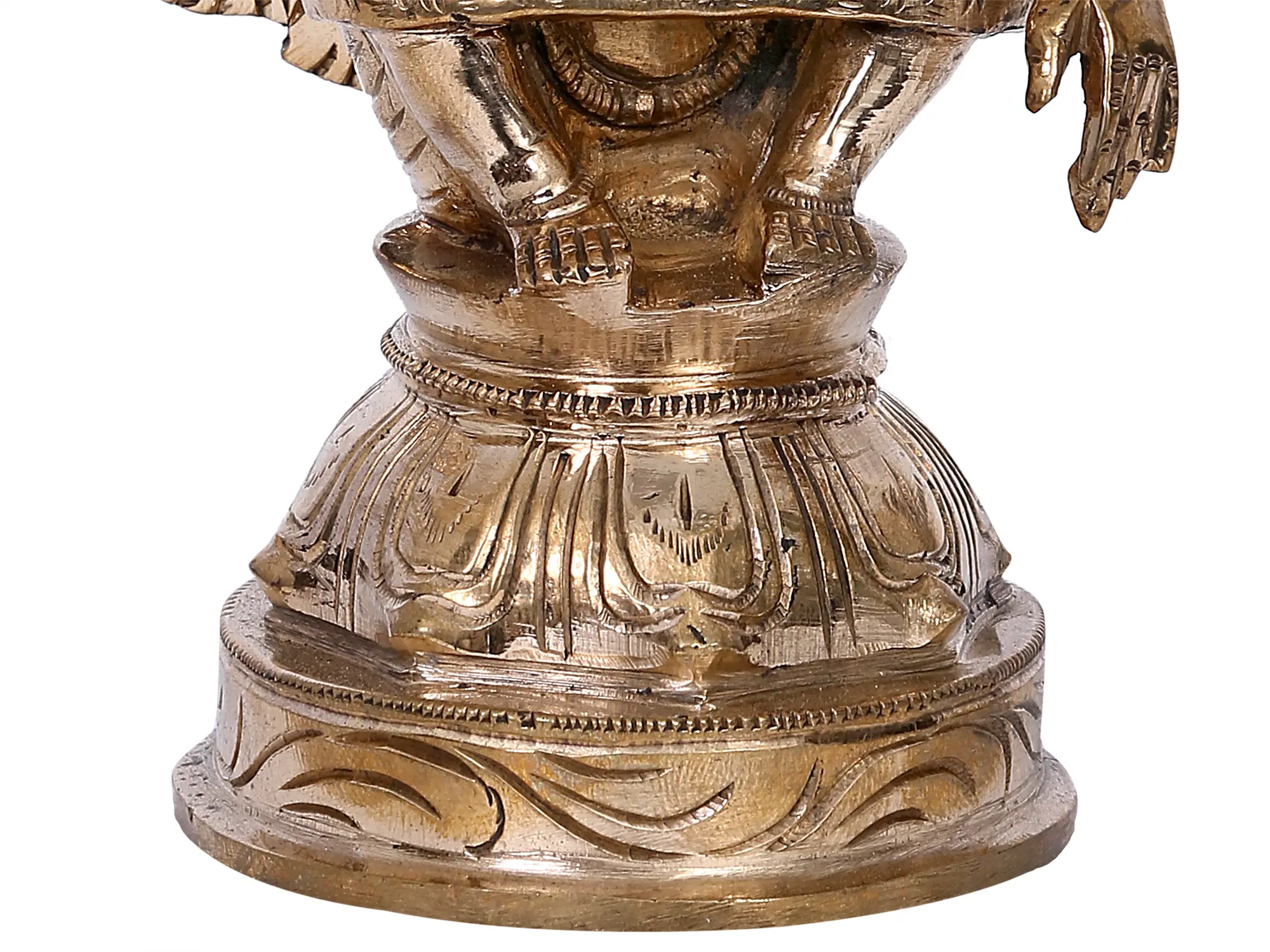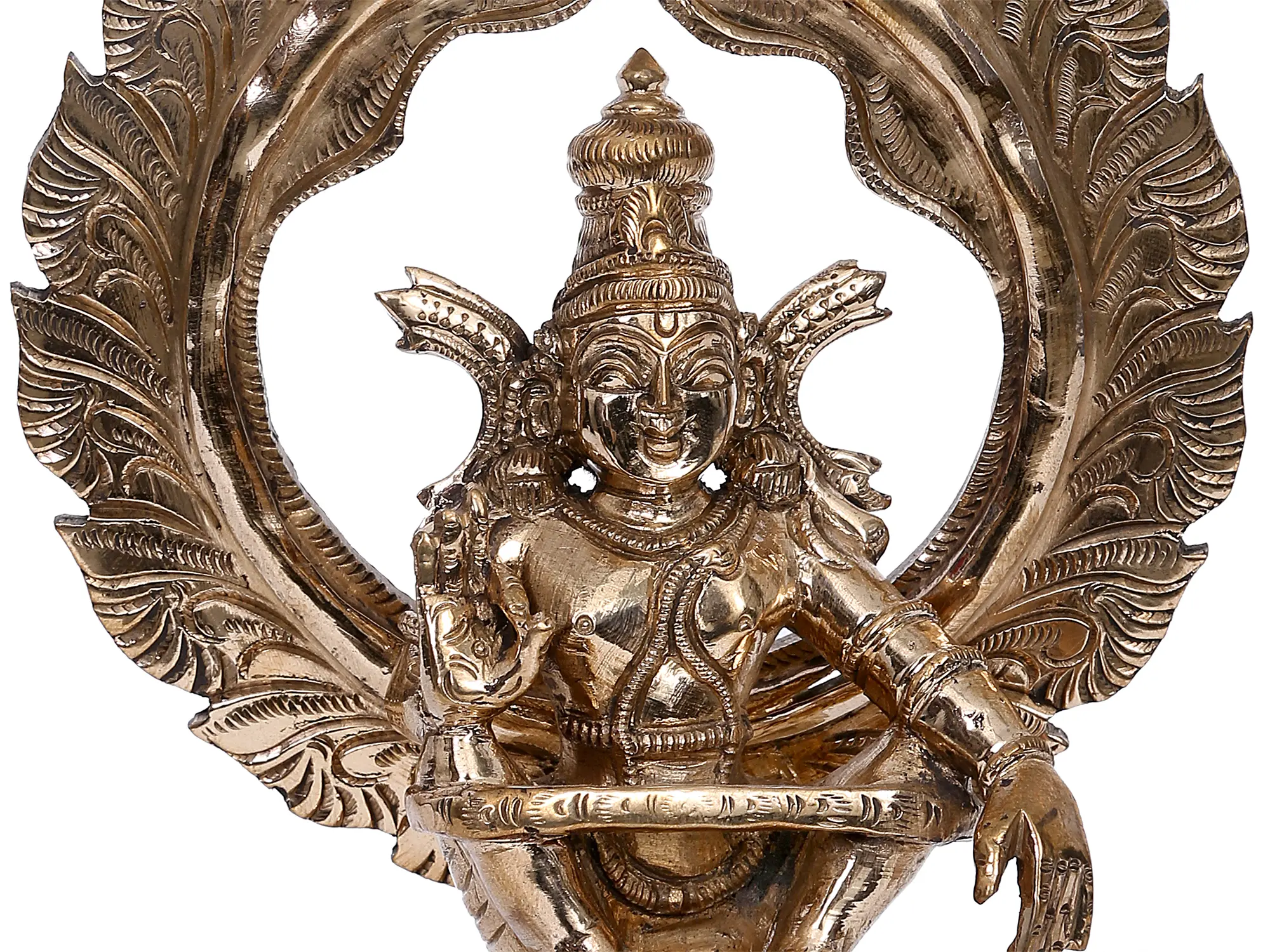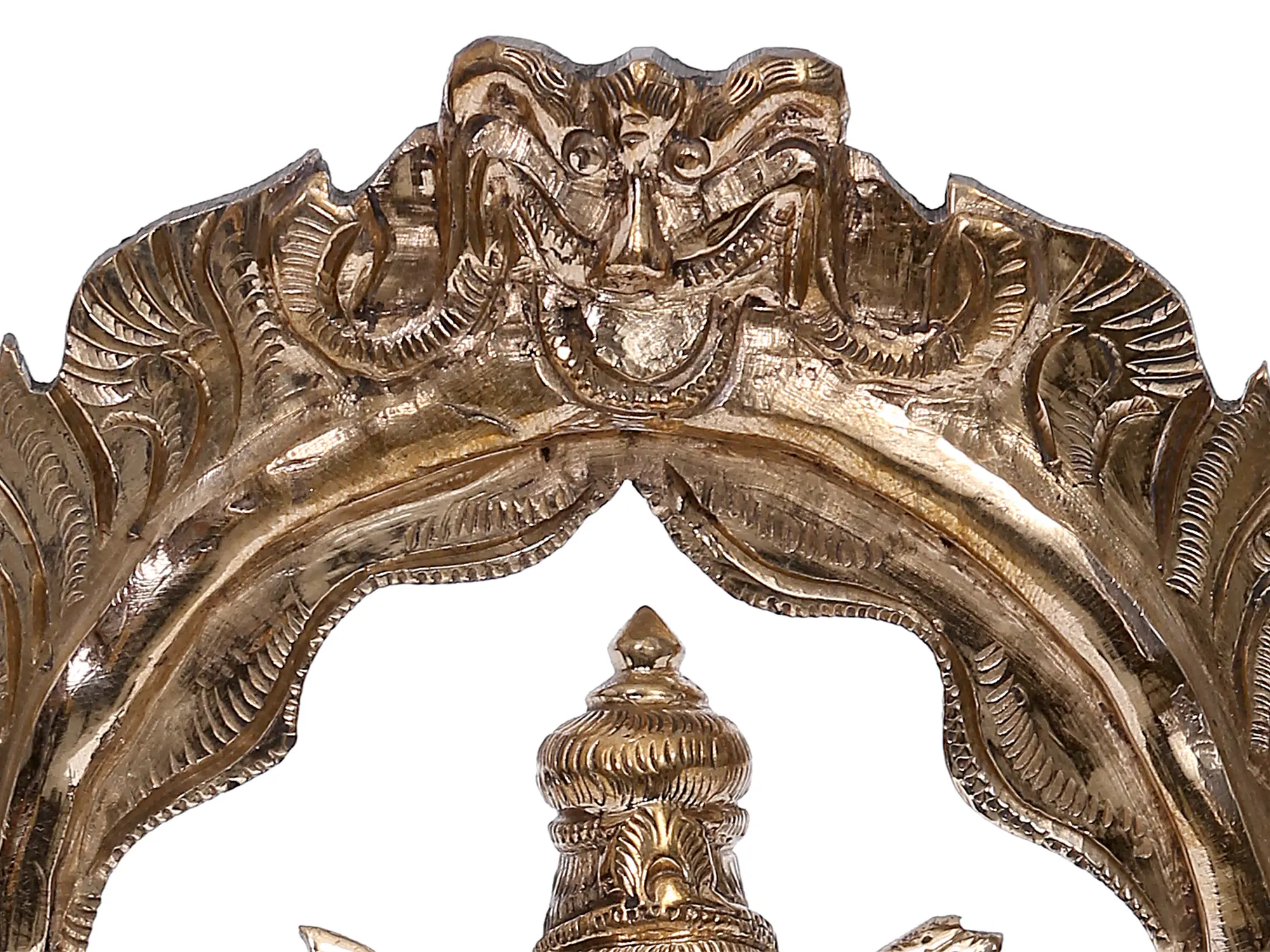 In the sacred realm of divinity, Lord Ayyapan, “the ethereal Manikandan”, graces “the Kirtimukha throne” with divine serenity. Enthroned in Yogasana, his right hand imparts wisdom in the tranquil “Vitarka Mudra”, while the left, poised in “Danda-Hasta”, exudes unwavering strength. A celestial belt encircles his legs, a celestial tether to cosmic energies. Cloaked in regal attire, Lord Manikandan embodies transcendence. Crafted in Panchaloha bronze from “Swamimalai” using the ancient “Madhuchista Vidhana (Lost-Wax) technique”, this masterpiece is a hymn frozen in time, resonating cosmic truths. Symbolising the convergence of wisdom, strength, and cosmic connection, it beckons the seeker to journey within, unravelling the enigma of existence through the meditative gaze of the divine Manikandan.