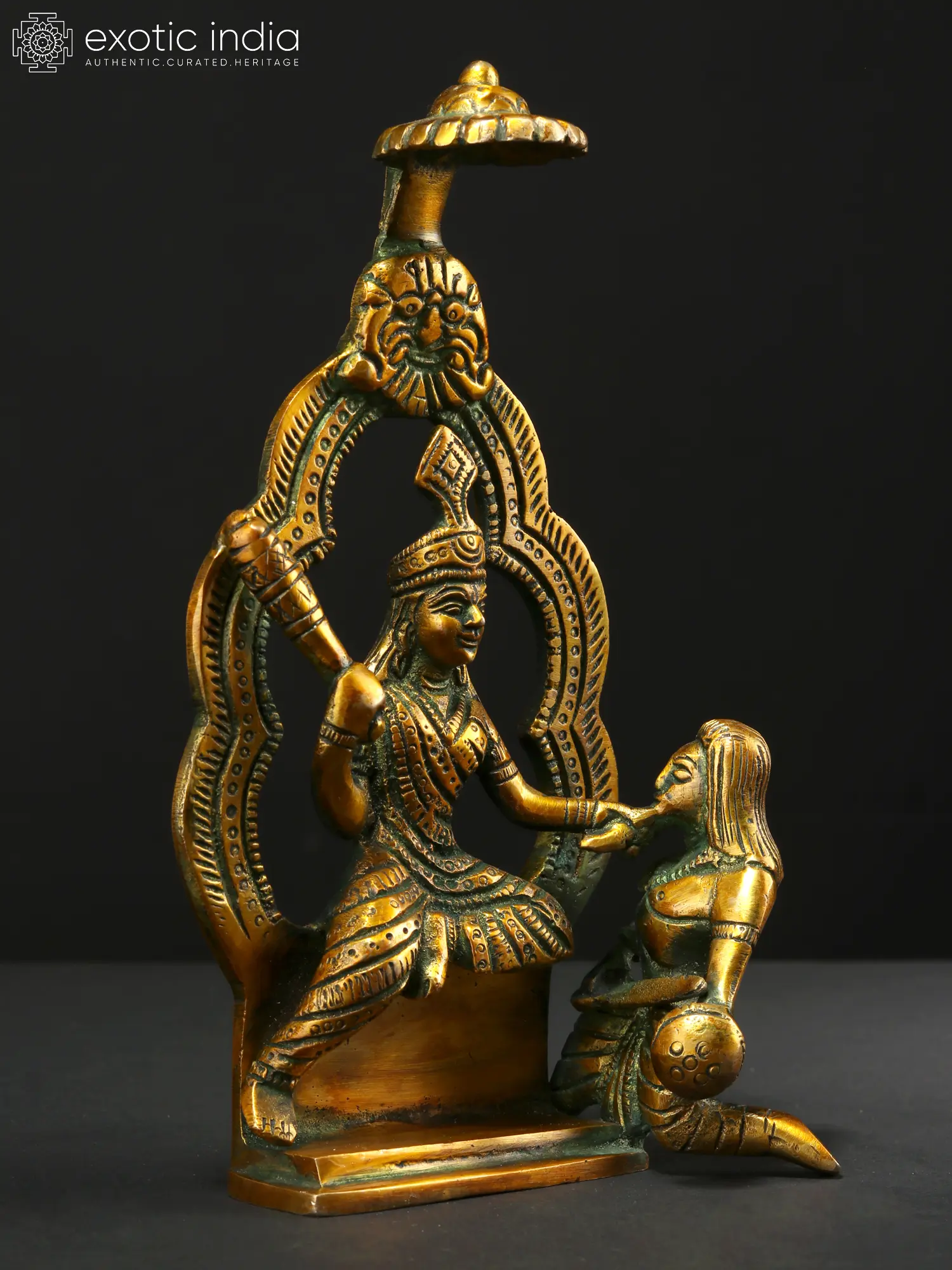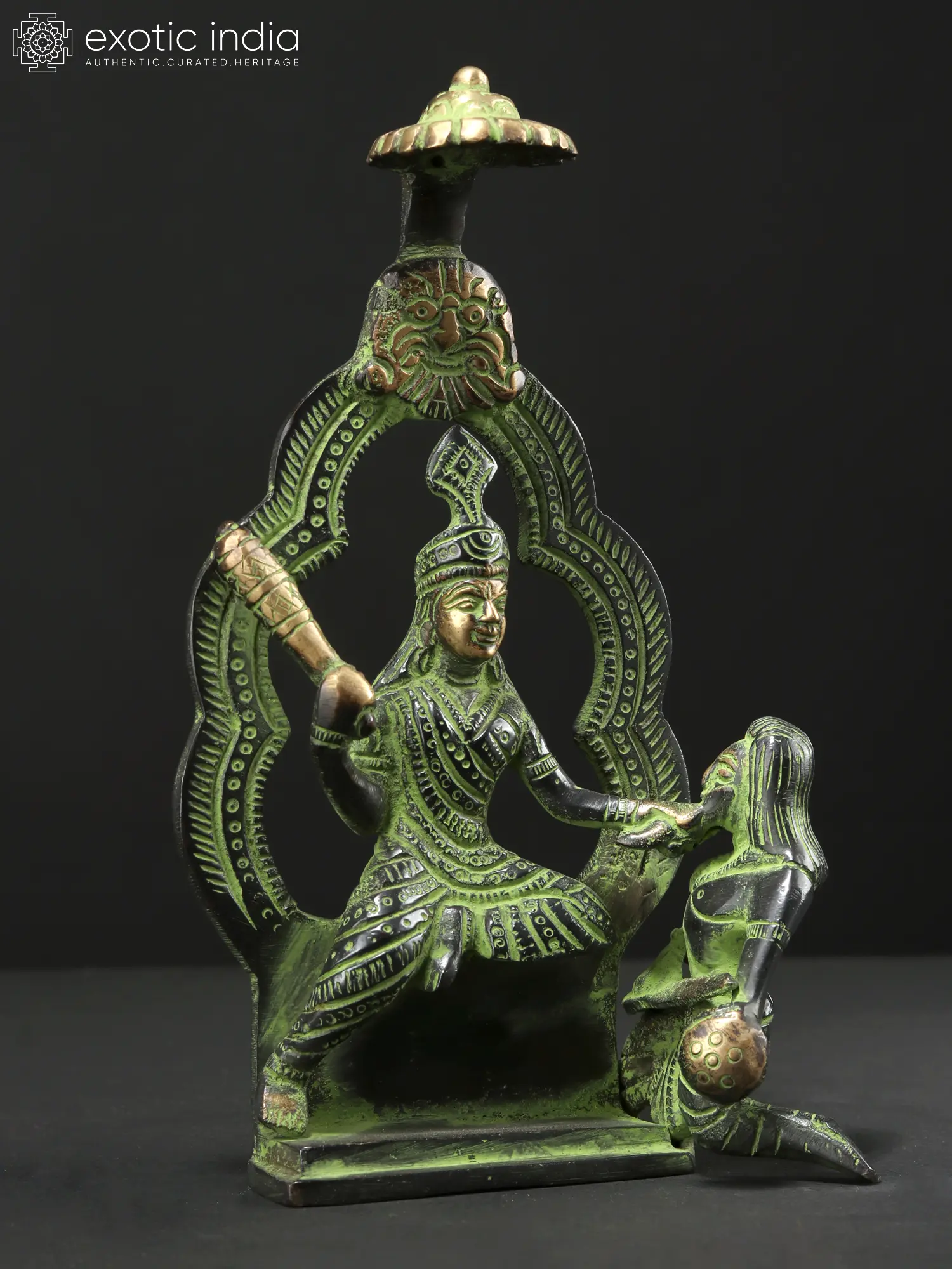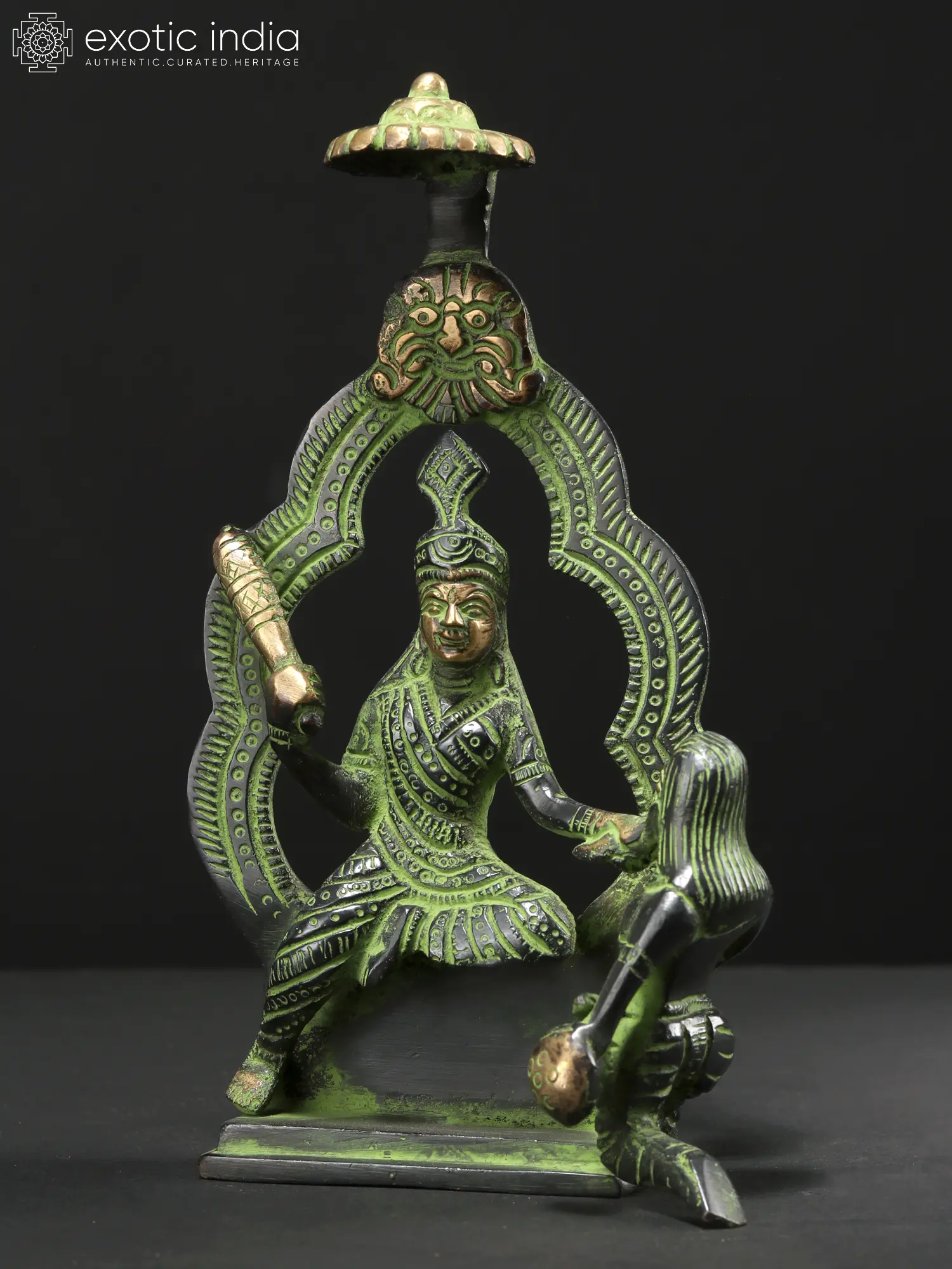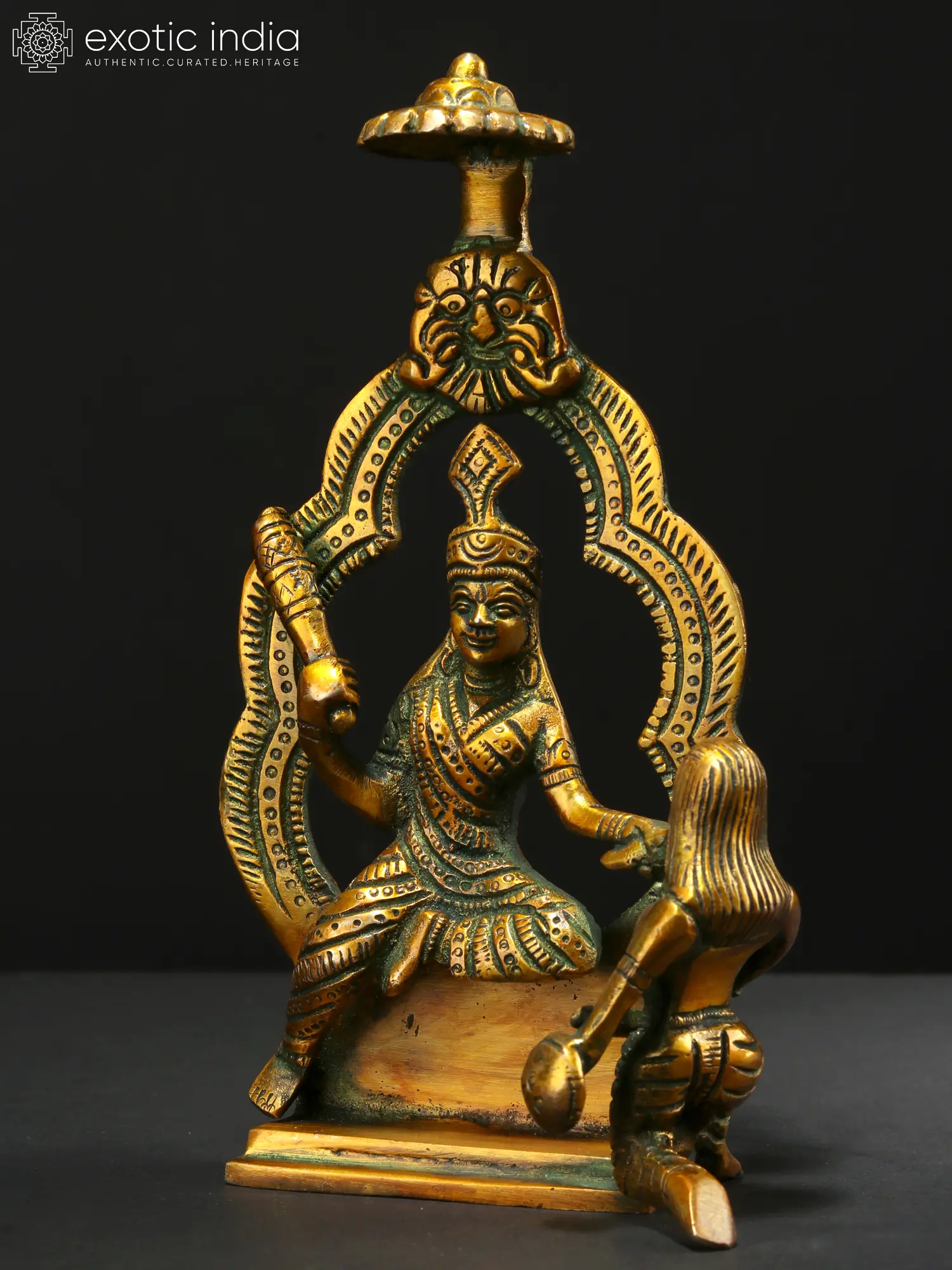 Here she stands under a Kirtimukha Prabhavali with a small chatri. Its presence in homes or temples is thought to create a shield of positivity, promoting harmony and dispelling negativity, thereby fostering a serene environment conducive to spiritual growth and well-being.